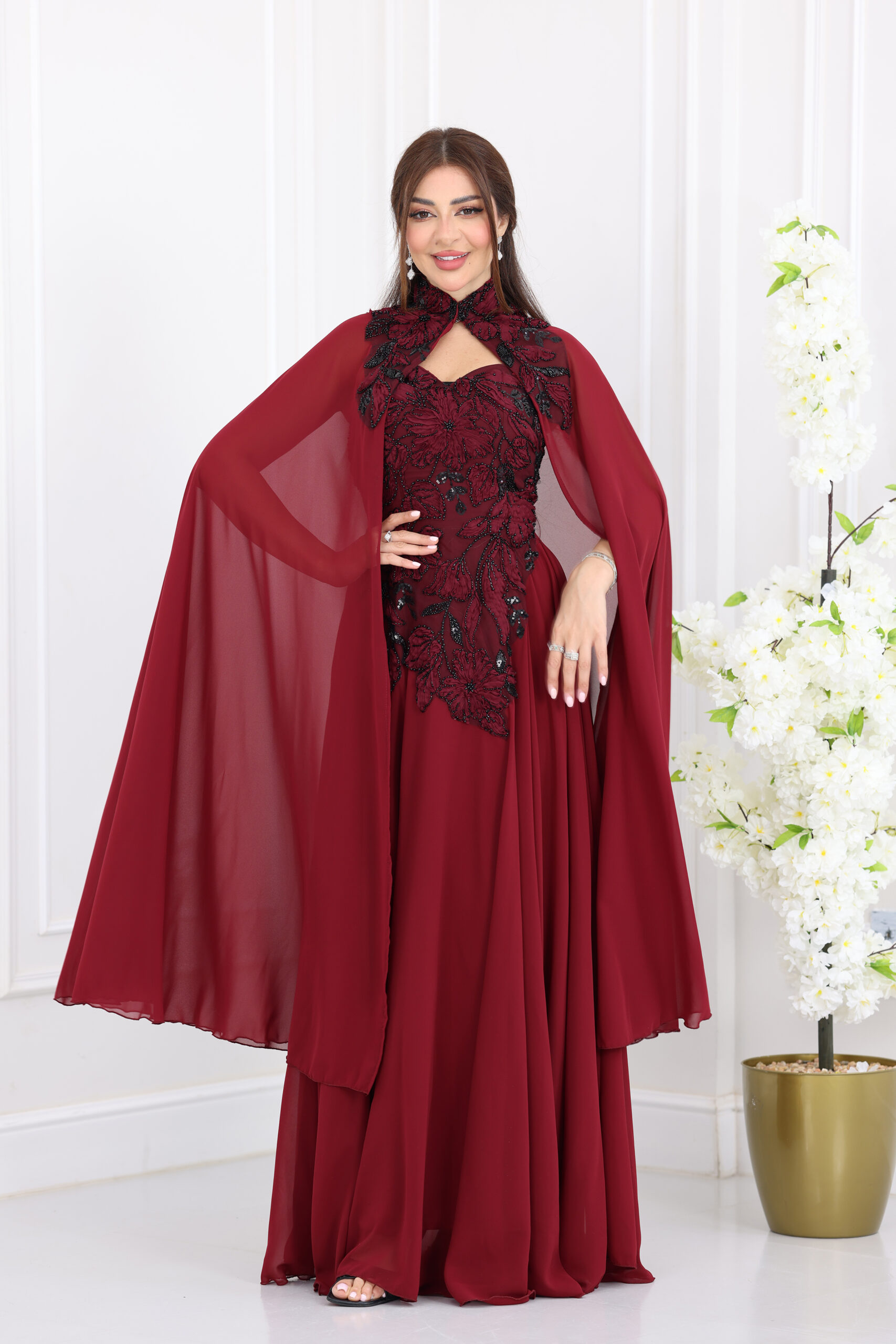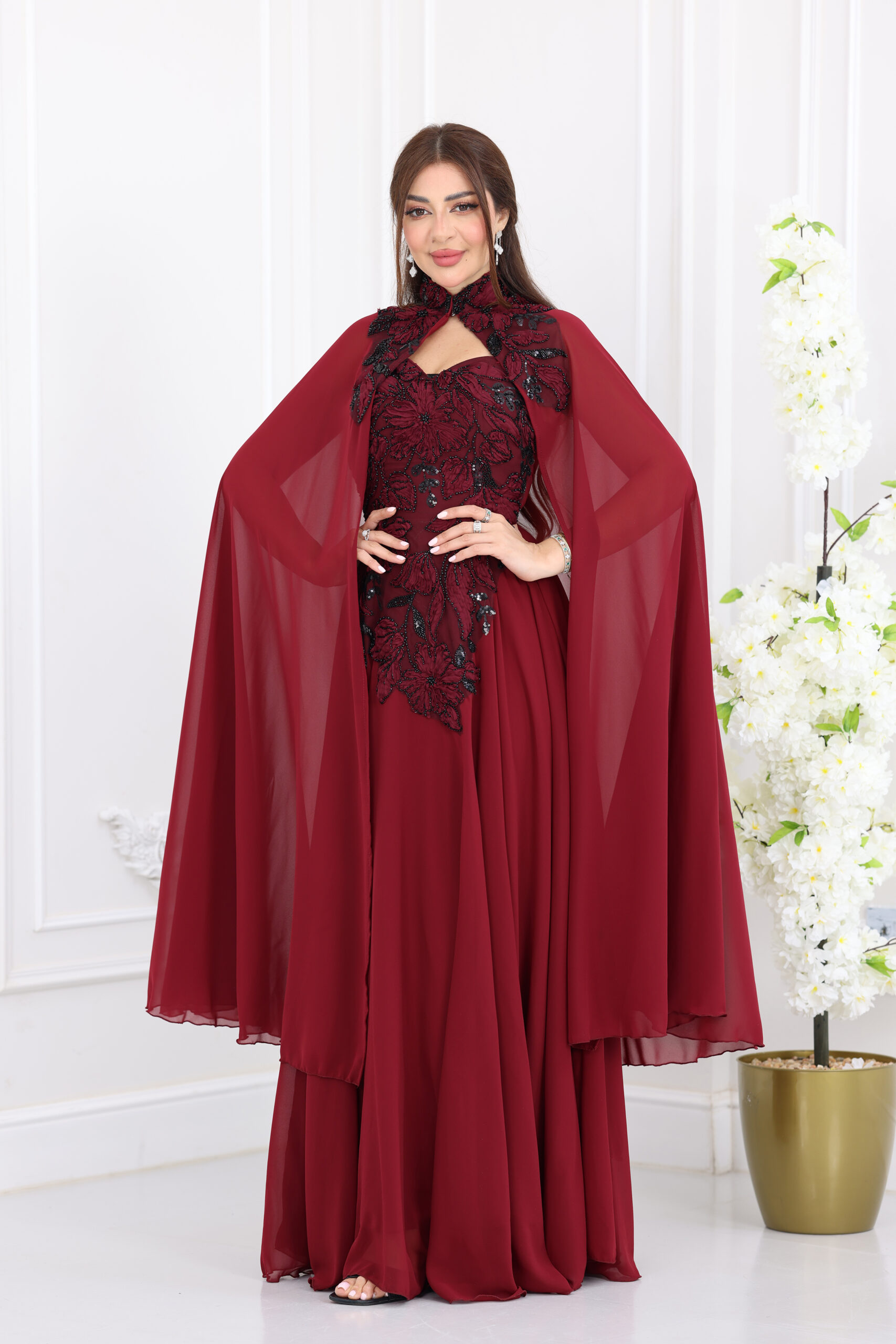 - تصميم كيب (Cape) ملكي متصل يغطي الأكتاف والظهر للفخامة.
