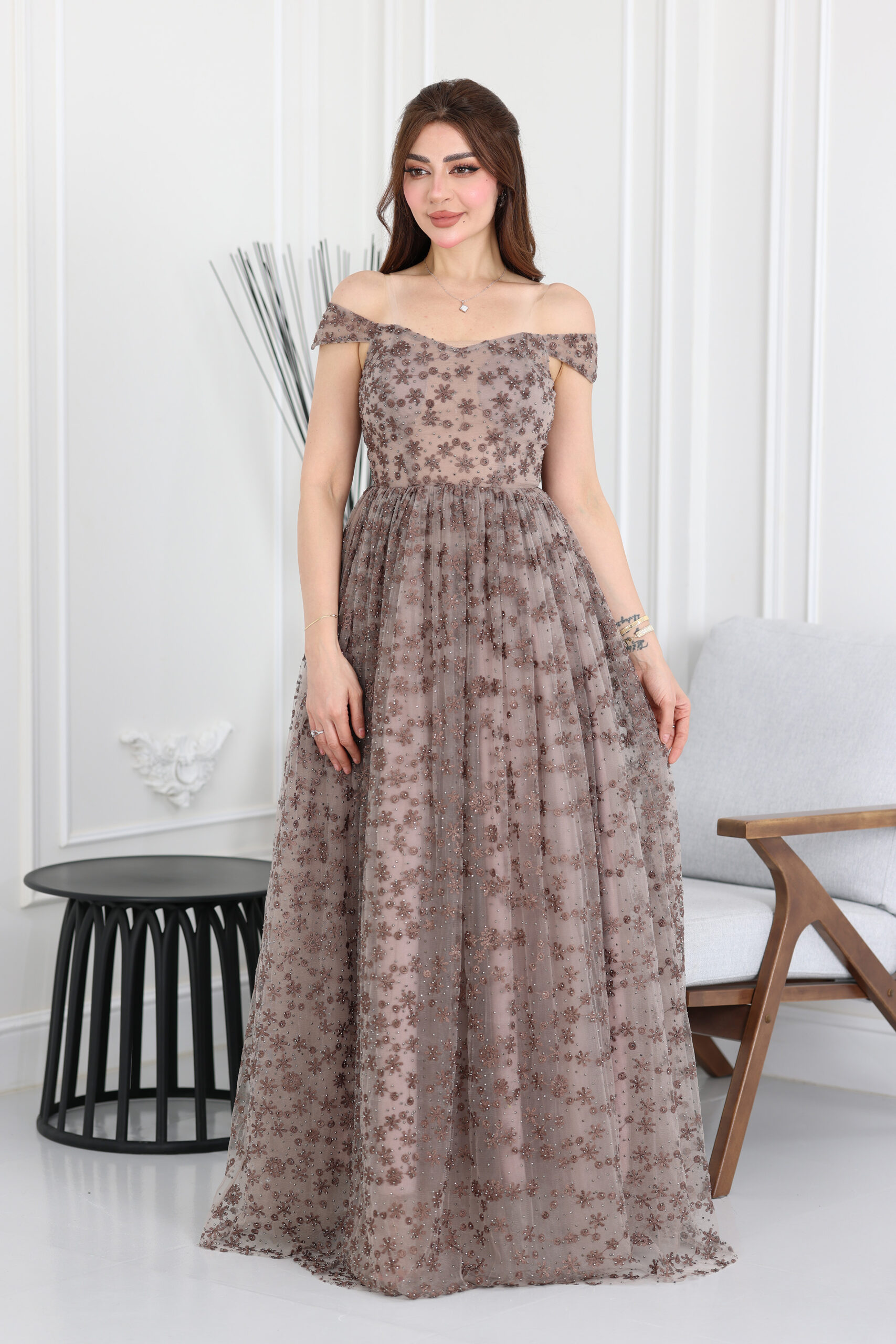 فستان سهرة فخم مطرز كتف المصمم خصيصاً ليمنحك حضوراً ملكياً في أرقى المناسبات. يتميز هذا الفستان بتصميمه الأنثوي الساحر بقصة “أوف شولدر” العصرية التي تبرز جمال الأكتاف بنعومة، مع خصر محدد ينسدل بتنورة واسعة تمنحك فخامة ورقي في كل خطوة ما يميز هذا الموديل هو التفاصيل الدقيقة من الشك والتطريز الغني على شكل زهور متناثرة تغطي كامل الفستان، مما يجعله خياراً مثالياً للباحثات عن فساتين مناسبات وفساتين خطوبة تجمع بين الأناقة العصرية والكلاسيكية. تم اختيار الخامات بعناية لتوفير الراحة والانسيابية، ليناسب حفلات الزفاف والسهرات الكبرى. إذا كنتِ تبحثين عن التميز والاختلاف، فهذا التصميم هو بوابتك لتكوني نجمة الحفل. اطلبيه الآن واحصلي على أجمل فساتين السهرة التي تليق بذوقك الرقي