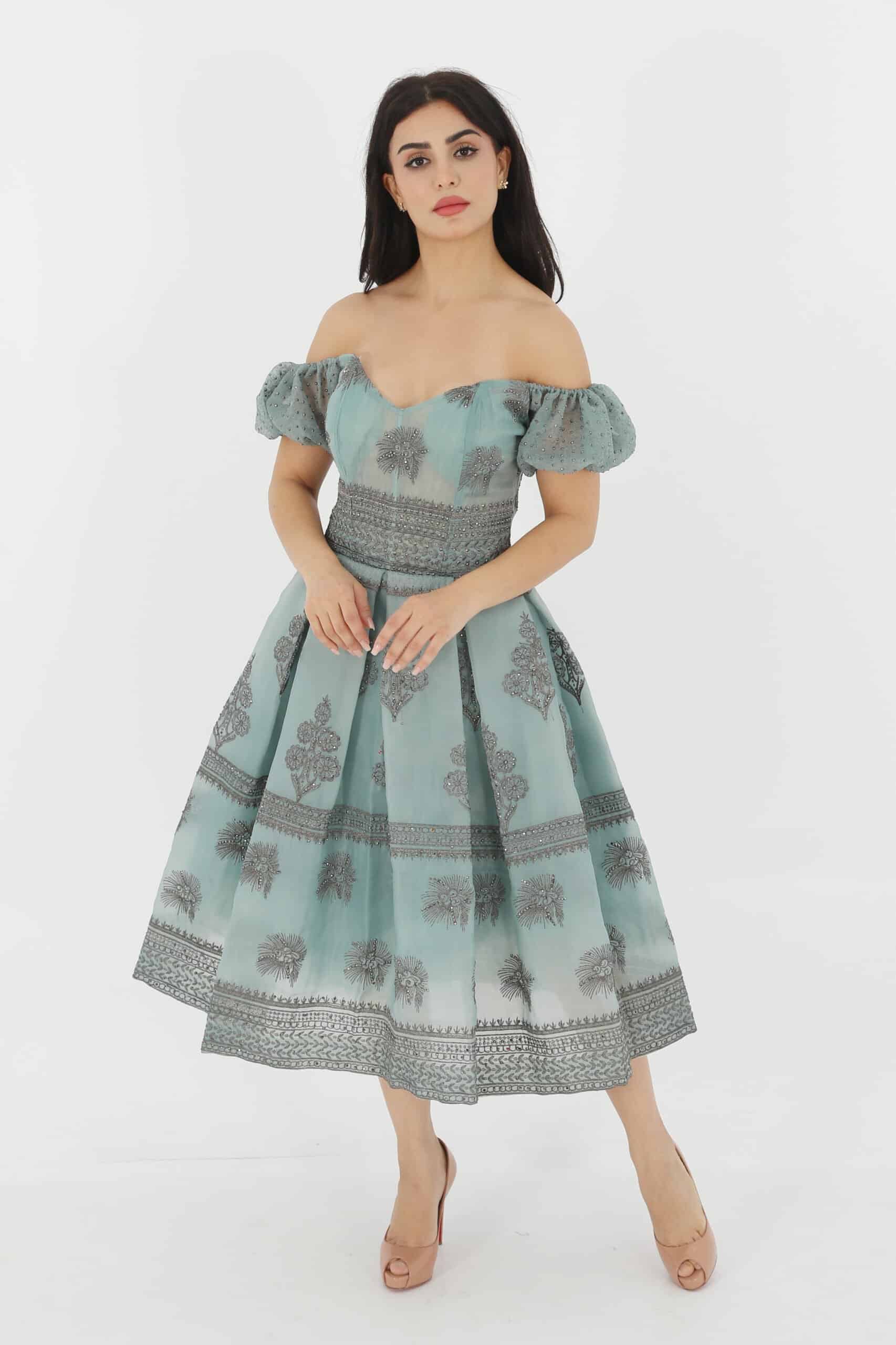 التفاصيل:  يتميز الفستان سهرة ميدي بأكمام بوف وتفاصيل الخيط القصب الفاخر يعطي إطلالة رائعة وأنيقة، وتضيف لمسة من الجمال والتفرد على الفستان، سواء كانت على الصدر أو الخصر