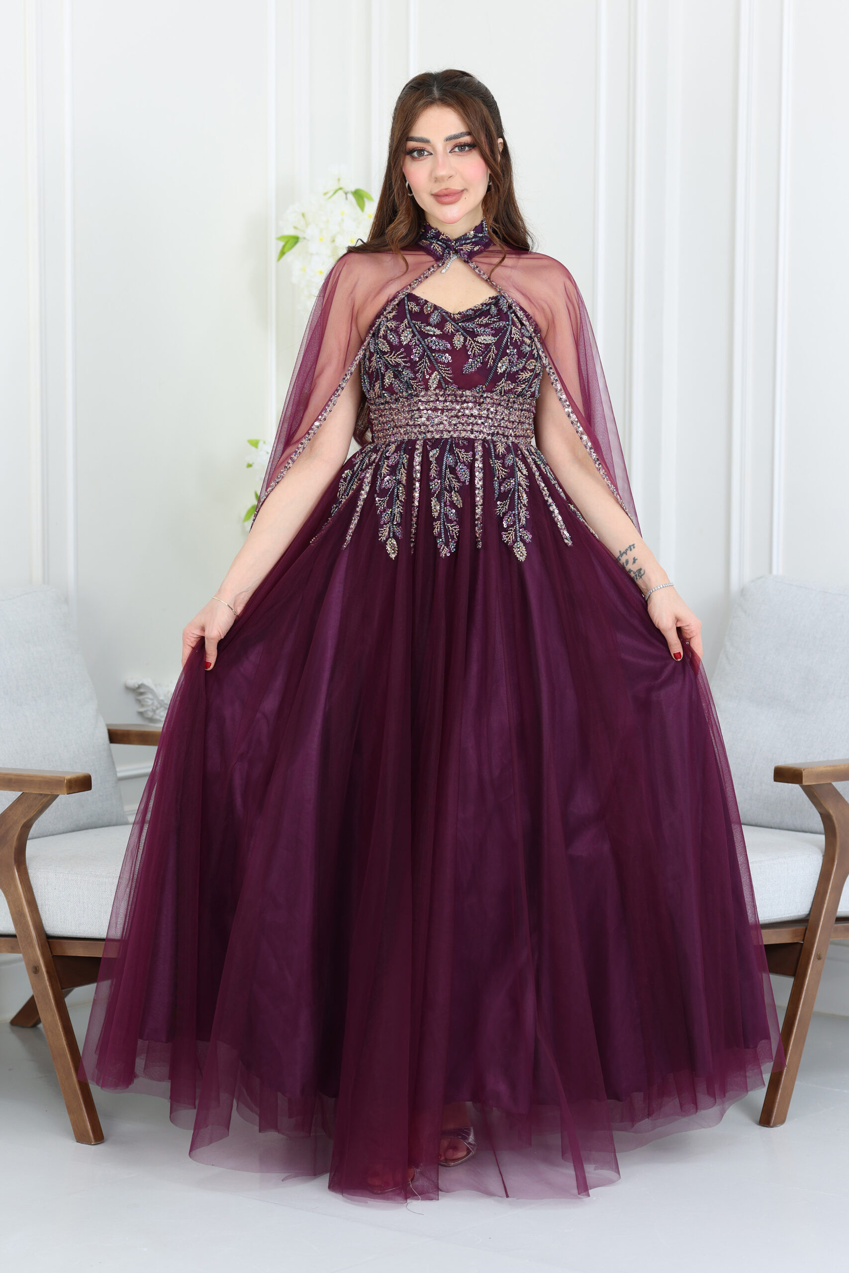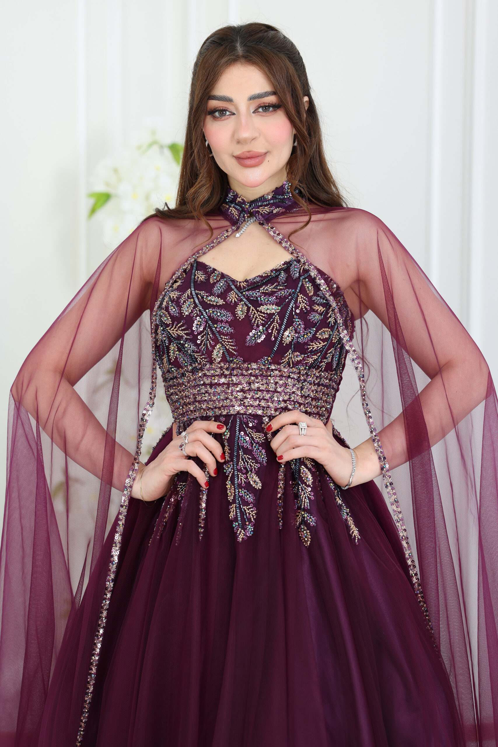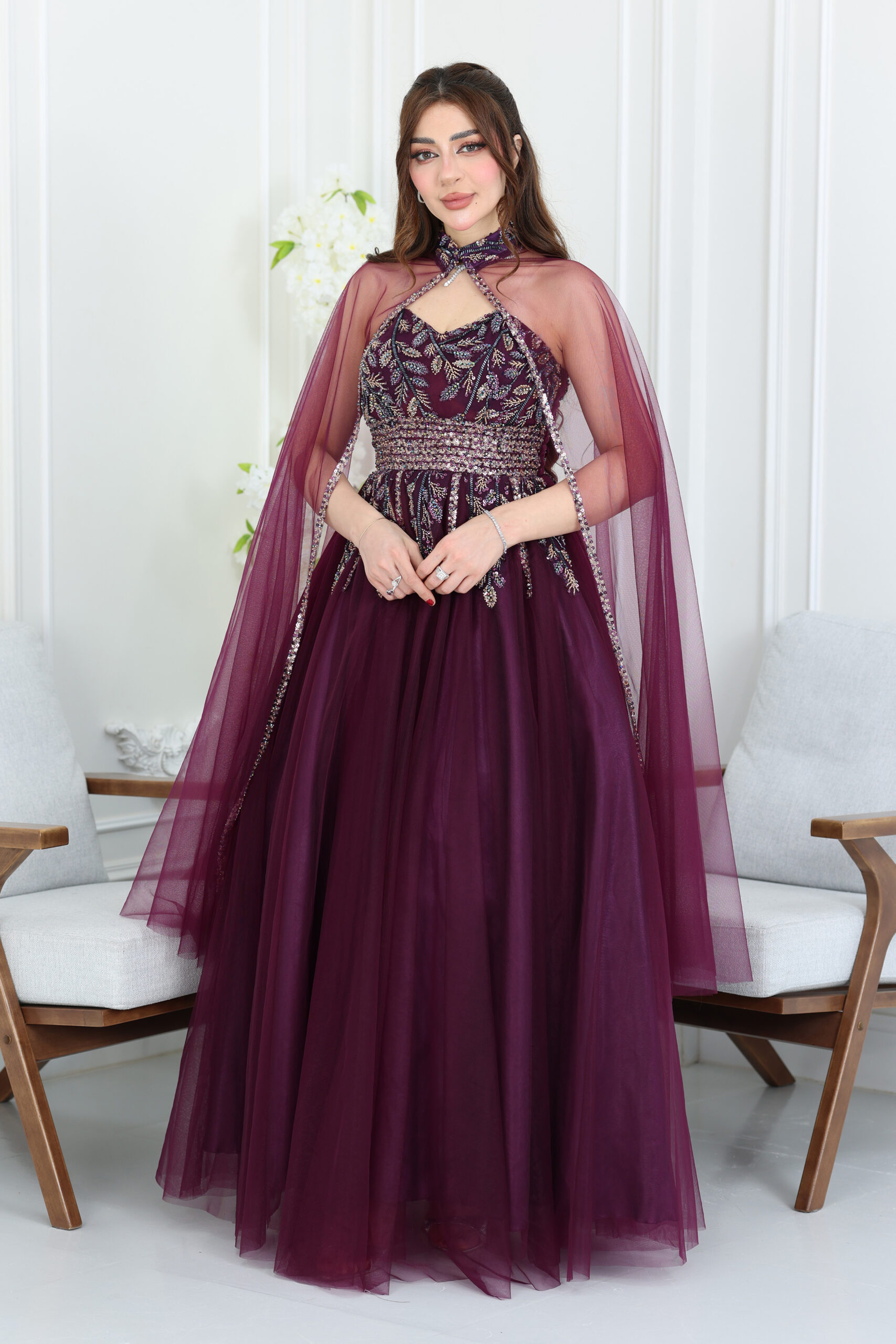 فستان سهرة كاب مطرز بتصميم يجمع بين الرقي والفخامة الباهرة. أبرز ما يميزه هو الكاب الفاخر المنسدل من الأكتاف، اللي يمنحك تغطية راقية وحركة ملكية ساحرة. الجزء العلوي  مُطرز بالكامل بشك يدوي وخيوط براقة بتصميم هندسي متقن، وهذا الشغل الدقيق يزيد من الجاذبية والفخامة .الفستان طويل وبقصة صدر أنيقة، وتنورته واسعة من طبقات التل الفاخر، وهذا يعطيه حجم جميل ومريح في الحركة. هذا الموديل الراقي يجعلكِ تتألقين ويبرز جمال القوام.