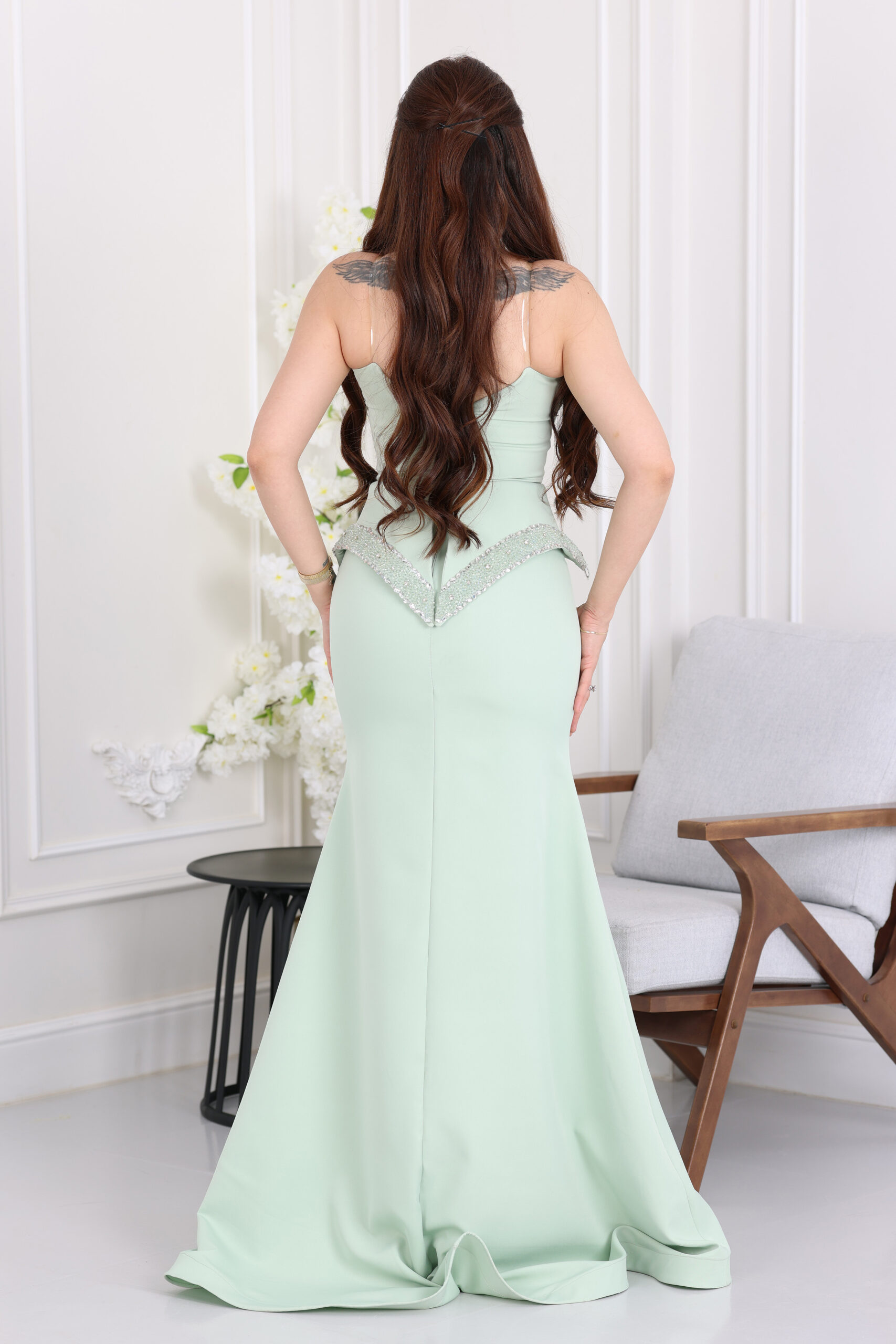 التخزين السليم: قومي بتخزين الفستان في مكان جاف ومنعزل عن الرطوبة للحفاظ على جمال الكريستالات والإكسسوارات.
