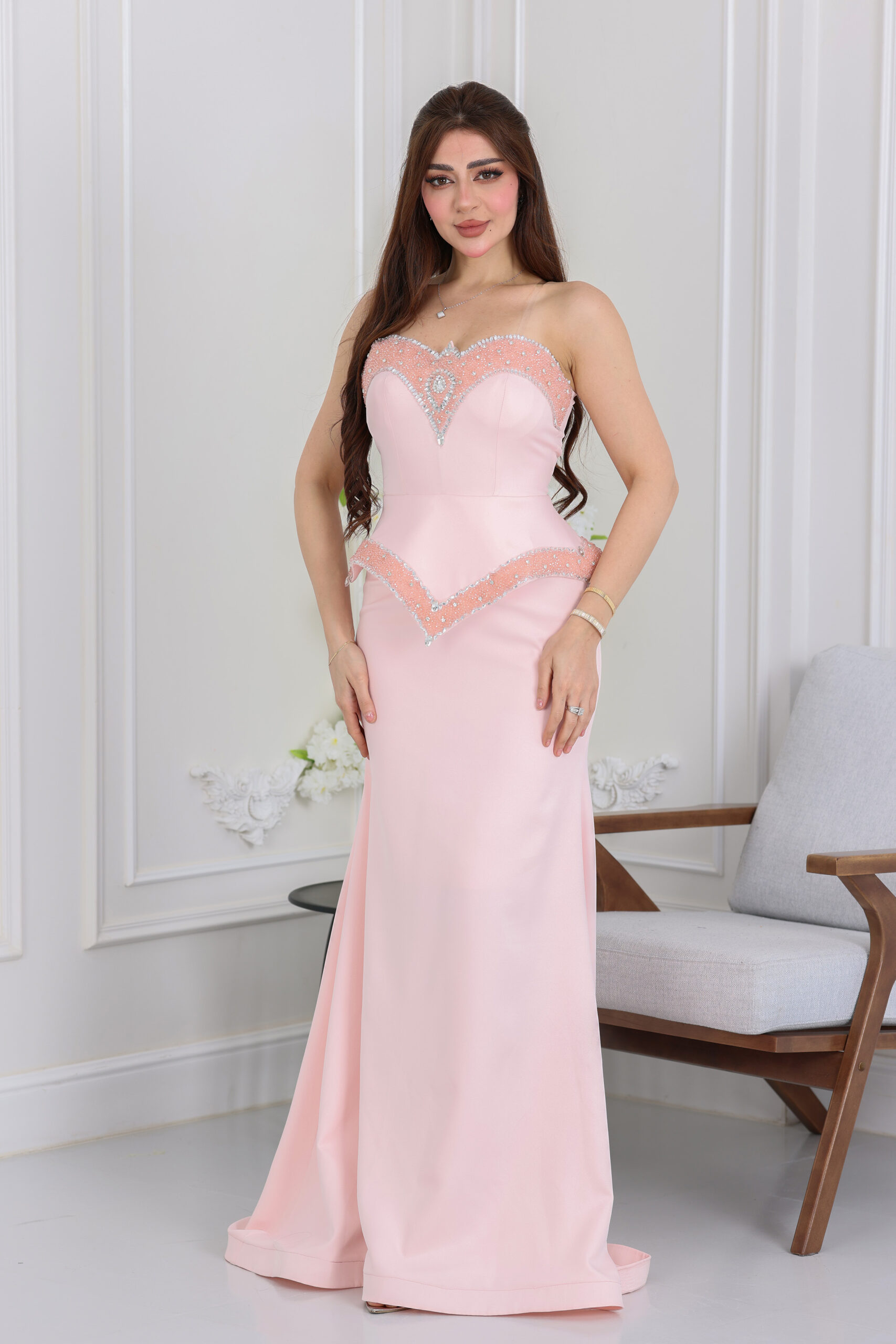 ما يميز القطعة هو الشك والتطريز الكريستالي الفاخر الذي يزين كامل الصدر وتفاصيل الخصر بلمعة ساحرة تغنيكِ عن الإكسسوارات الكثيرة. ينسدل الفستان بنعومة وانسيابية تامة ليمنحك حضوراً طاغياً في المناسبات. سواء كنتِ تبحثين عن فساتين خطوبة مميزة أو فستان لحضور زواج قريب، فهذا الموديل هو خيارك الأمثل لدمجه بين الفخامة الكلاسيكية وصيحات الموضة العصرية. اطلبيه الآن وكوني الأجمل في مناسبتك.