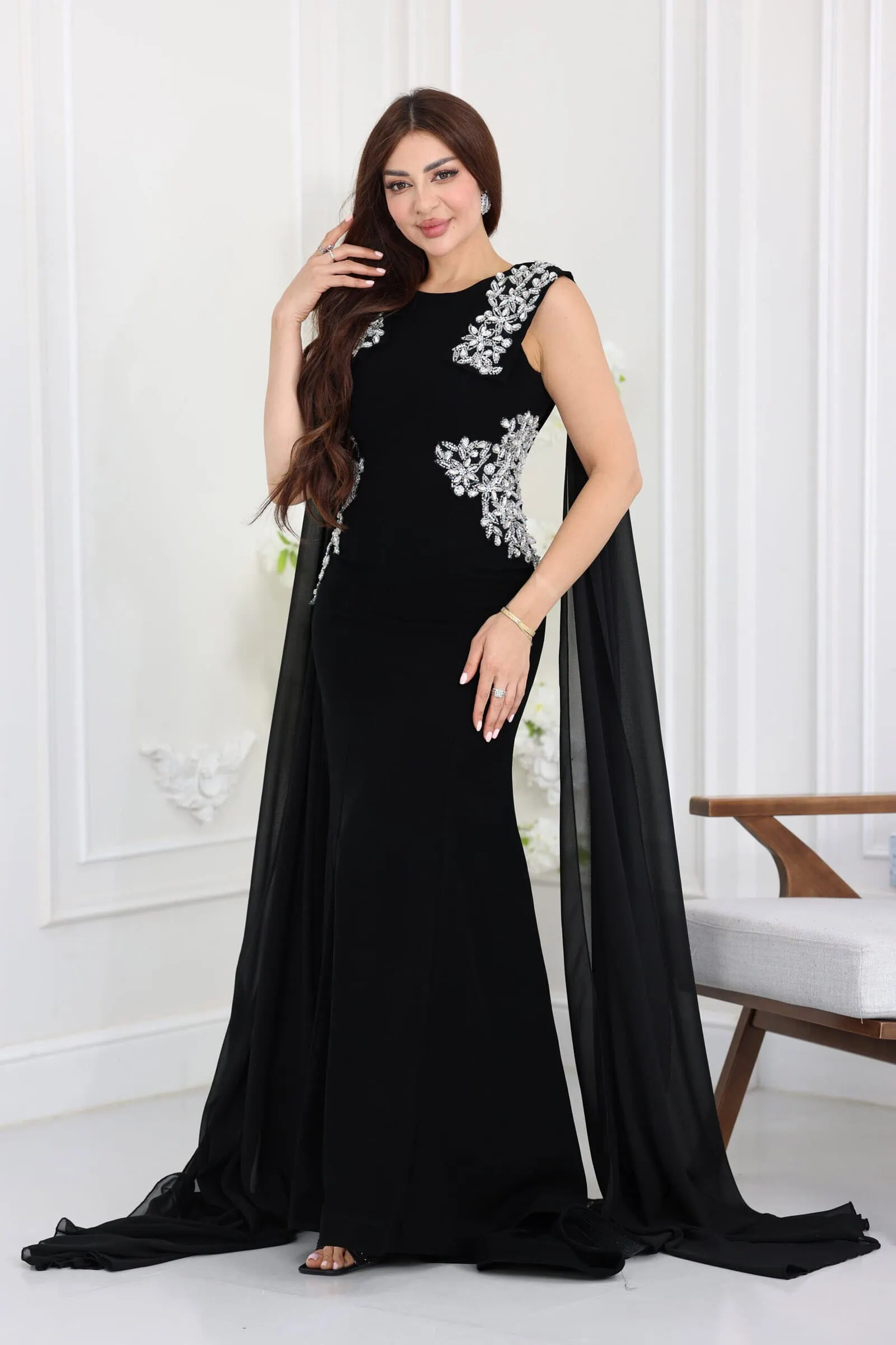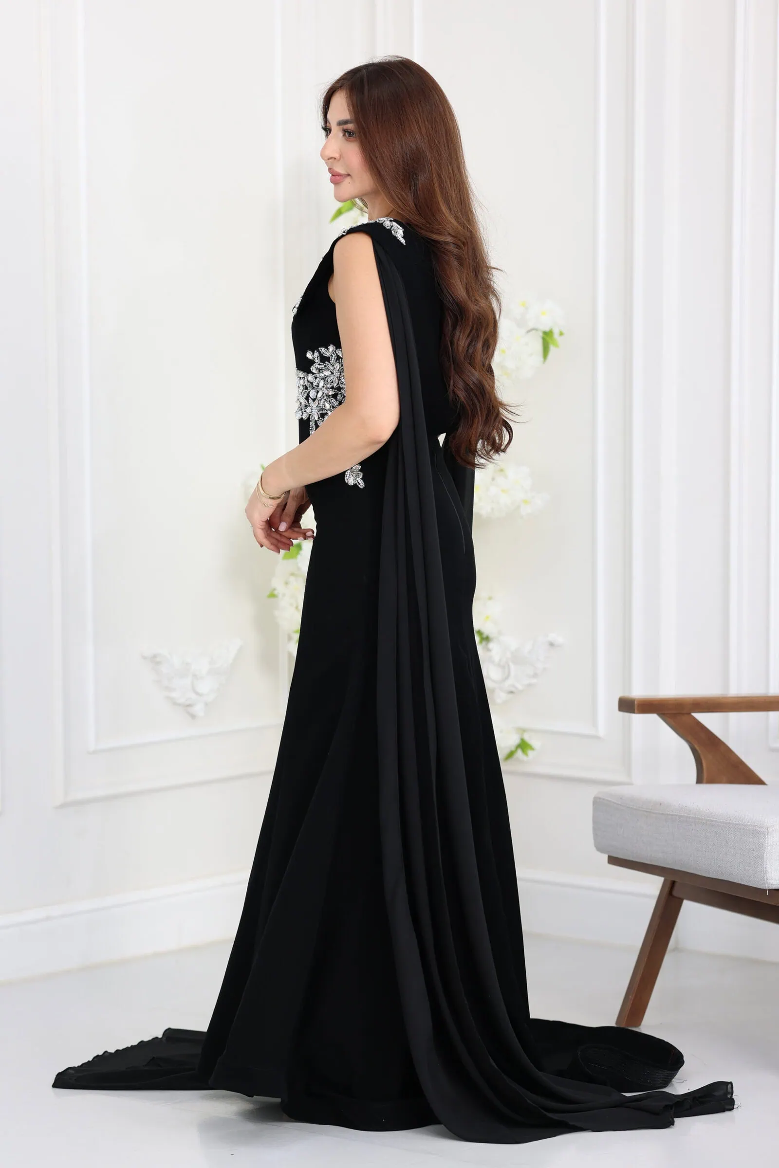 يتميز الفستان بقصة انسيابية تنحت القوام برقي، مع ياقة دائرية ناعمة تمنحكِ مظهراً ساتراً وأنيقاً. ما يجعل هذا الموديل قطعة فنية هو “الكيب” (Cape) الطويل المنسدل من الأكتاف ليعطي طابعاً ملكياً ودرامياً مع كل حركة، بالإضافة إلى الشك اليدوي الفاخر بالكريستال والأحجار اللامعة التي تتركز ببراعة على الأكتاف وتمتد على جانبي الخصر، مما يبرز رشاقة القوام ويضفي بريقاً أخاذاً تحت الأضواء.