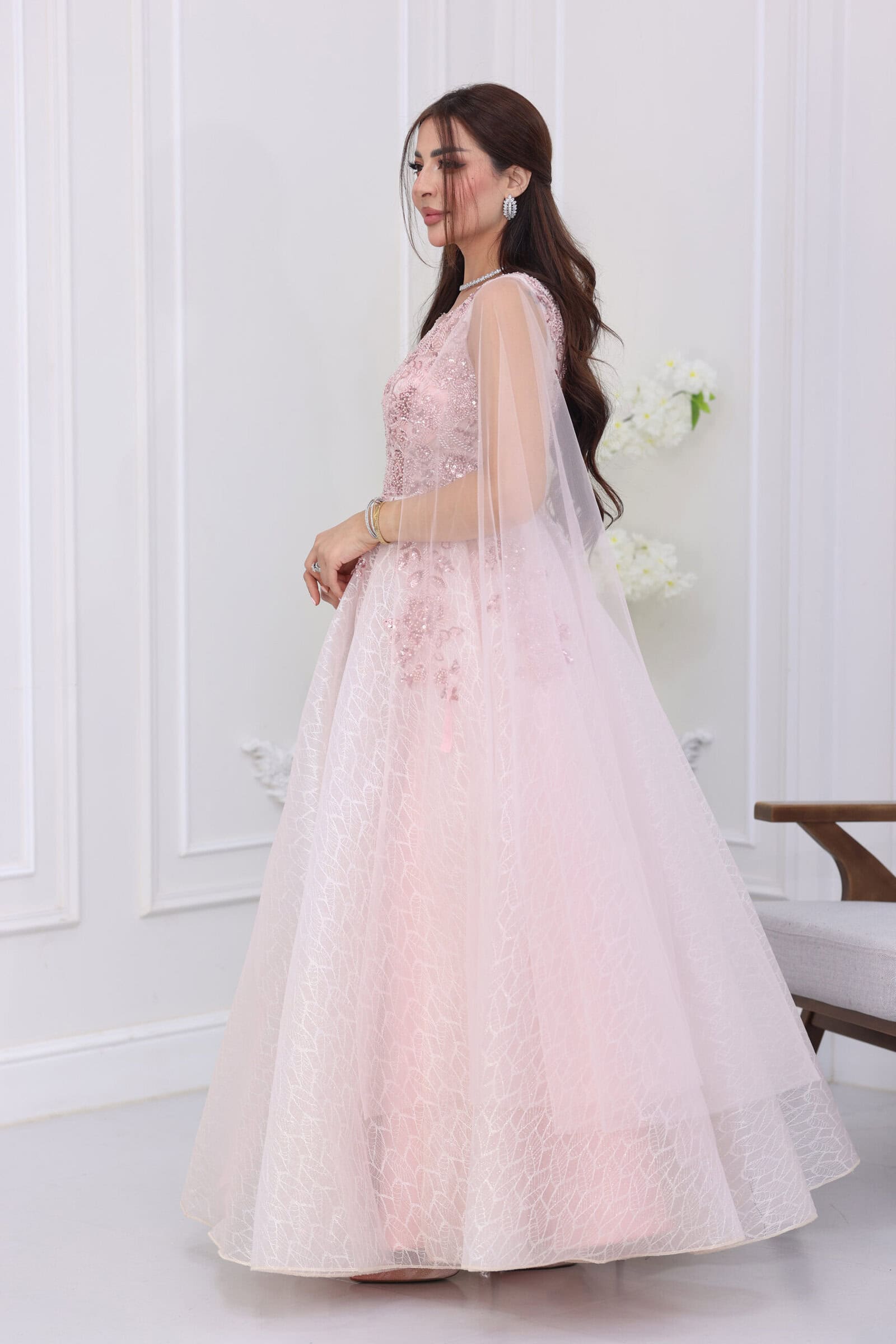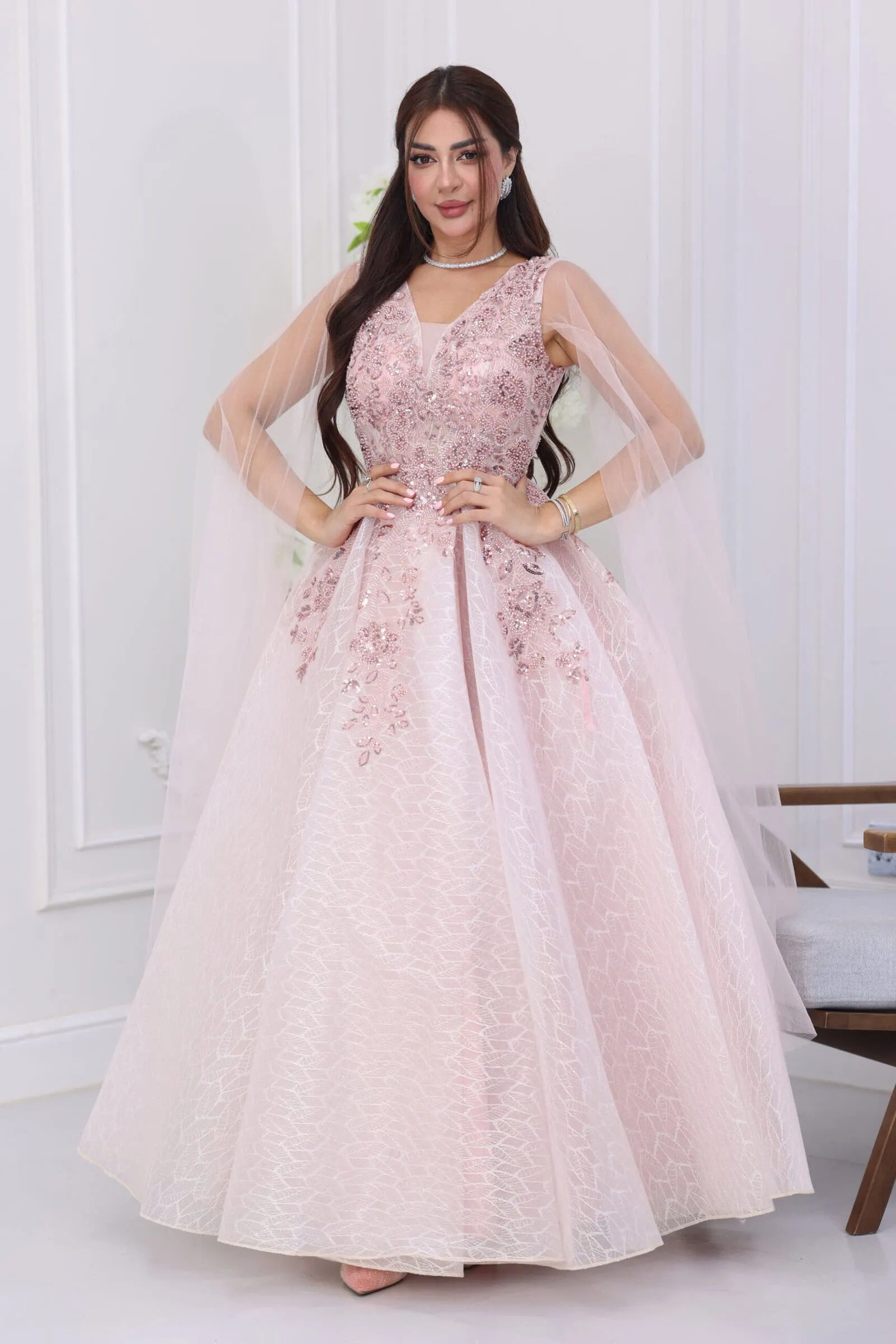 يتميز الفستان بقصة “كلوش” واسعة ومنفوشة تعطي طابعاً أنثوياً فاخراً، مع فتحة صدر أنيقة على شكل حرف V مزينة بتطريزات ترتر لامعة تتوزع باحترافية على كامل الفستان. الموديل يأتي بطول كامل (ماكسي) مع وشاح (كيب) طويل وناعم ينسدل من الأكتاف ليغطي الظهر والذراعين برقة، مما يضفي لمسة من الحشمة والفخامة في آن واحد، ويجعله مثالياً لموديلات “الأم والبنت” لطلة متناغمة ومبهرة.