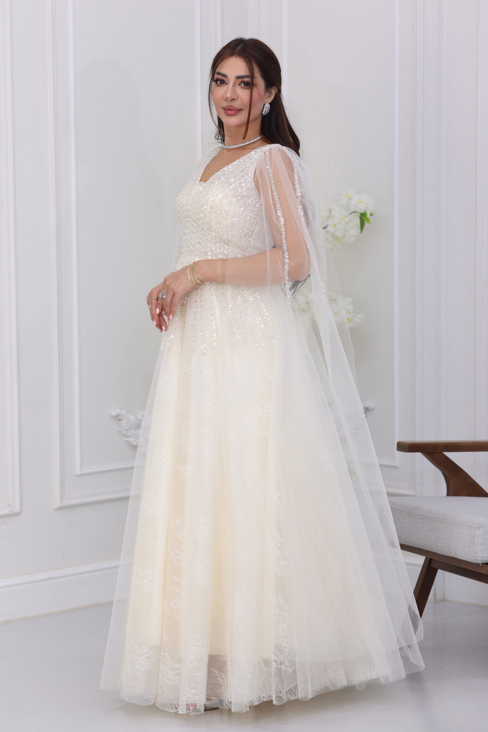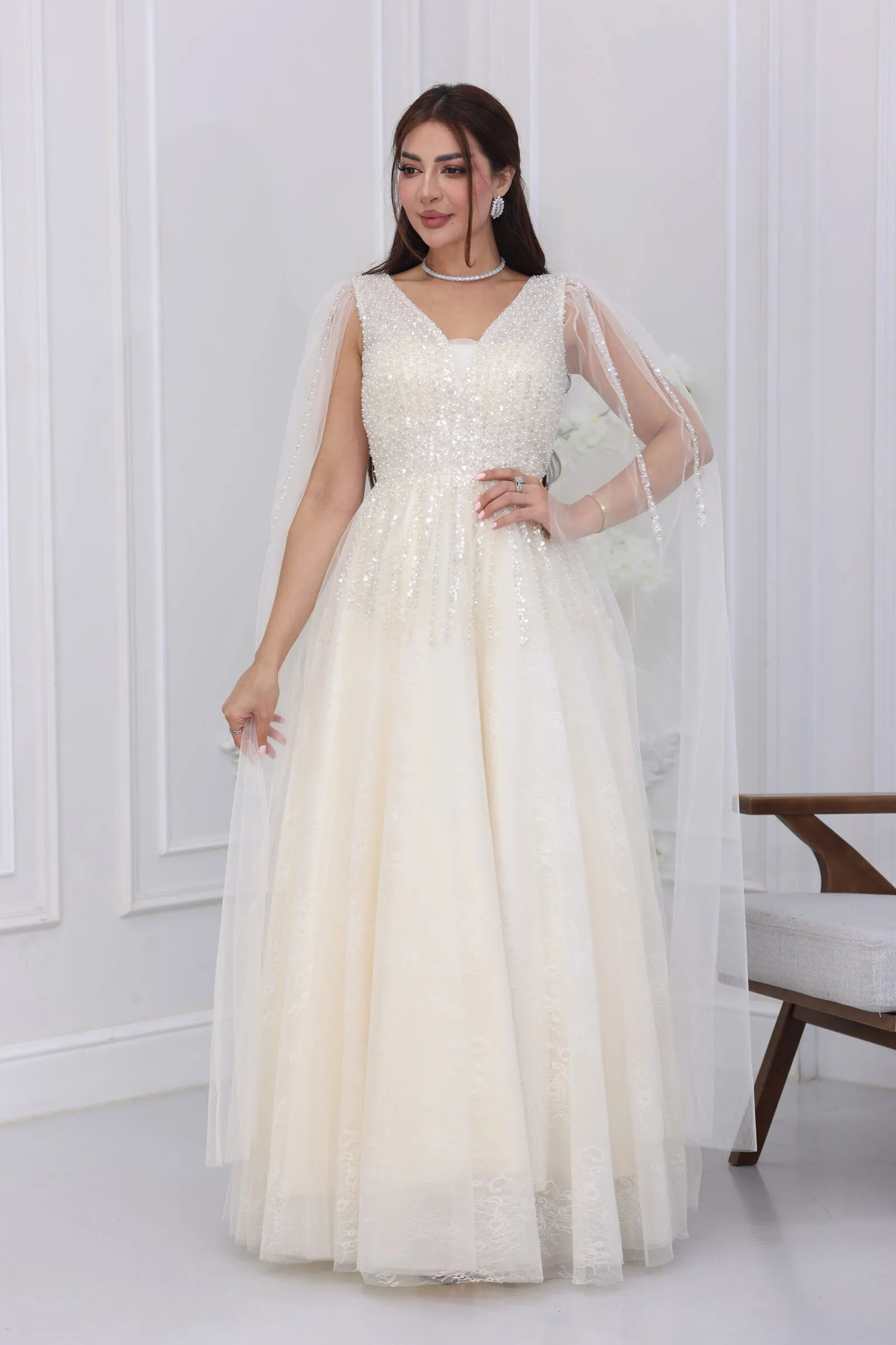 يتميز الفستان بقصة “كلوش” واسعة ومنفوشة تعطي طابعاً ملكياً، مع فتحة صدر أنيقة على شكل حرف V مزينة بشك يدوي كثيف يمتد من الأكتاف وحتى منطقة الخصر. الموديل يأتي بطول كامل (ماكسي) مع أكمام مكشوفة “كت” ينسدل منها وشاح طويل وناعم من التل المطرز، مما يضفي لمسة من الفخامة والحشمة في آن واحد، ويجعله مثالياً لموديلات “الأم والبنت” لطلة متناغمة.