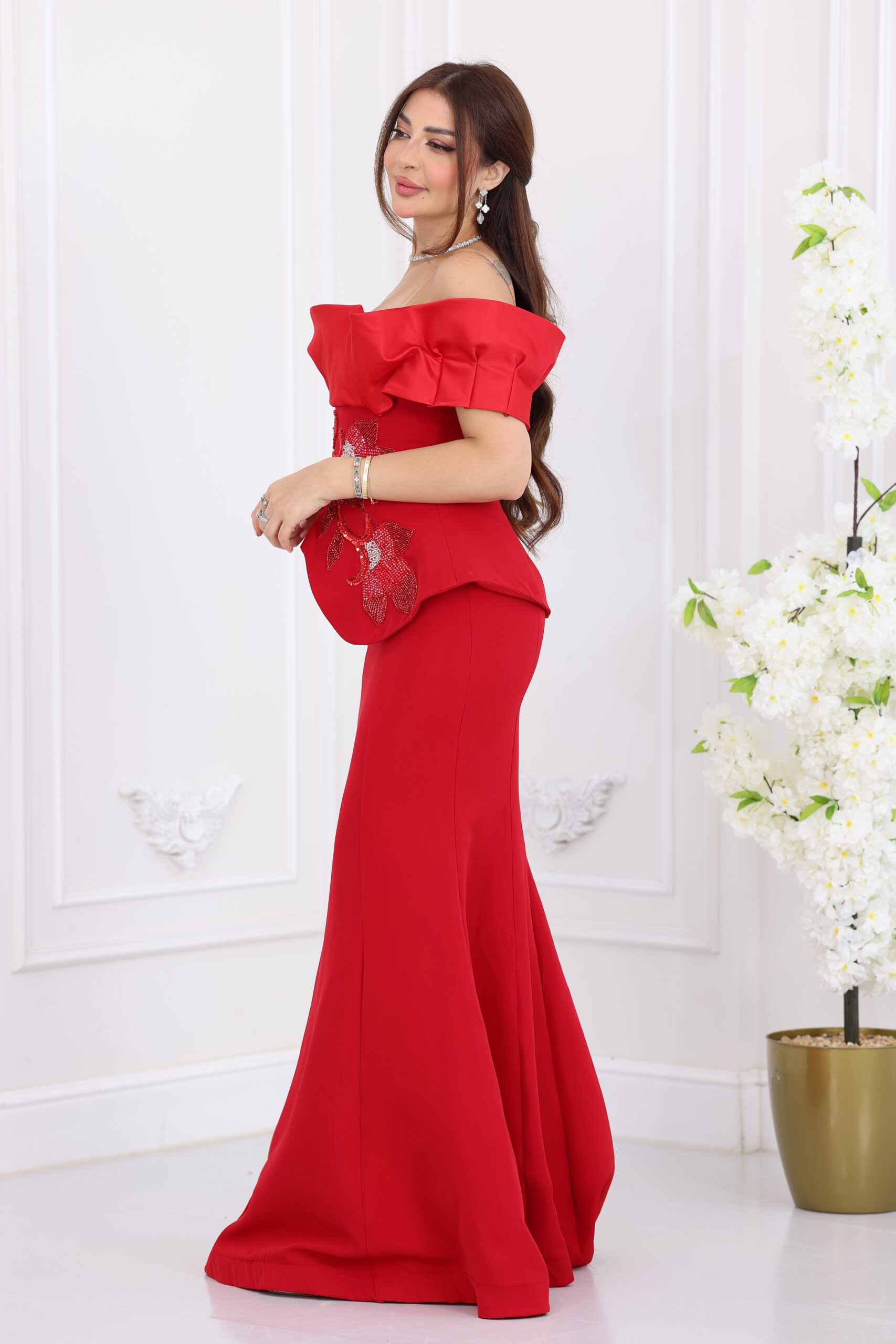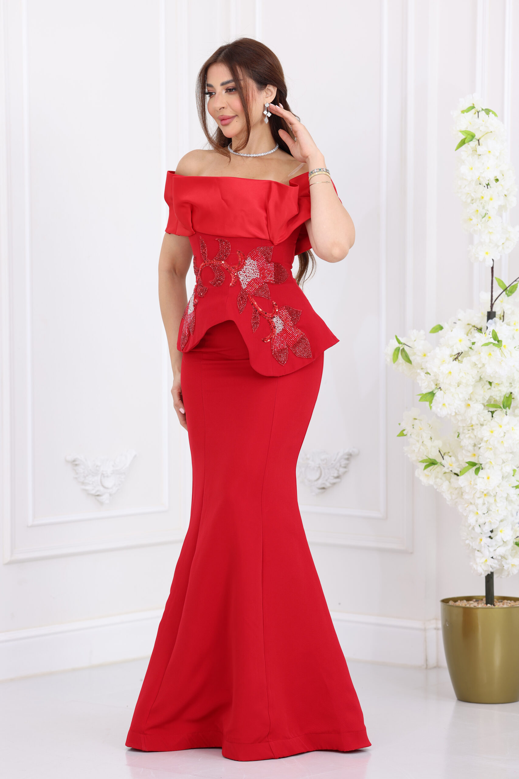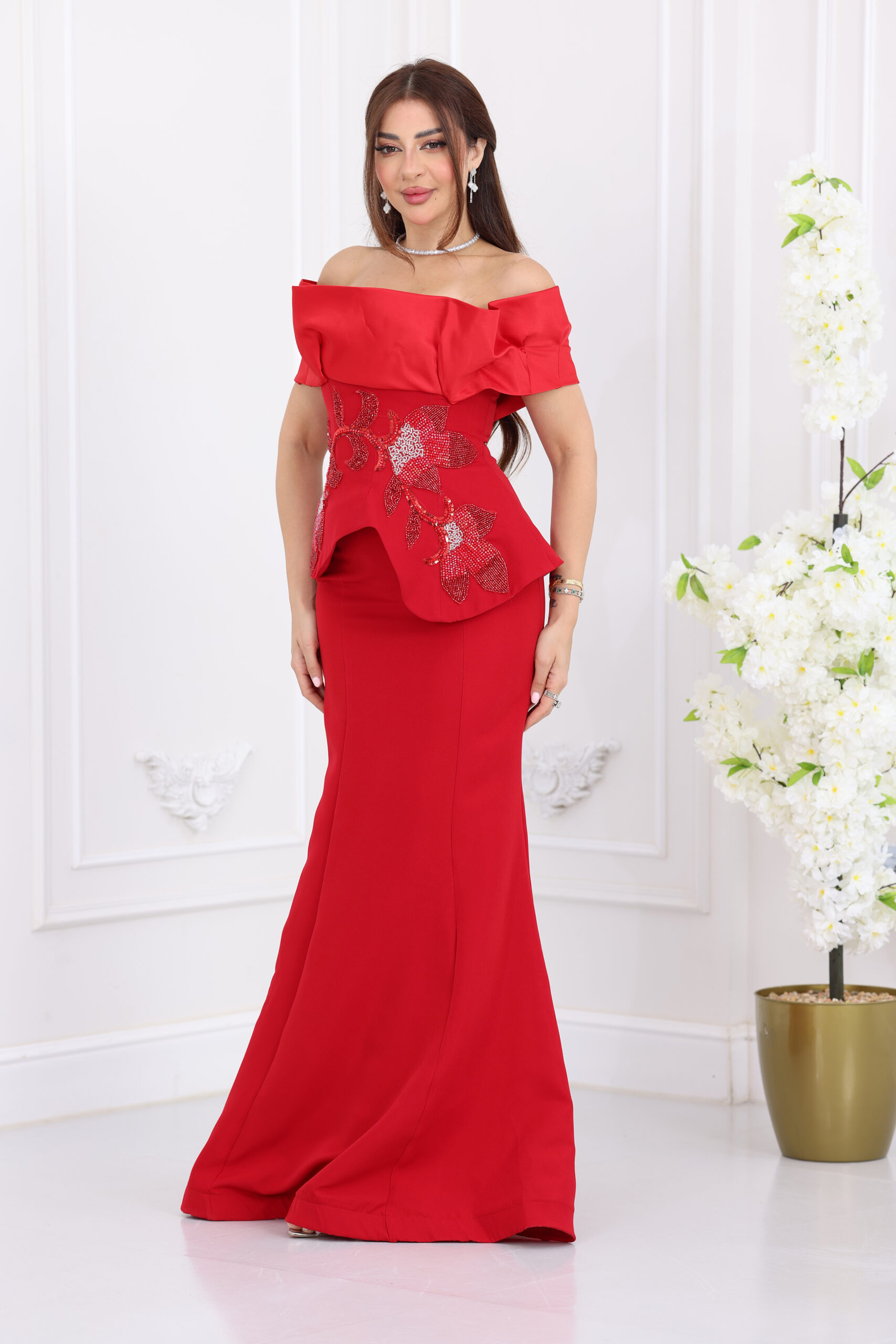 يتميز الفستان بتصميم “أوف شولدر” (Off-shoulder) بكسرات عريضة تبرز جمال العنق والأكتاف برقي متناهٍ، مع قصة “البيبلوم” (Peplum) الشهيرة التي تنحت الخصر وتخفي العيوب بجمالية فائقة. الفخامة الحقيقية تكمن في الشك اليدوي الكثيف والمتقن بخرز وستراس لامع على شكل ورود وأغصان فنية تمتد على كامل منطقة الخصر والبيبلوم، مع تنورة طويلة بقصة انسيابية تمنحكِ قواماً ممشوقاً وهيبة حضور لا تُنسى في السهرات.