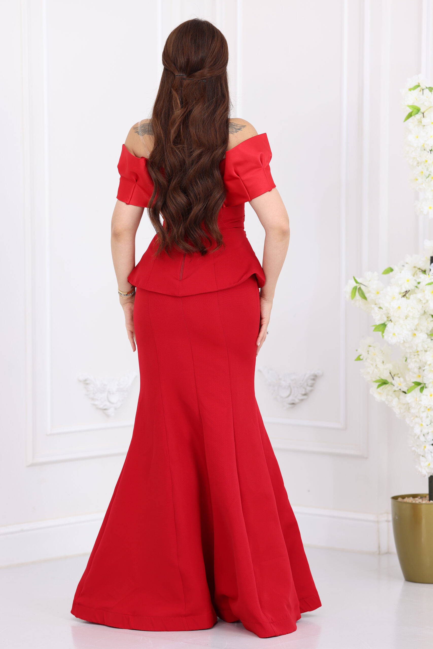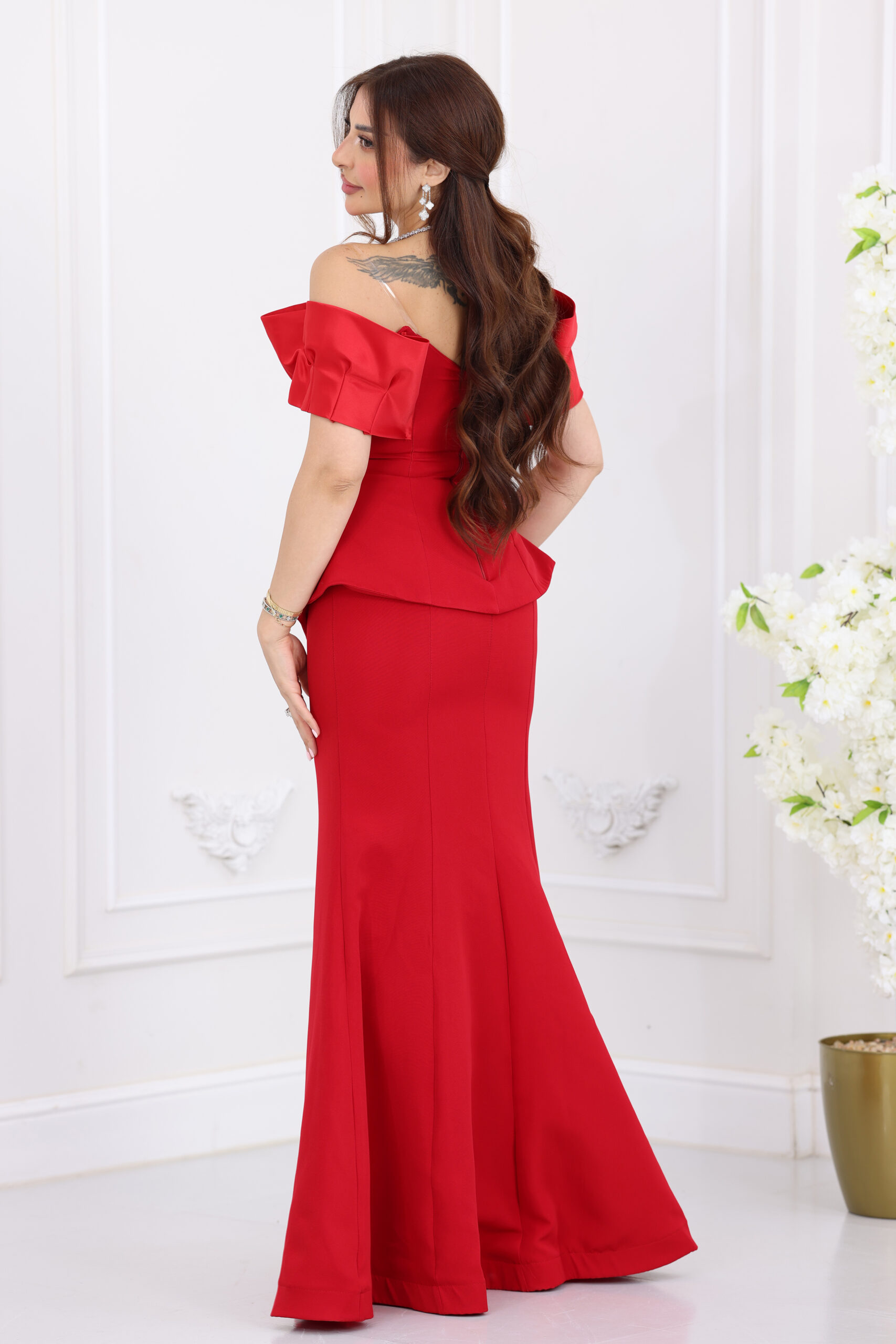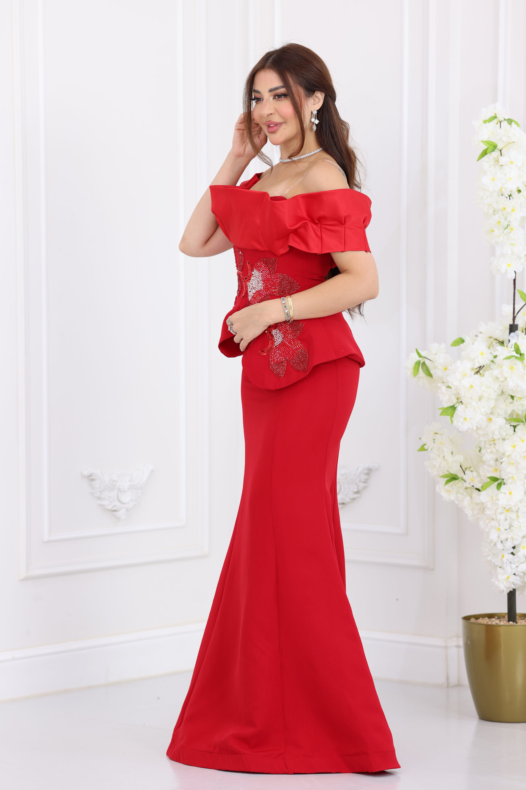 يتميز الفستان بتصميم “أوف شولدر” (Off-shoulder) بكسرات عريضة تبرز جمال العنق والأكتاف برقي متناهٍ، مع قصة “البيبلوم” (Peplum) الشهيرة التي تنحت الخصر وتخفي العيوب بجمالية فائقة. الفخامة الحقيقية تكمن في الشك اليدوي الكثيف والمتقن بخرز وستراس لامع على شكل ورود وأغصان فنية تمتد على كامل منطقة الخصر والبيبلوم، مع تنورة طويلة بقصة انسيابية تمنحكِ قواماً ممشوقاً وهيبة حضور لا تُنسى في السهرات.