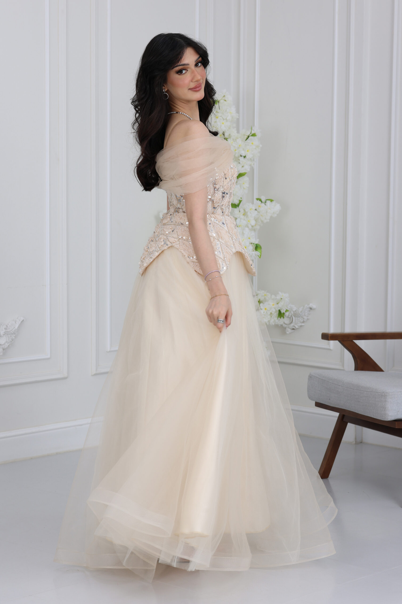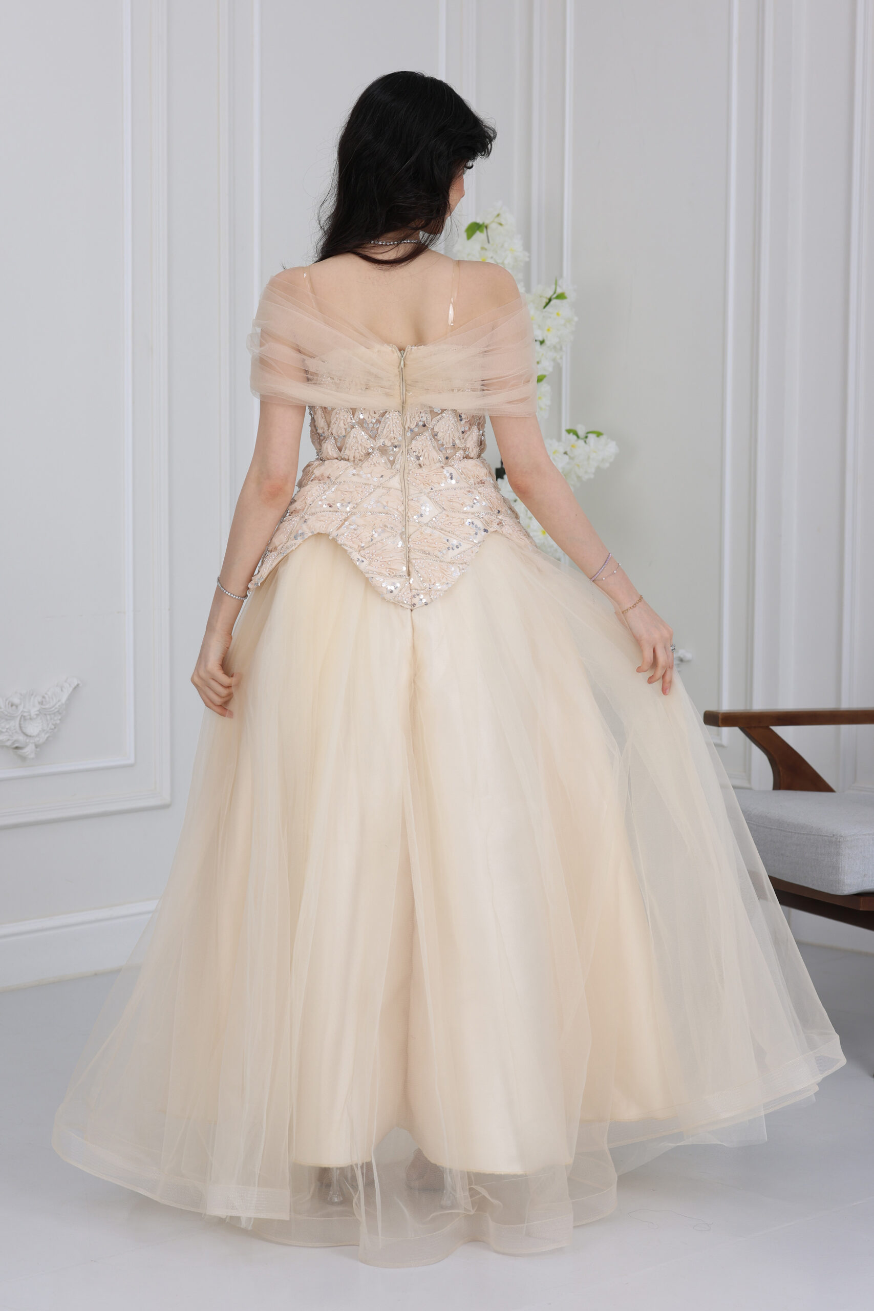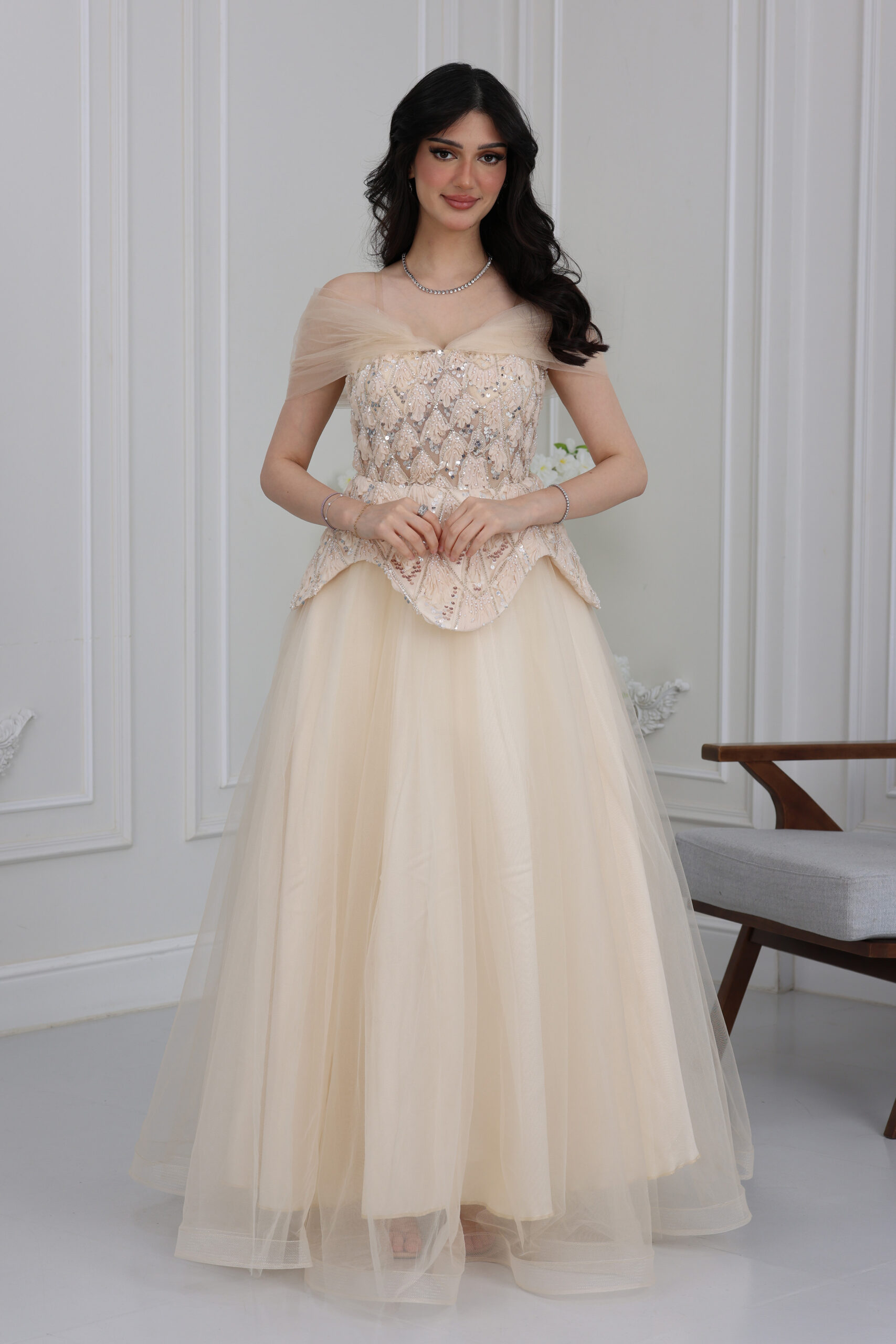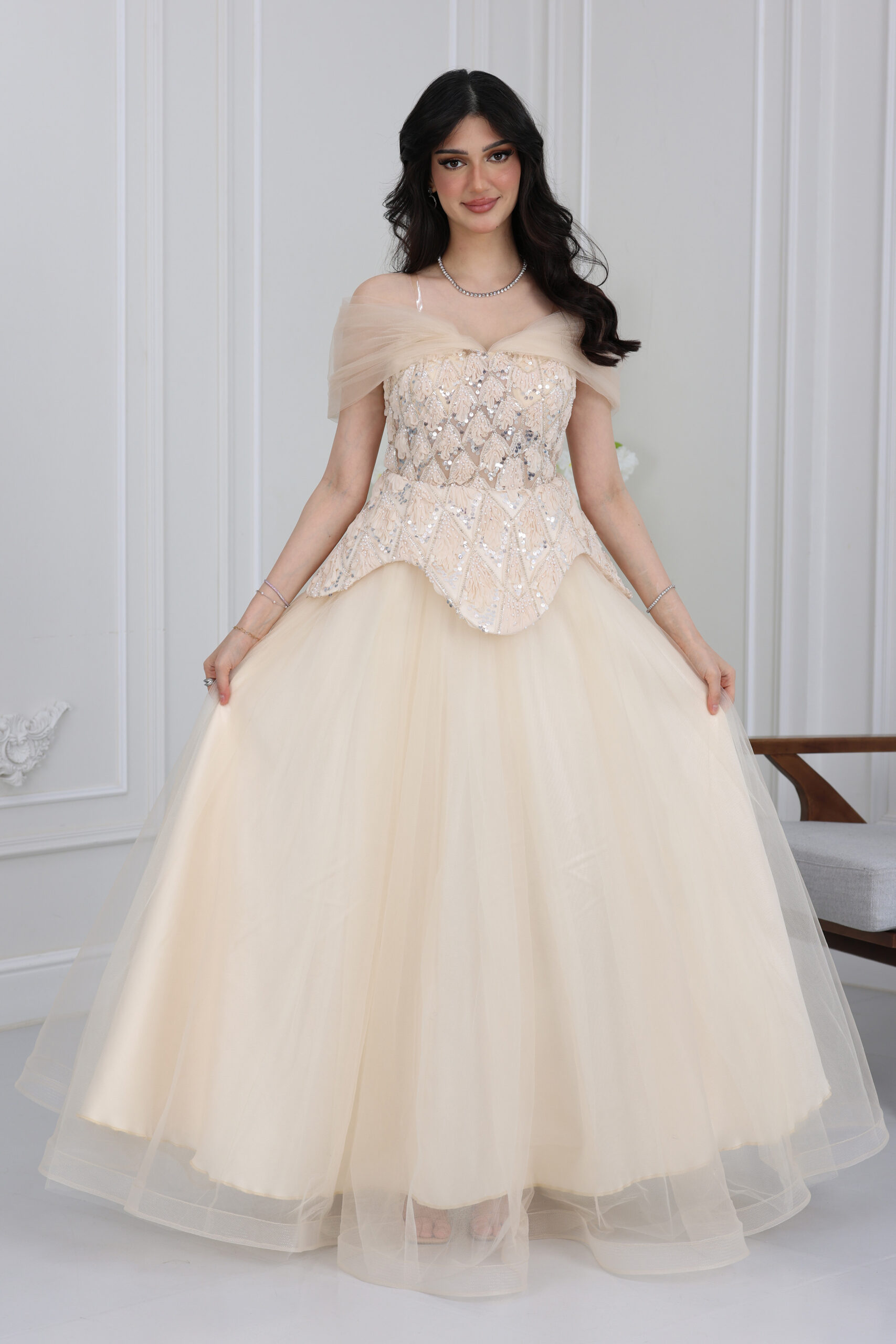 فستان سهرة مناسبات ملكي صُمم هذا الفستان الساحر ليكون تحفة فنية تليق بكِ ملكة في أفخم المناسبات. يتميز الفستان بقصته الملكية الطويلة التي تمنحك حضوراً آسراً، مع تصميم علوي فاخر مرصّع بتطريزات براقة تضيف لمسة فخامة لا تُنسى. القصّة المبتكرة عند الخصر تبرز جمال القوام بشكل أنثوي راقٍ، فيما تنسدل التنورة بتفاصيل التلّ الناعم متعدد الطبقات لتخلق حركة خفيفة وساحرة مع كل خطوة. هذا الموديل مثالي لمن تبحث عن فساتين مناسبات أو فساتين خطوبة تضمن لها تصدّر الإطلالات. لا تفوّتي فرصة امتلاك هذا الفستان الفخم، الذي يجمع بين الحرفية العالية والتصميم العصري. اطلبيه الآن من المصمم الحديث وكوني نجمة سهرتك!