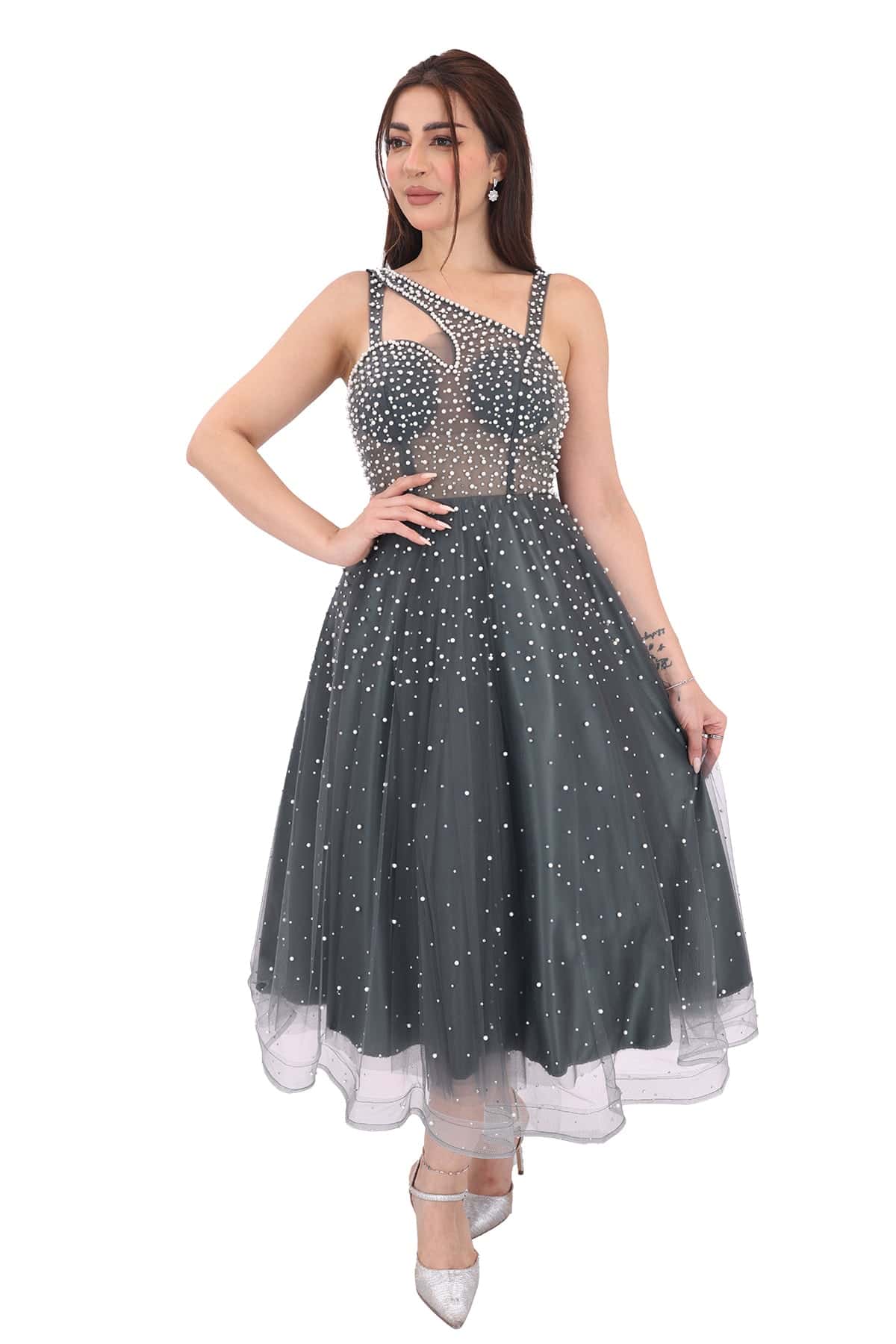 فستان سهرة ميدي فخم بتطريز لؤلؤ من خامة التل بتصميم روماني فاخر صمم هذا الفستان على ايادي أفخم المصممين العالمين في مجال الأزياء قطعة فريدة وأنيقة تجمع بين الجمال والفخامة. إنه فستان يلفت الأنظار ويبرز أناقة وأنوثة الارتداء
