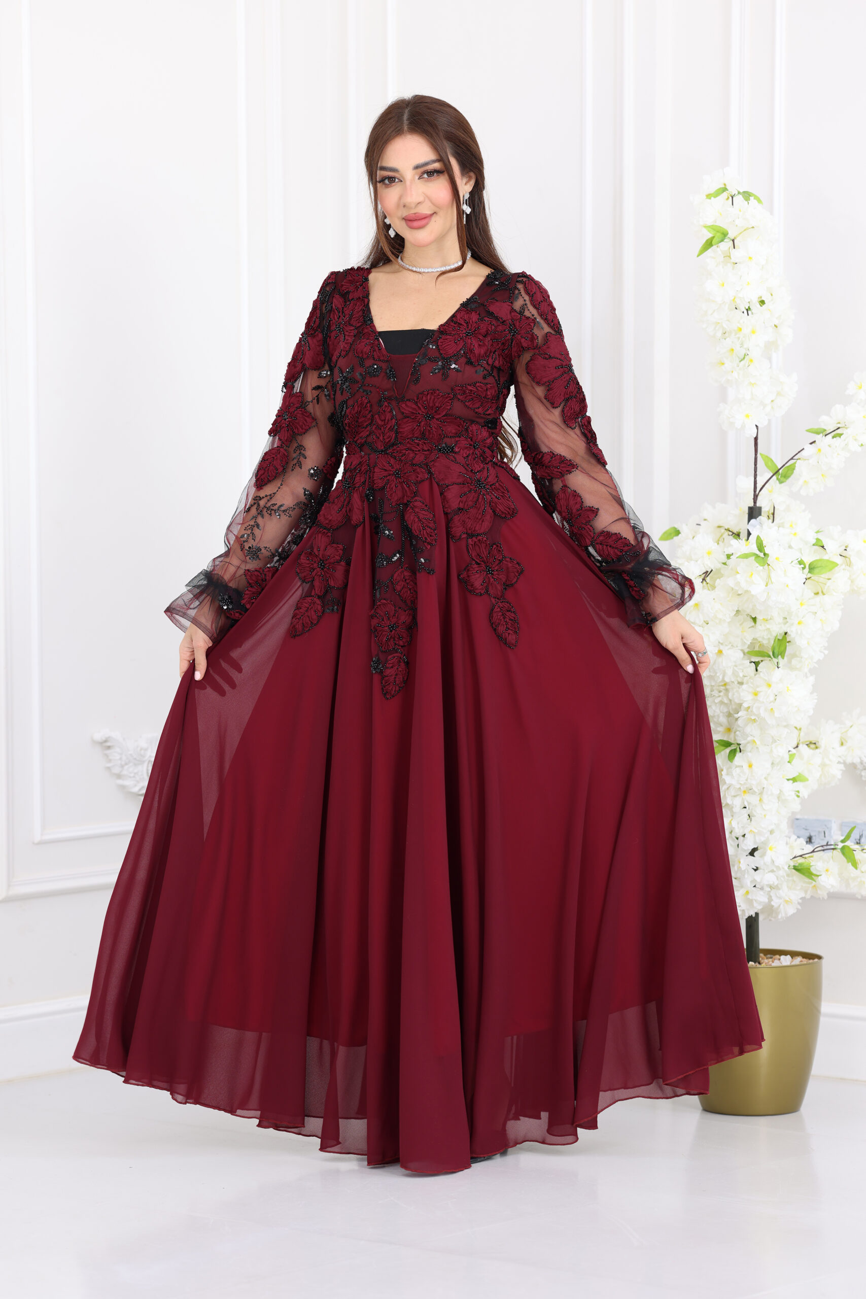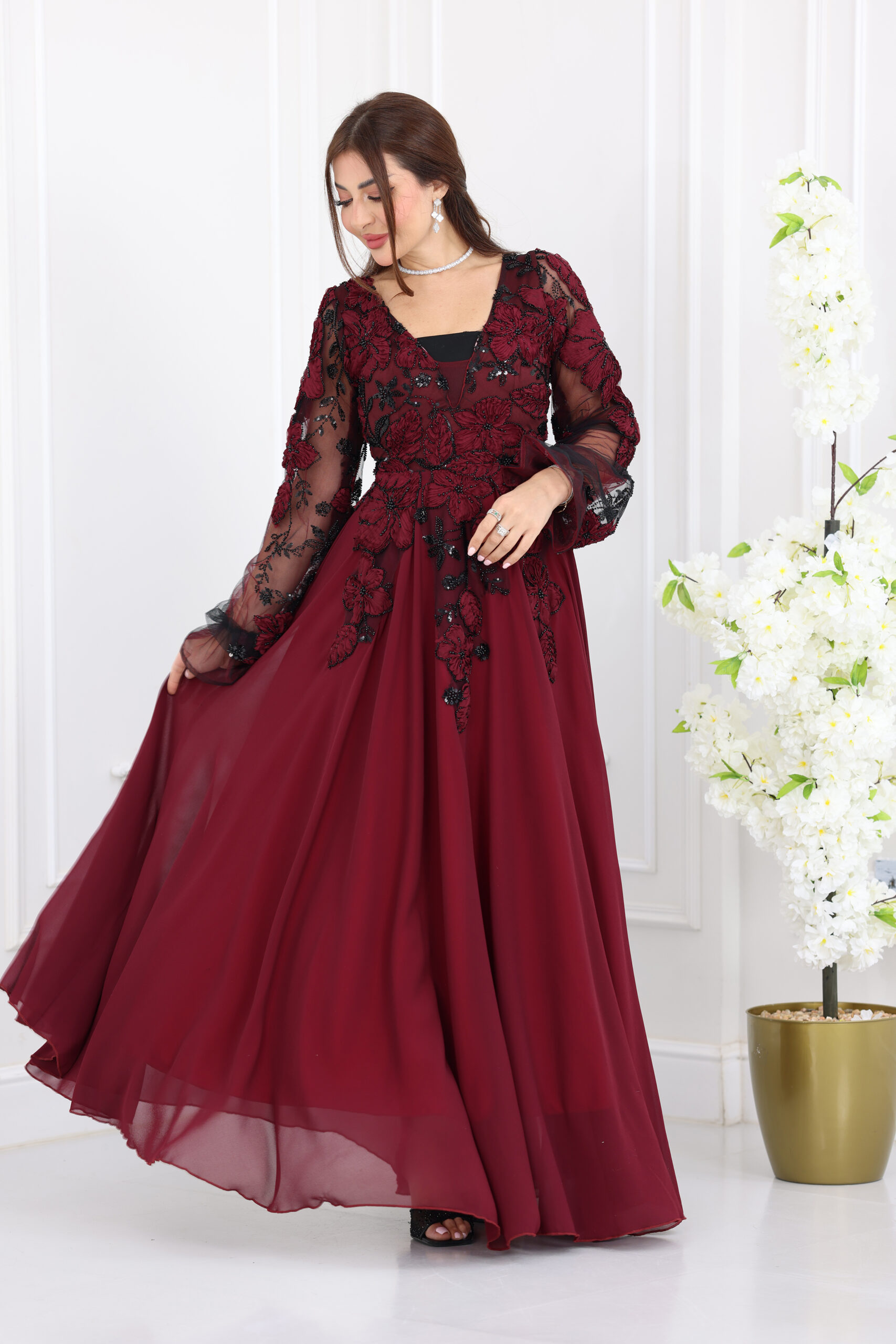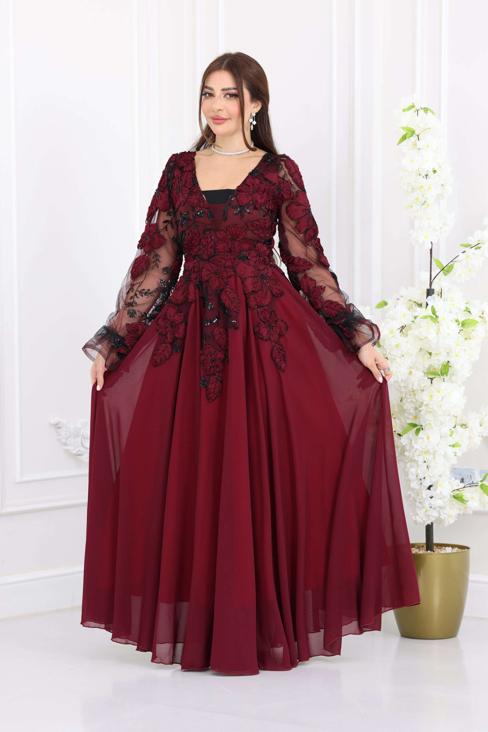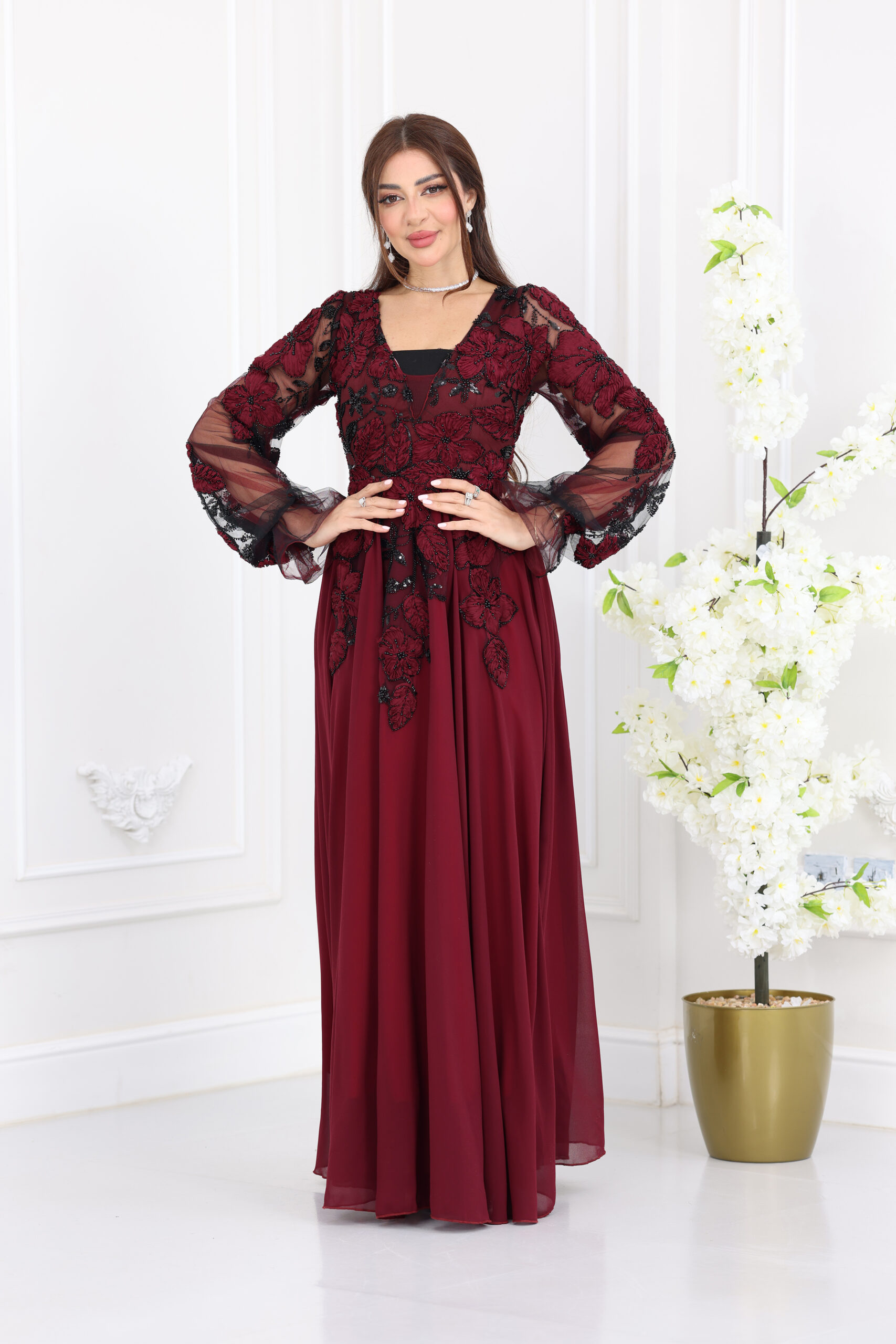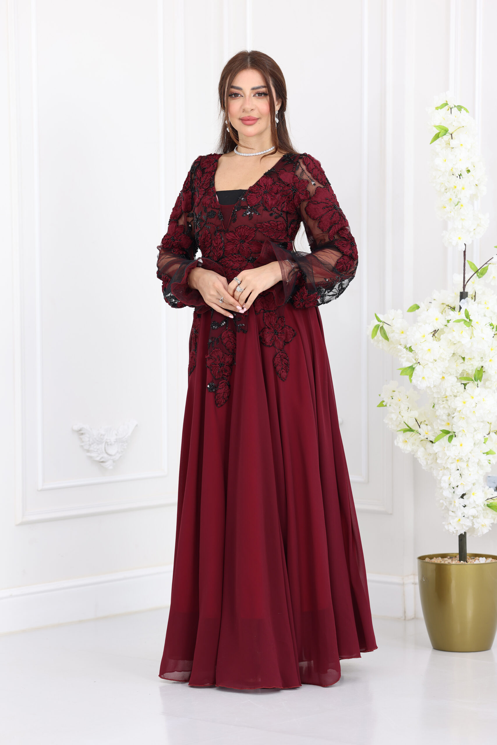 يتميز الفستان بياقة “V” أنيقة تمنحكِ مظهراً ساتراً وراقياً، مع قصة انسيابية واسعة (A-Line) تنسدل بنعومة لتمنحكِ حركة ملكية مهيبة. الإبداع الحقيقي يظهر في الأكمام الطويلة والمنفوخة (Puff Sleeves) المصنوعة من الشيفون المشغول بالدانتيل، بالإضافة إلى الشك اليدوي الكثيف والمتقن الذي يغطي كامل الفستان بنقوش ورود وأوراق شجر فنية مشغولة بالخرز والستراس، مما يضفي لمسة ثلاثية الأبعاد وبريقاً أخاذاً في كل سهرة.