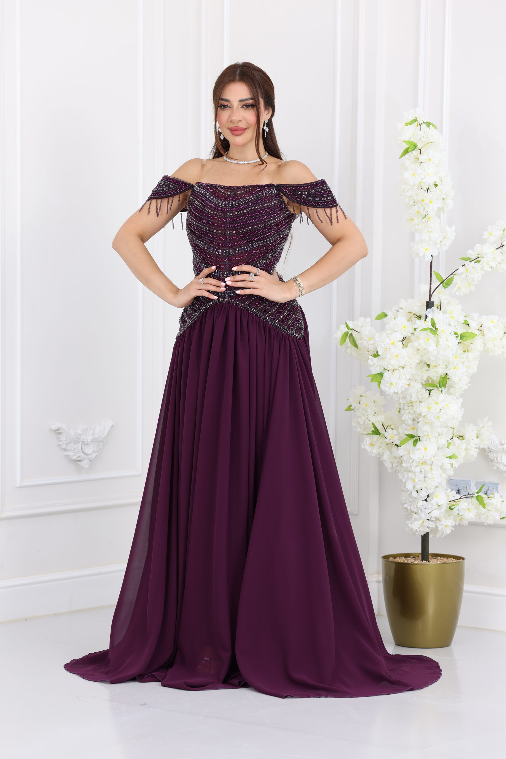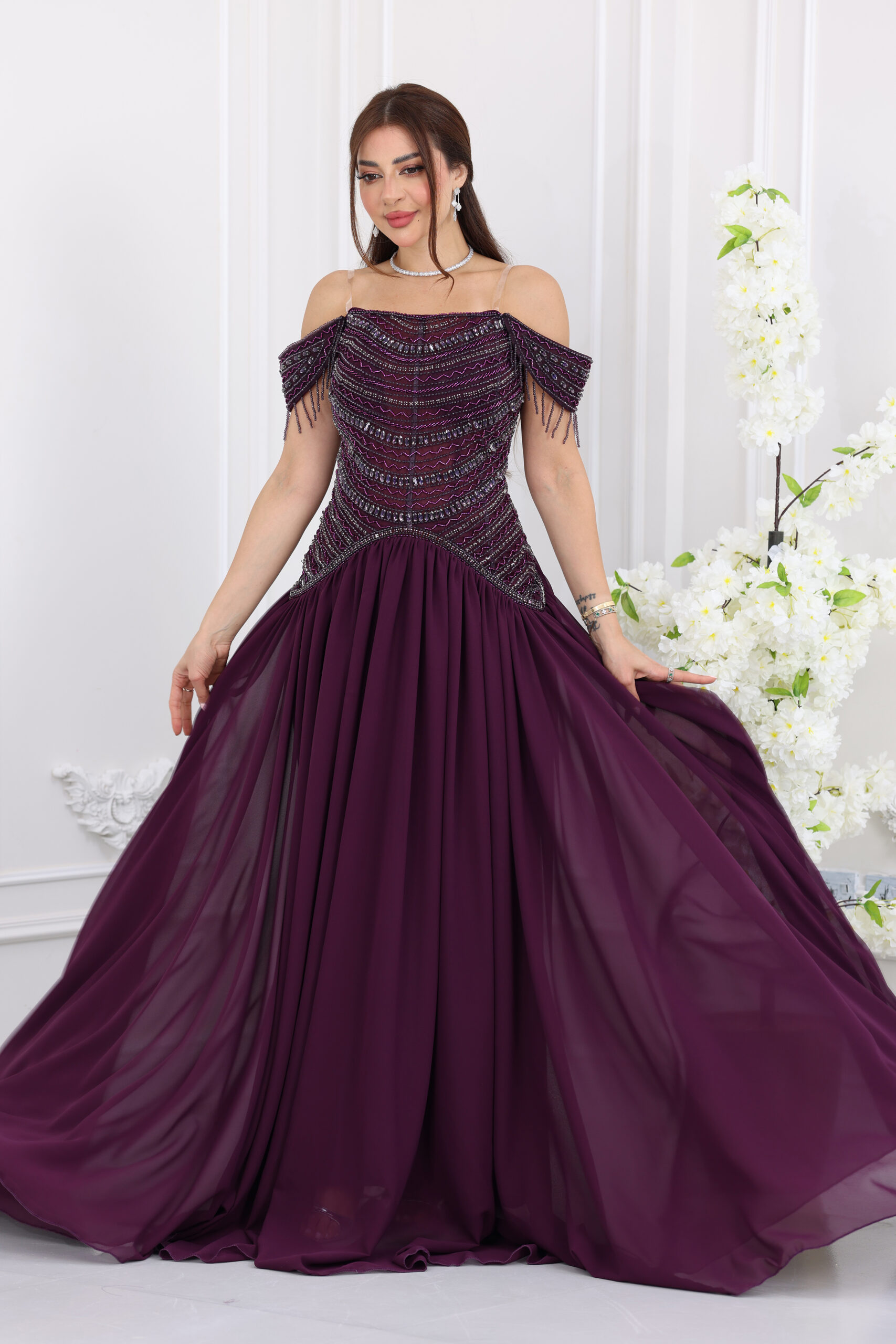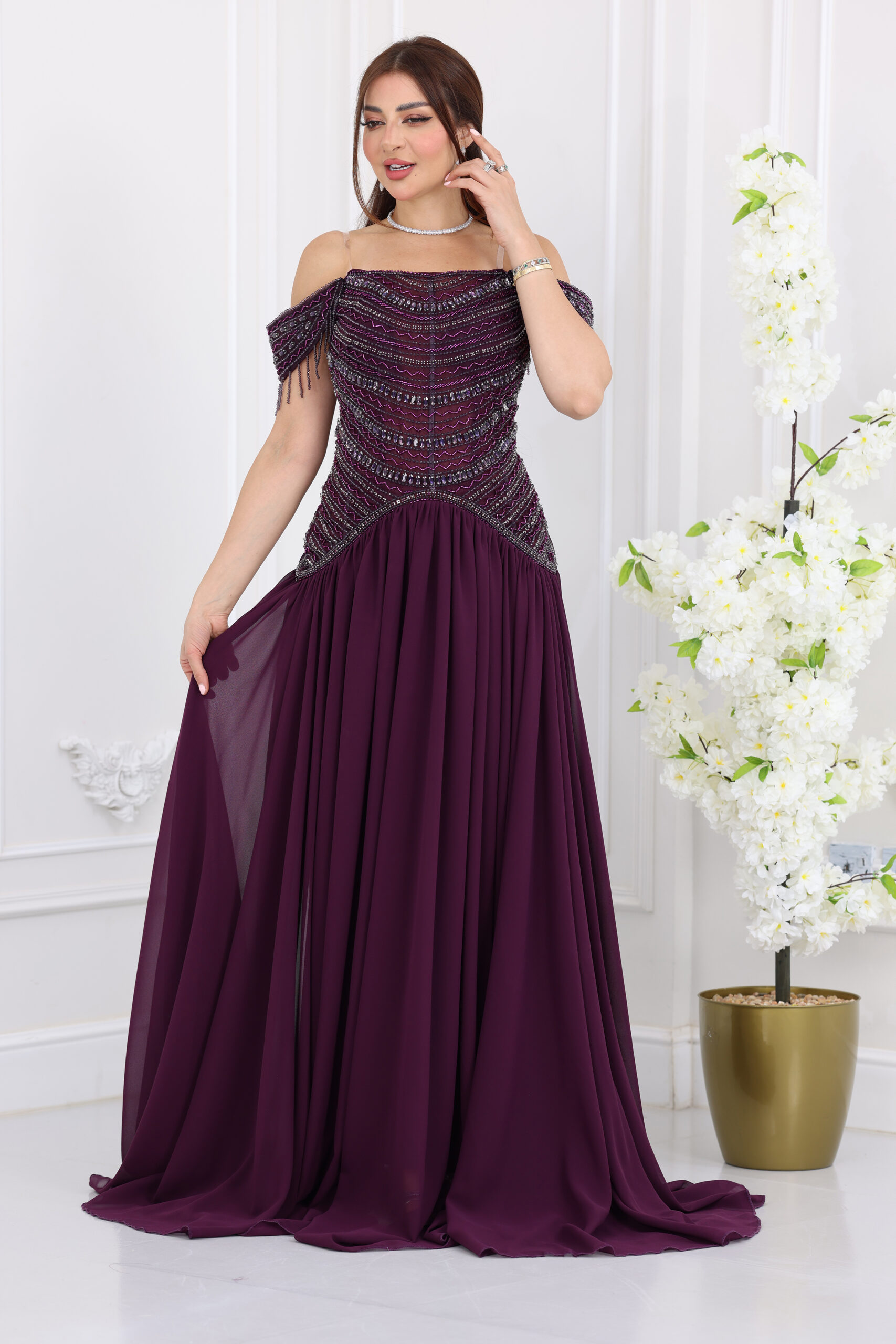 يتميز الفستان بتصميم “أوف شولدر” (Off-shoulder) راقٍ يزدان بكسرات ناعمة وأهداب كريستالية متدلية تمنح الأكتاف بريقاً أخاذاً مع كل حركة. الفخامة الحقيقية تكمن في الشك اليدوي الكثيف والمتقن الذي يغطي كامل منطقة الصدر والخصر بخطوط هندسية من الخرز والستراس اللامع، وينساب الفستان بتنورة واسعة ومنسدلة بطول كامل (ماكسي) تمنحكِ هيبة الحضور وطلة ملكية ساحرة في أرقى السهرات.