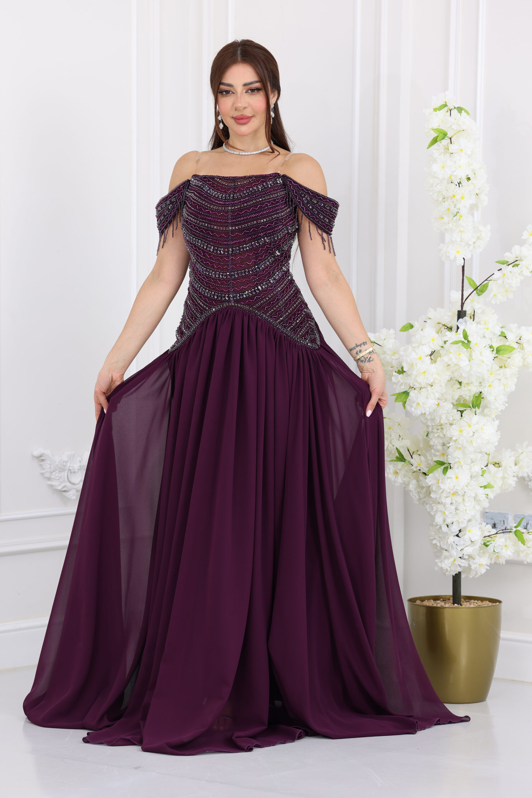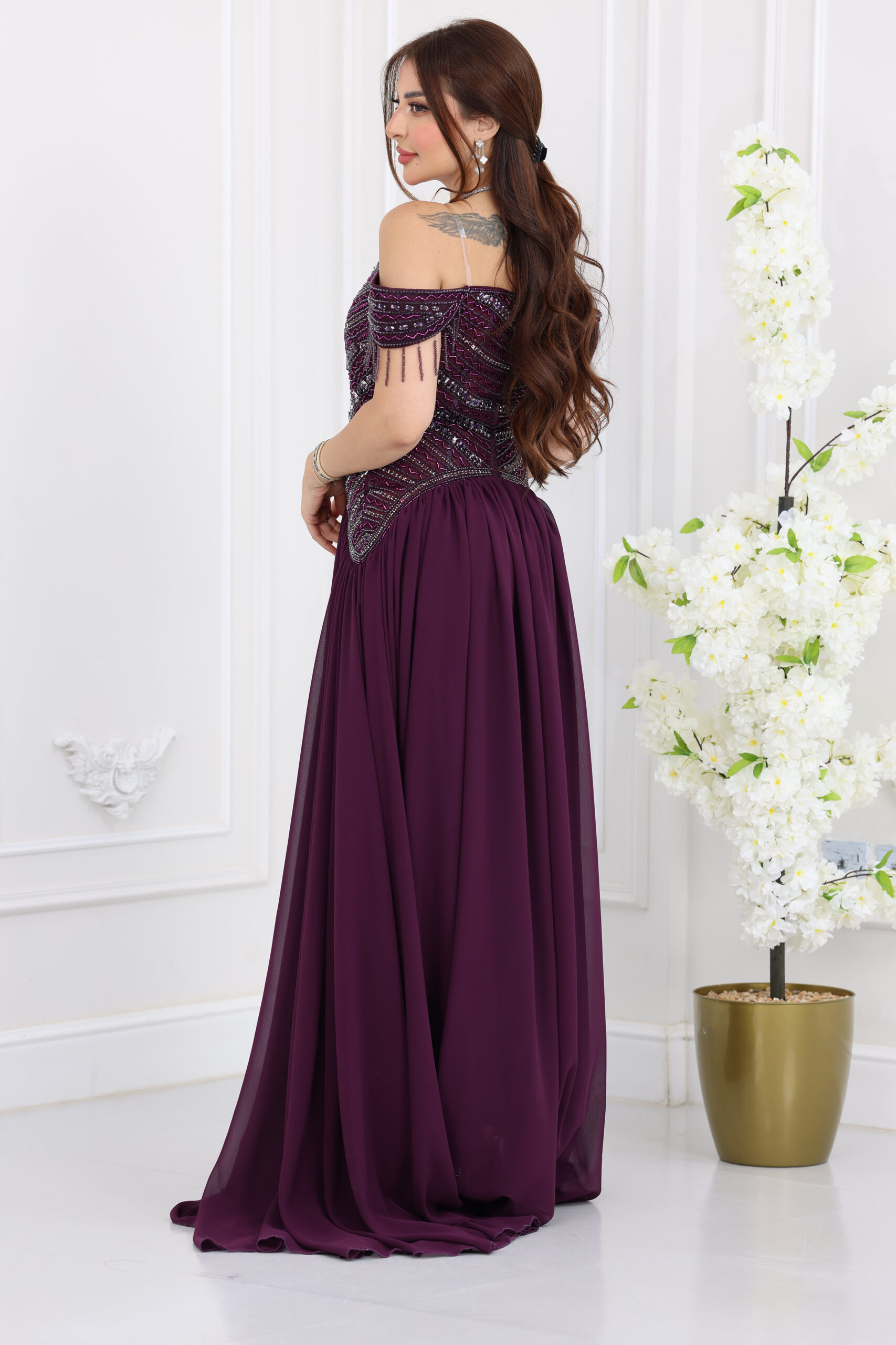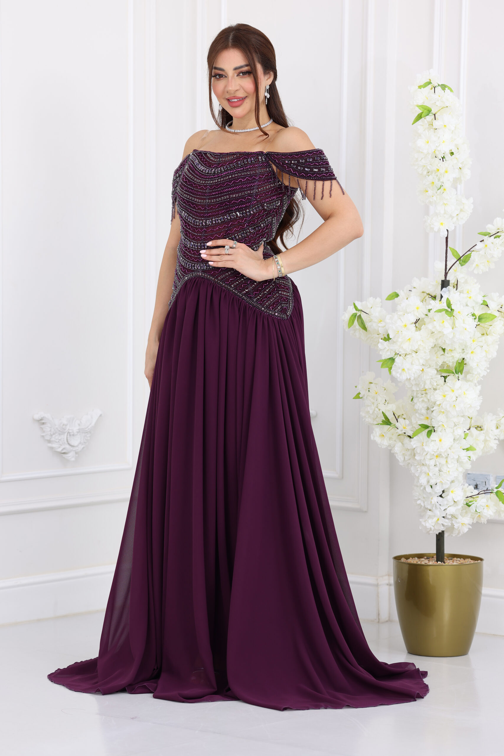 يتميز الفستان بتصميم “أوف شولدر” (Off-shoulder) راقٍ يزدان بكسرات ناعمة وأهداب كريستالية متدلية تمنح الأكتاف بريقاً أخاذاً مع كل حركة. الفخامة الحقيقية تكمن في الشك اليدوي الكثيف والمتقن الذي يغطي كامل منطقة الصدر والخصر بخطوط هندسية من الخرز والستراس اللامع، وينساب الفستان بتنورة واسعة ومنسدلة بطول كامل (ماكسي) تمنحكِ هيبة الحضور وطلة ملكية ساحرة في أرقى السهرات.