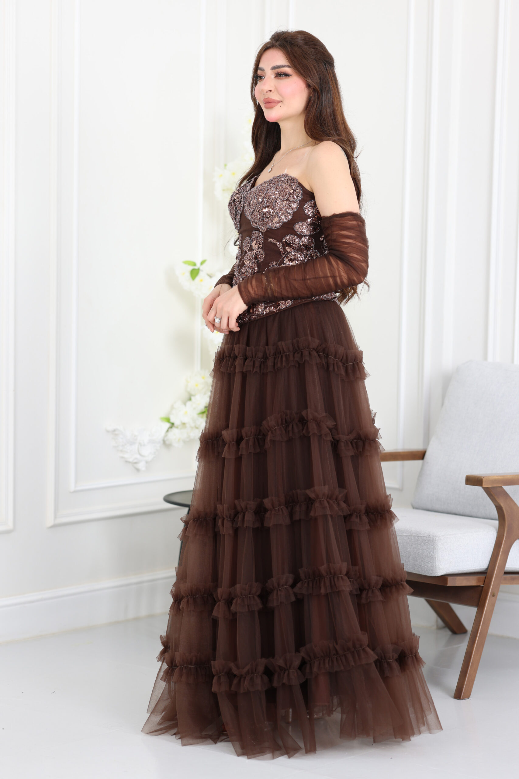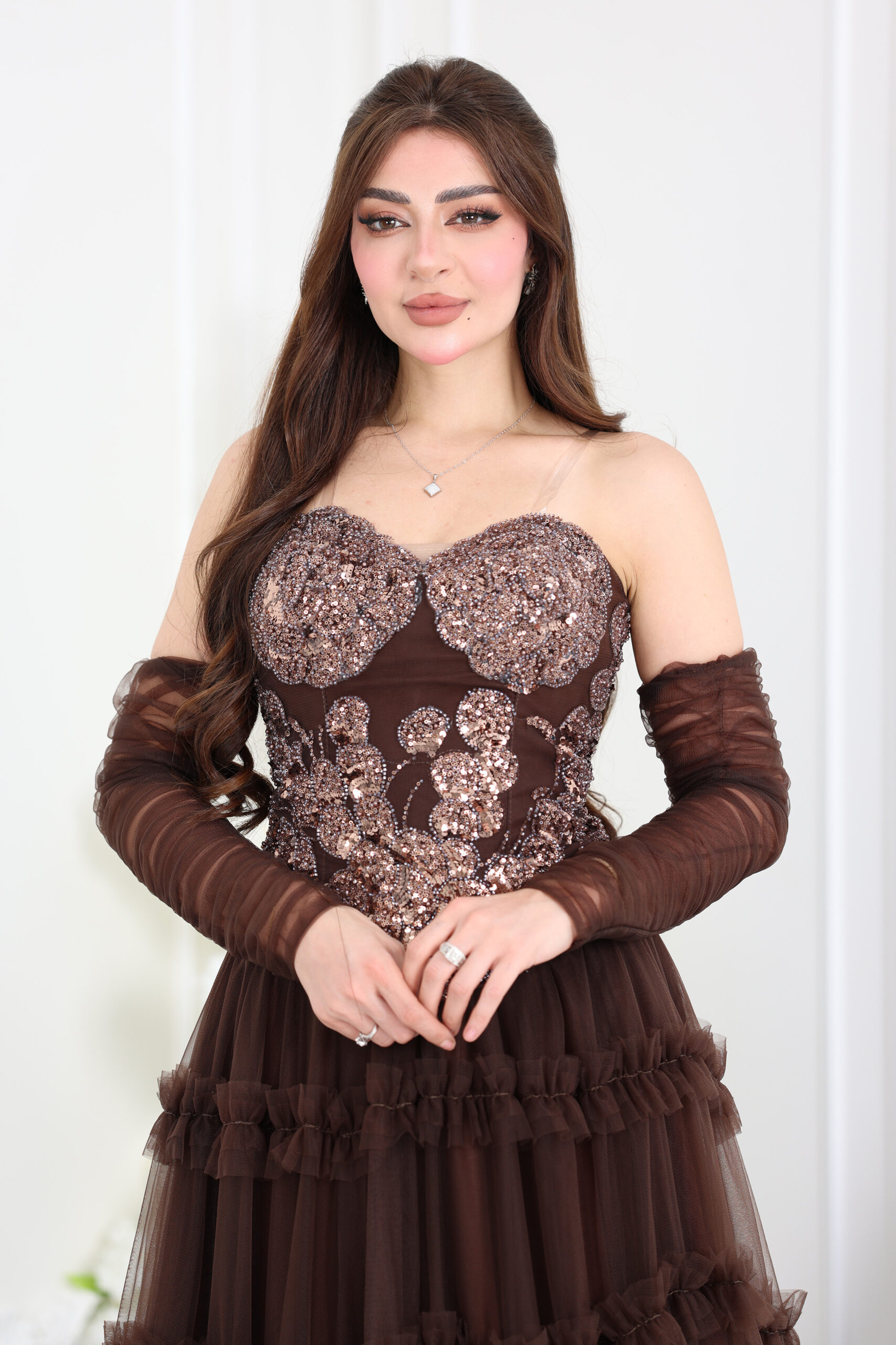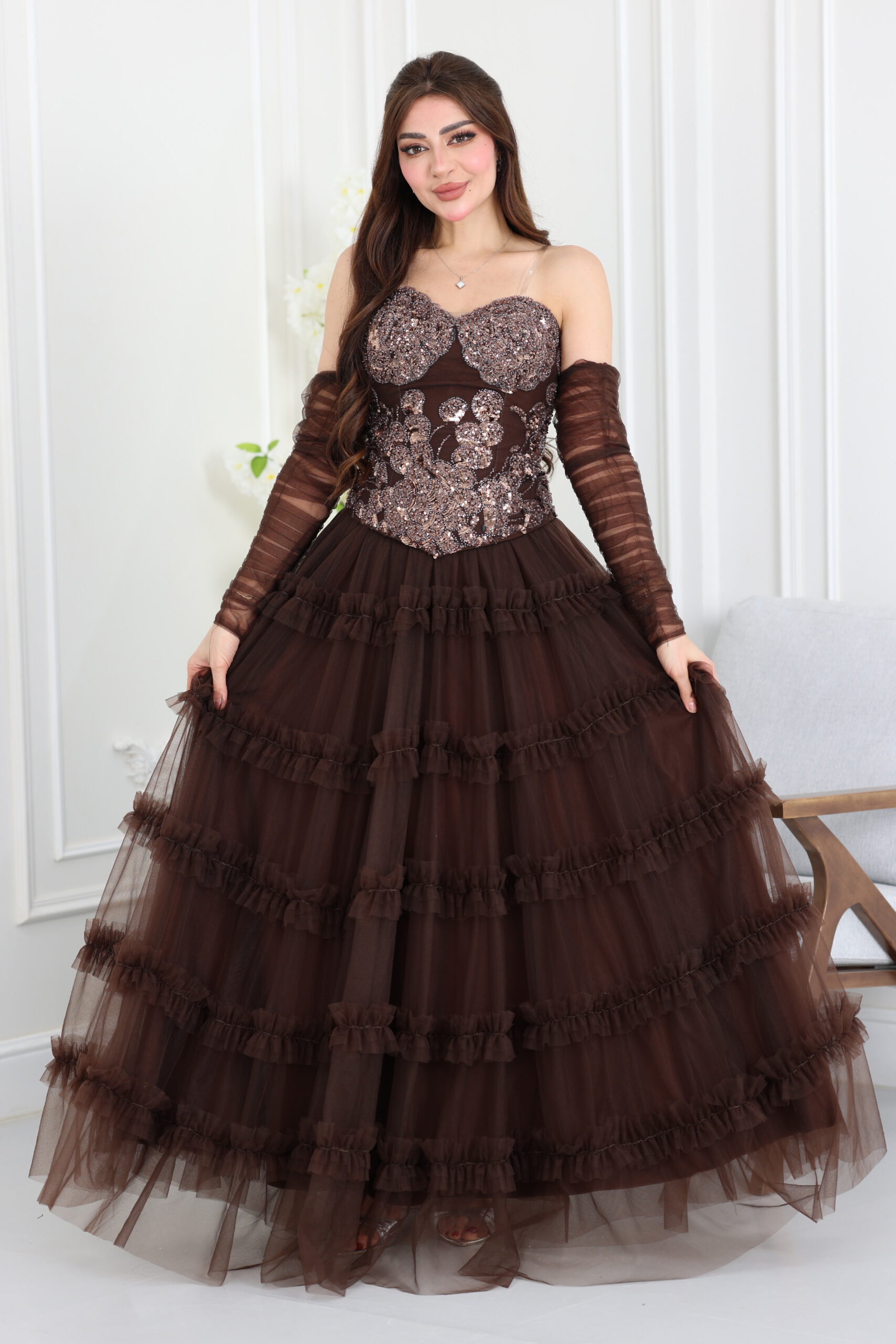 فستان شيفون طبقات فاخر  بتصميم يركز على تحديد القوام بـ قصة مخصرة وهذا يبرز جمال القوام بشكل ساحر. التوب العلوي مُزين بالكامل بالترتر البراق بتصميم أنيق، وهذا يضمن لكِ  وبريقاً لا يُنسى. الفستان طويل، وتتميز تنورته بـ طبقات التل المكشكشة اللي تعطي حجم للموديل. يمكن ارتداؤه مع قفازات/أكمام منفصلة من التل لإضافة لمسة محتشمة وأنيقة. هذا الموديل الراقي من المصمم الحديث يجعلكِ تتألقين