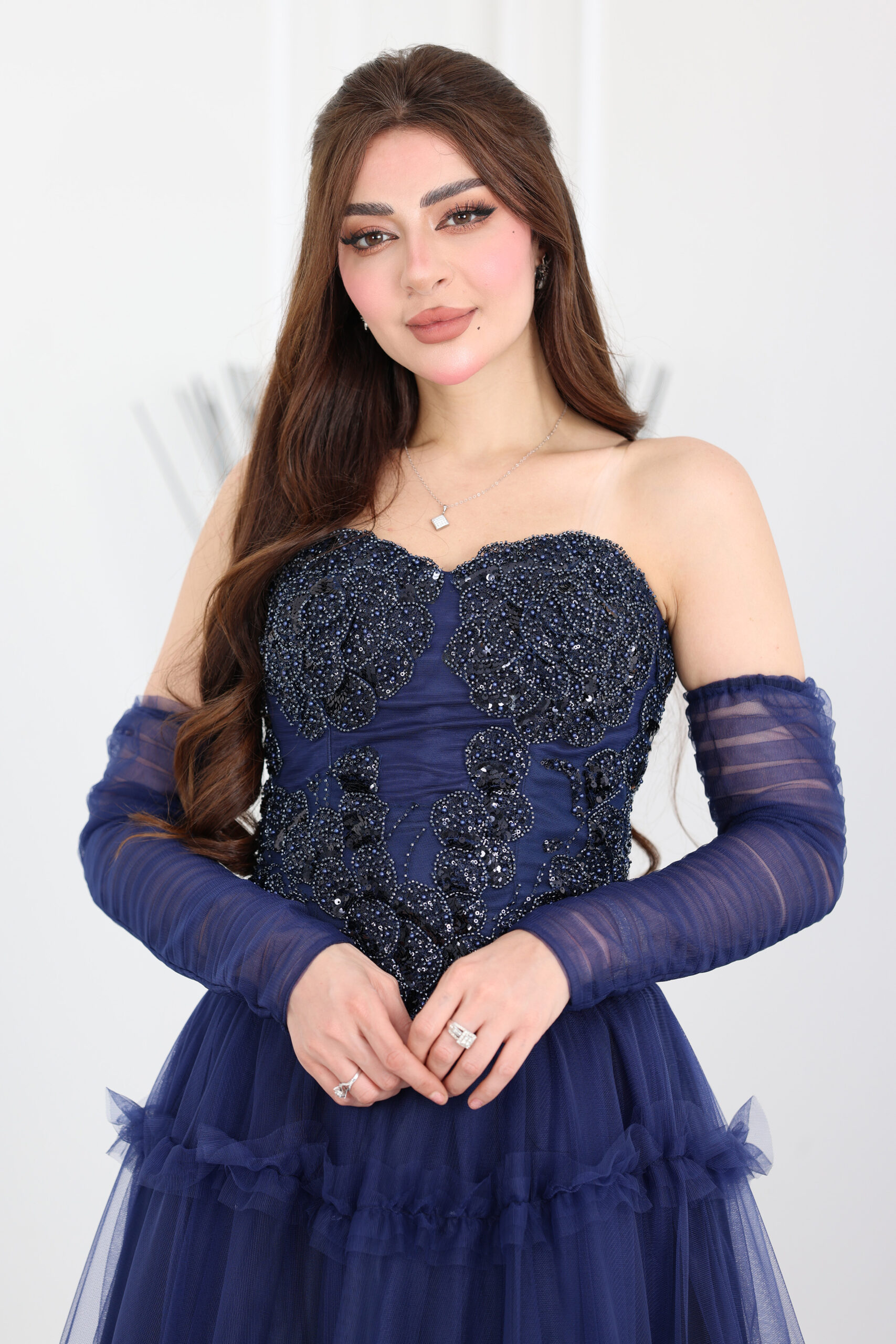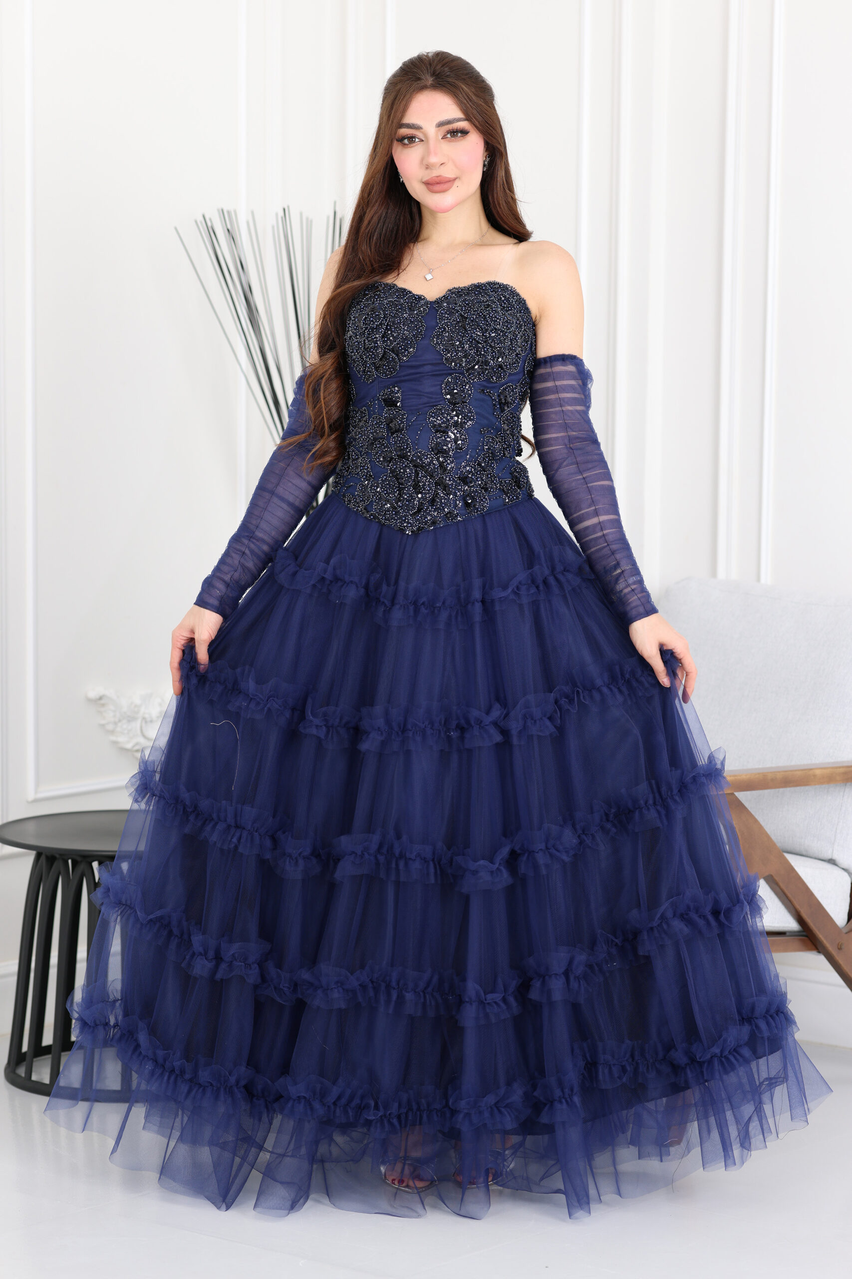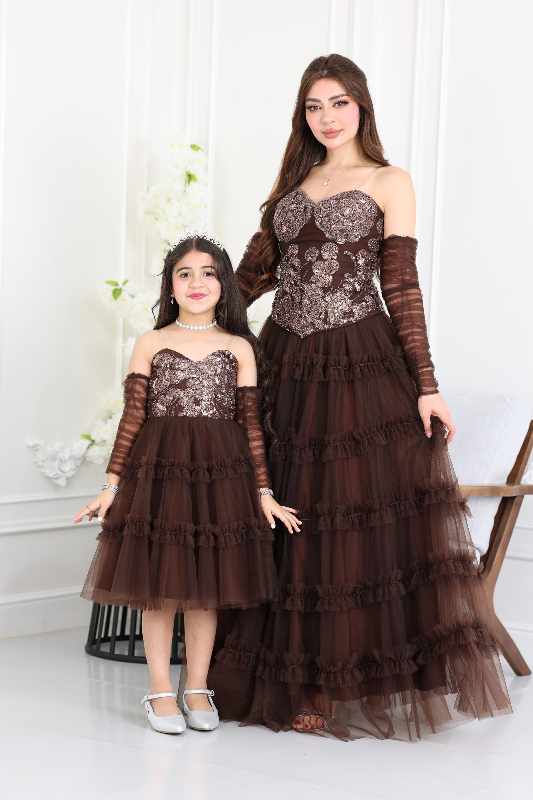 فستان شيفون طبقات فاخر  بتصميم يركز على تحديد القوام بـ قصة مخصرة وهذا يبرز جمال القوام بشكل ساحر. التوب العلوي مُزين بالكامل بالترتر البراق بتصميم أنيق، وهذا يضمن لكِ  وبريقاً لا يُنسى. الفستان طويل، وتتميز تنورته بـ طبقات التل المكشكشة اللي تعطي حجم للموديل. يمكن ارتداؤه مع قفازات/أكمام منفصلة من التل لإضافة لمسة محتشمة وأنيقة. هذا الموديل الراقي من المصمم الحديث يجعلكِ تتألقين