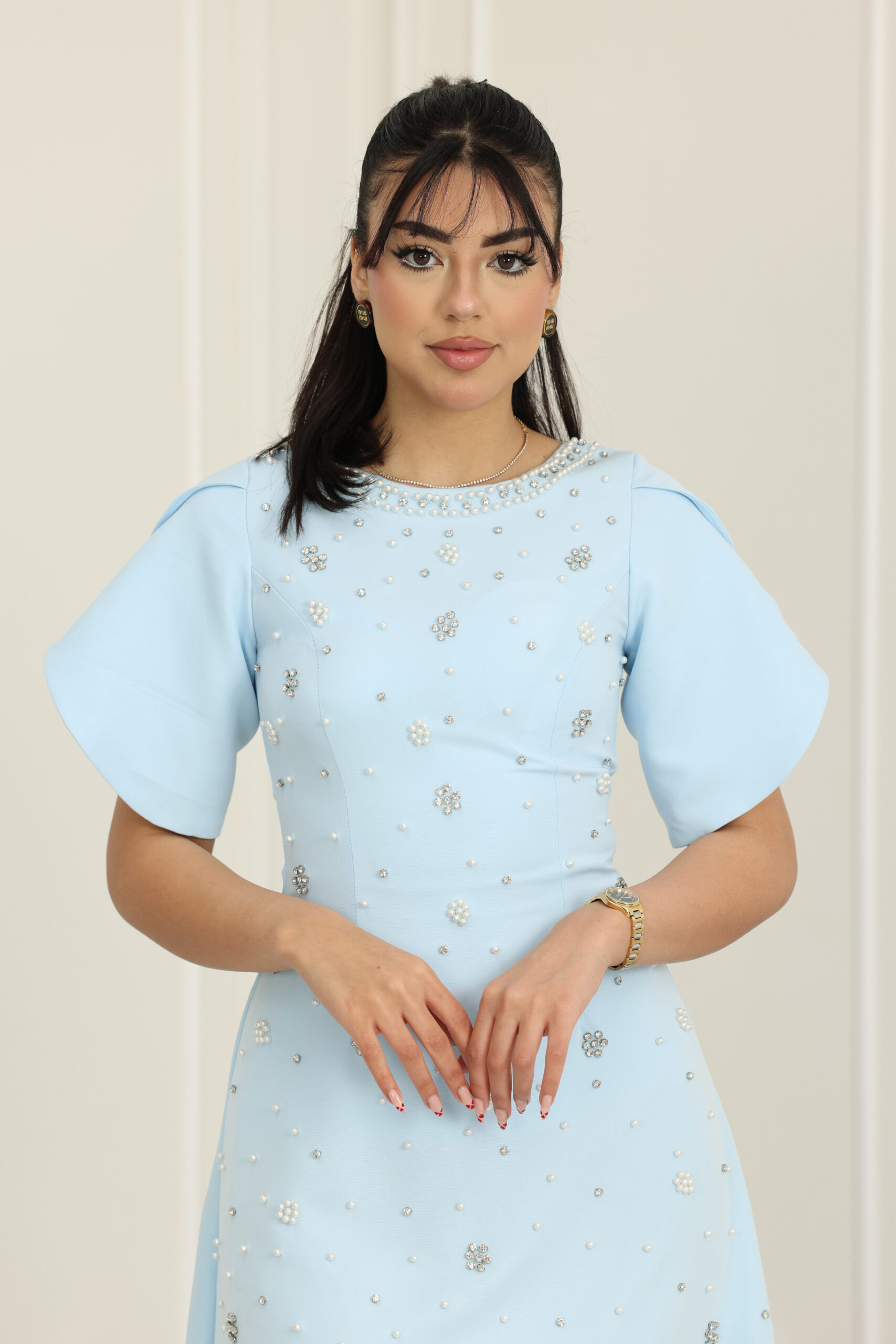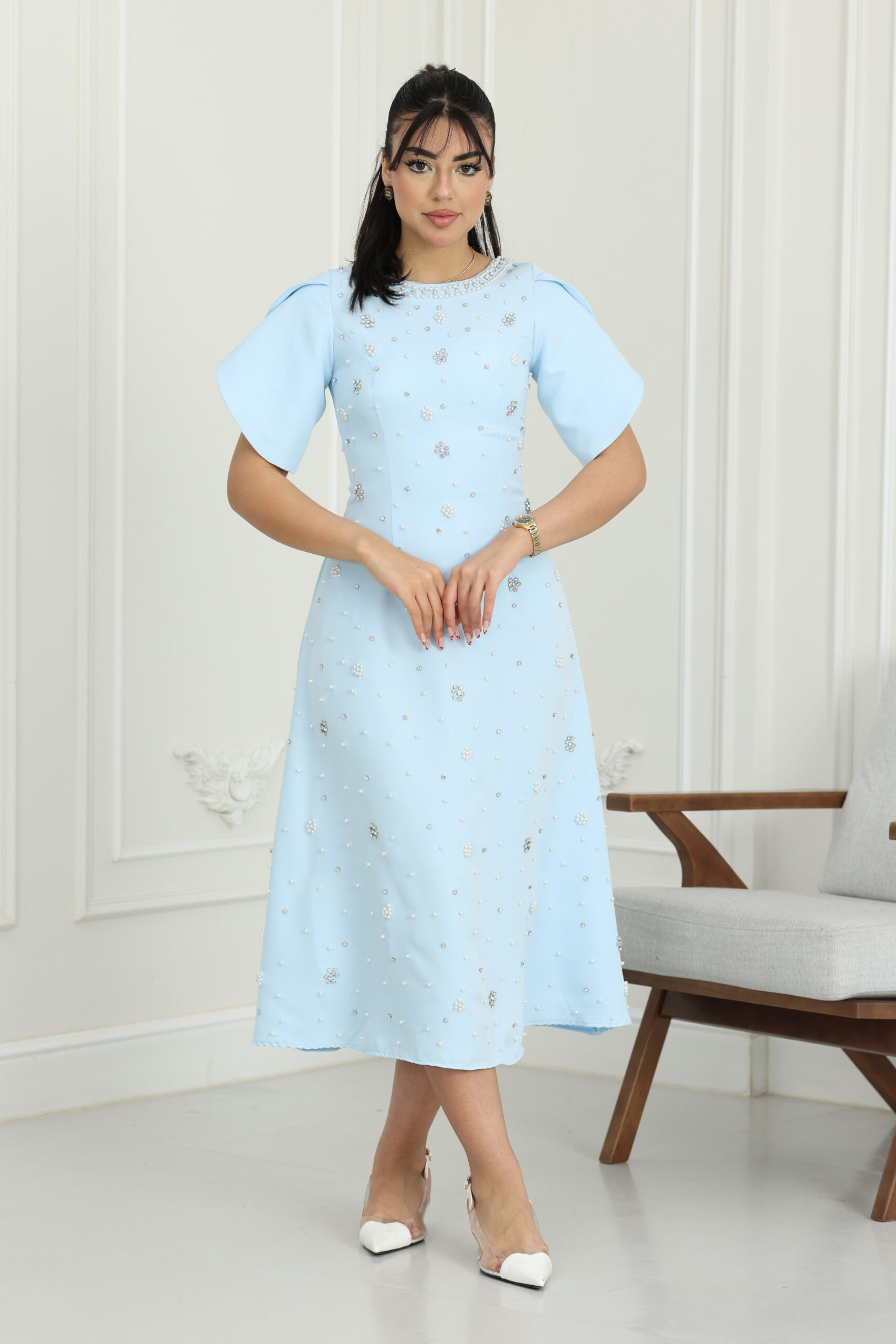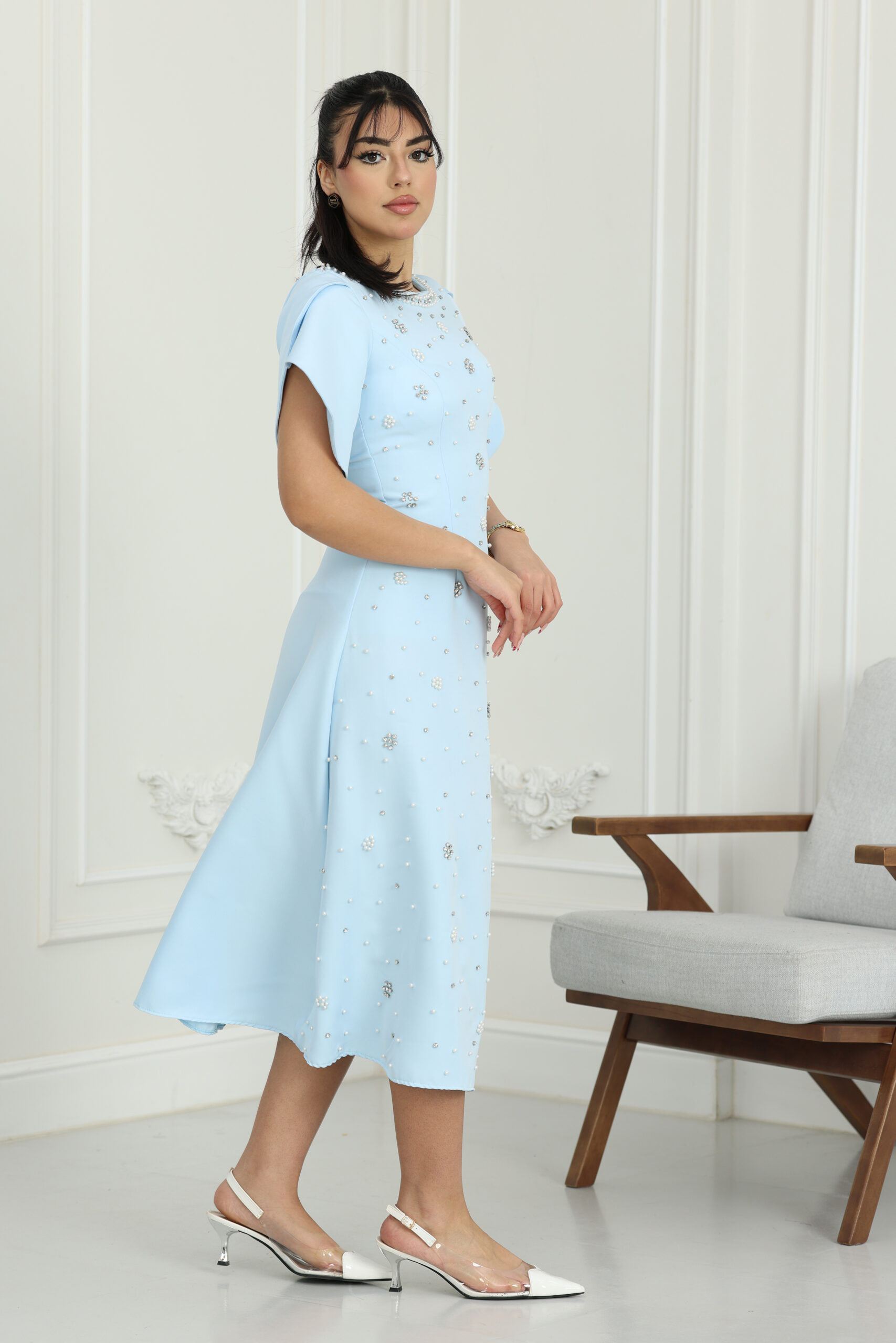 يتميز الفستان بقصة كلاسيكية واسعة من الأسفل تمنحك طابعاً أنثوياً ساحراً، مع تفاصيل “درابيه” (Drapery) أنيقة تنسدل حول الرقبة والكتف لتعطي مظهراً غنياً وراقياً. الأكمام هي سر جمال الموديل، حيث تنتهي بكسرات (Pleats) واسعة ومنسقة بدقة تضفي حركة حيوية وفخامة مع كل إيماءة. كما يتزين الفستان بتطريزات ناعمة من الكريستال والورود الصغيرة الموزعة بإتقان على الصدر والأكمام، مع حزام خصر يحدد القوام بجمالية فائقة وطول “ميدي” يتناسب مع ذوق المجتمع السعودي الراقي.