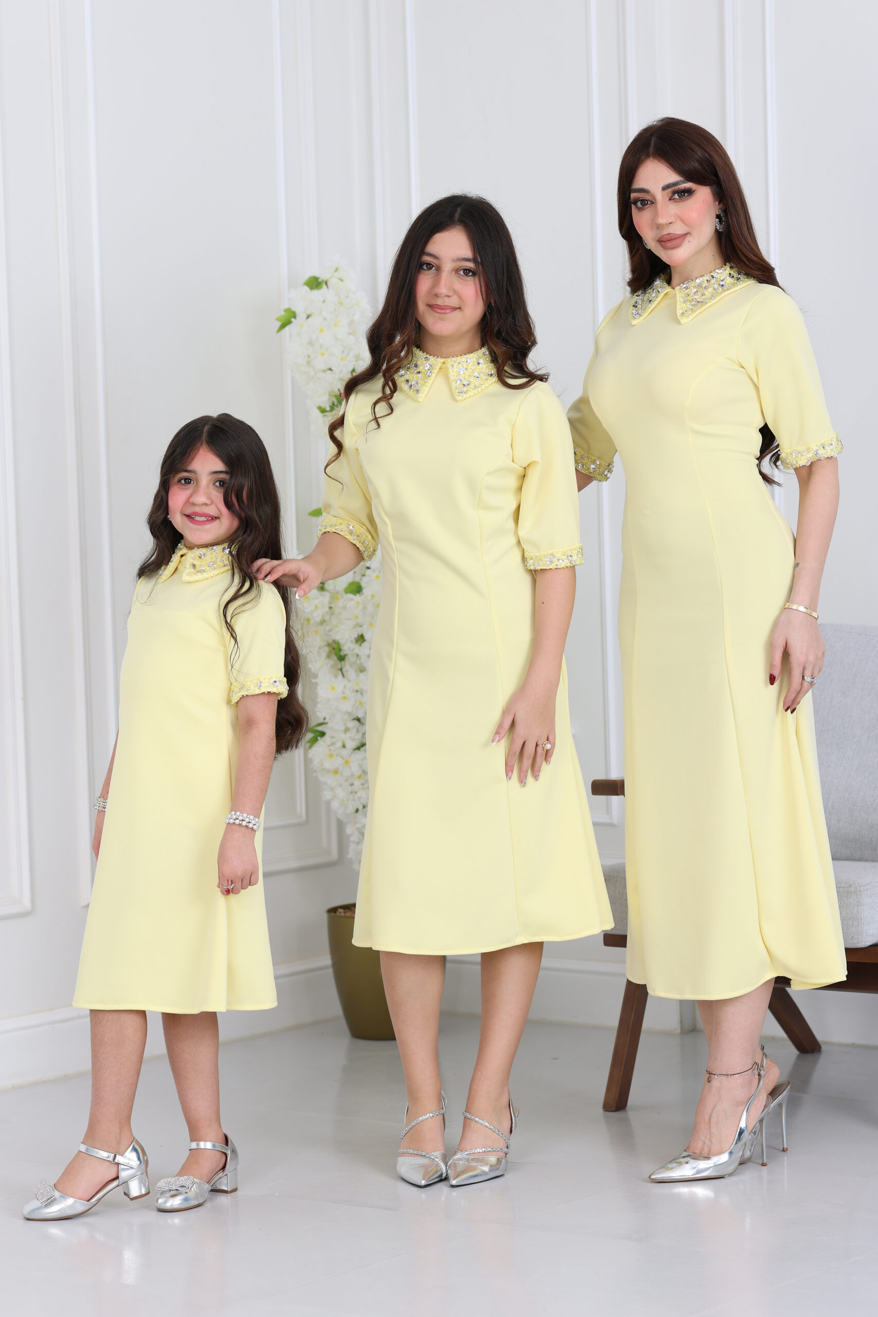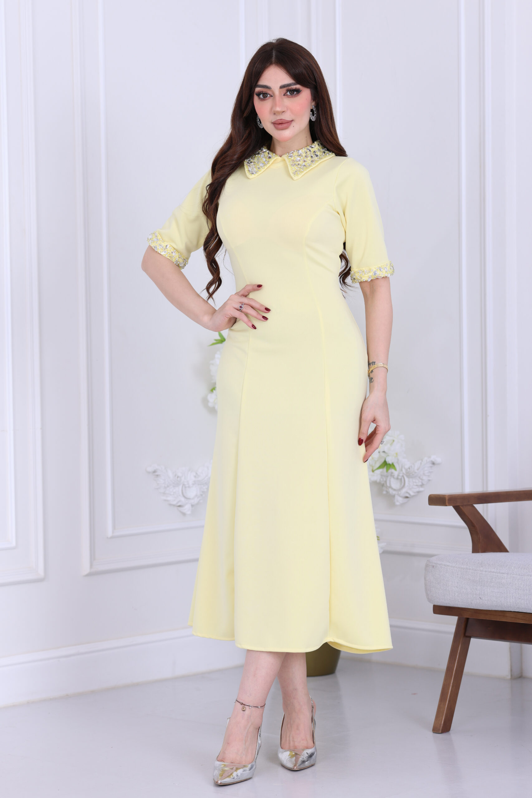 يتميز هذا الفستان بقصة “الميدي” الراقية التي تنسدل بنعومة تحت الركبة بأسلوب الحورية “ميرميد” الذي يبرز جمال القوام. الياقة تأتي بتصميم “بيتر بان” الكلاسيكي الفخم، مرصعة بالكامل بشغل الشك اليدوي بالكريستال اللامع والخرز الذي يمنح وجهك إشراقة مبهرة ويغنيكِ عن المجوهرات. الأكمام تأتي بطول متوسط يصل للكوع، ومزينة عند الأطراف بنفس تطريزات الياقة لتكمل جمال التصميم، مع طول متناسق يجمع بين العملية والفخامة في المناسبات الكبرى والغبقات الرمضانية الراقية.