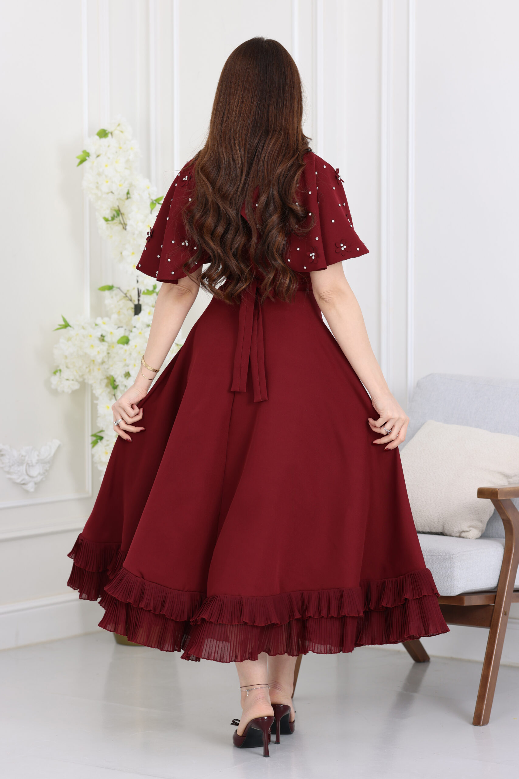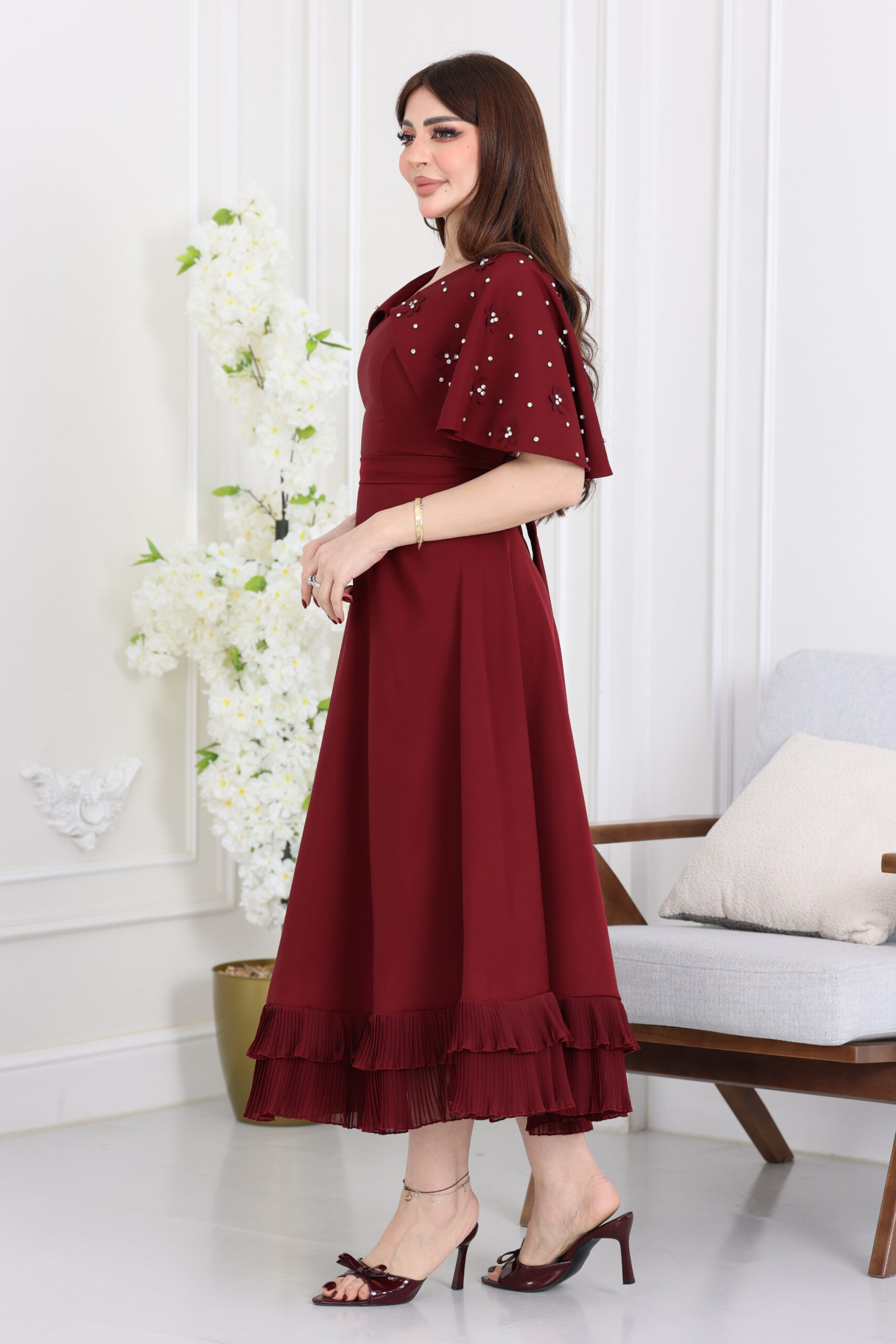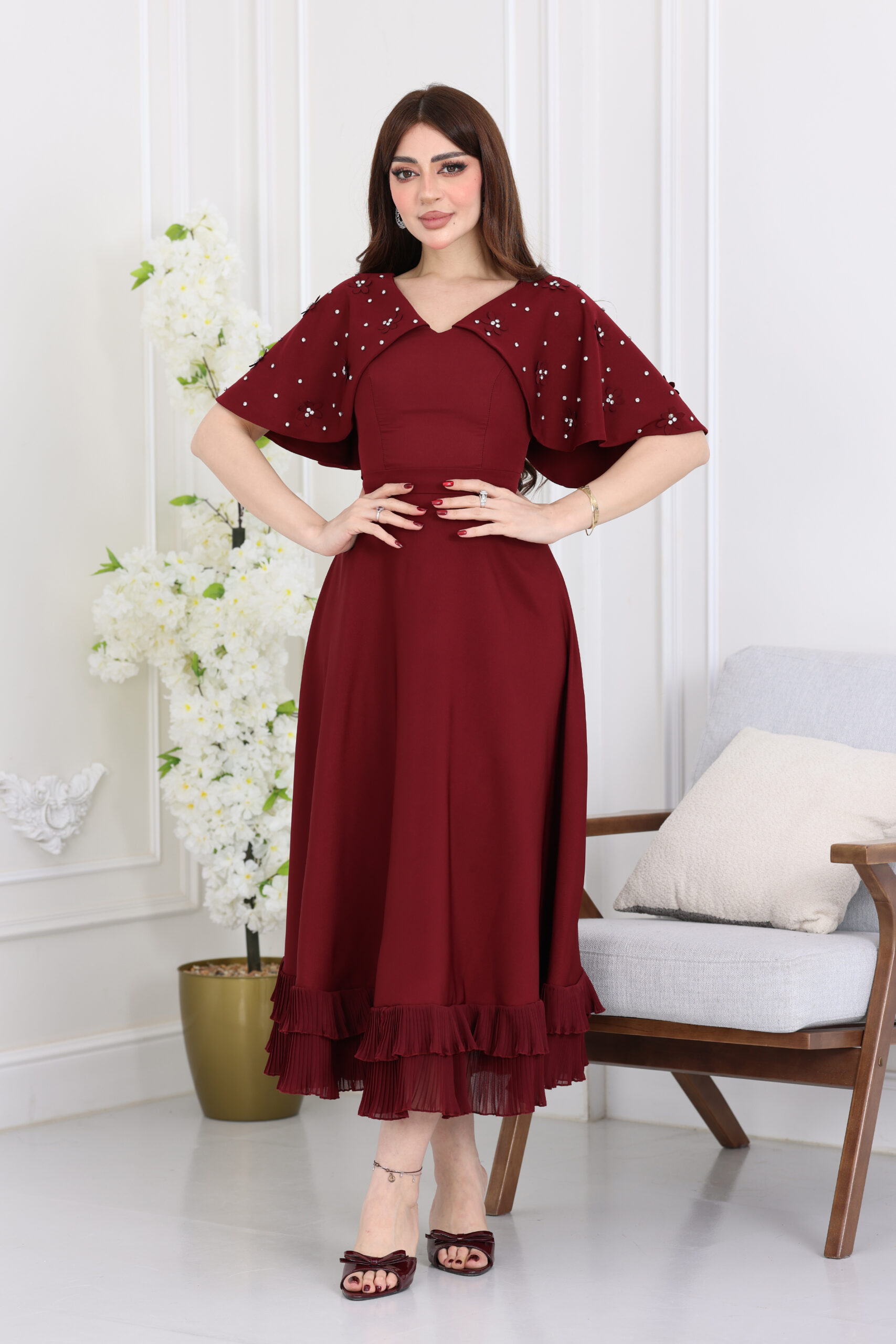 يتميز هذا الفستان بقصة “ميدي” عصرية تنسدل بنعومة تحت الركبة، مع “كيب” علوي فريد يغطي منطقة الصدر والأكتاف بأسلوب ملكي راقي. الكيب مرصع بالكامل بزهور لؤلؤية بارزة وفصوص كريستال لامعة موزعة بدقة لتعطي بريقاً ساحراً تحت الإضاءة. التصميم يأتي بياقة على شكل حرف V مريحة، مع أكمام قصيرة تندمج بسلاسة مع الكيب المطرز، وتنورة واسعة “كلوش” تنتهي بكشكشة “رافلز” ناعمة تعطي حركة انسيابية مذهلة عند المشي، مما يمنحكِ مظهر الكوتور الفخم اللي تبحثين عنه في سهراتك الكبرى.