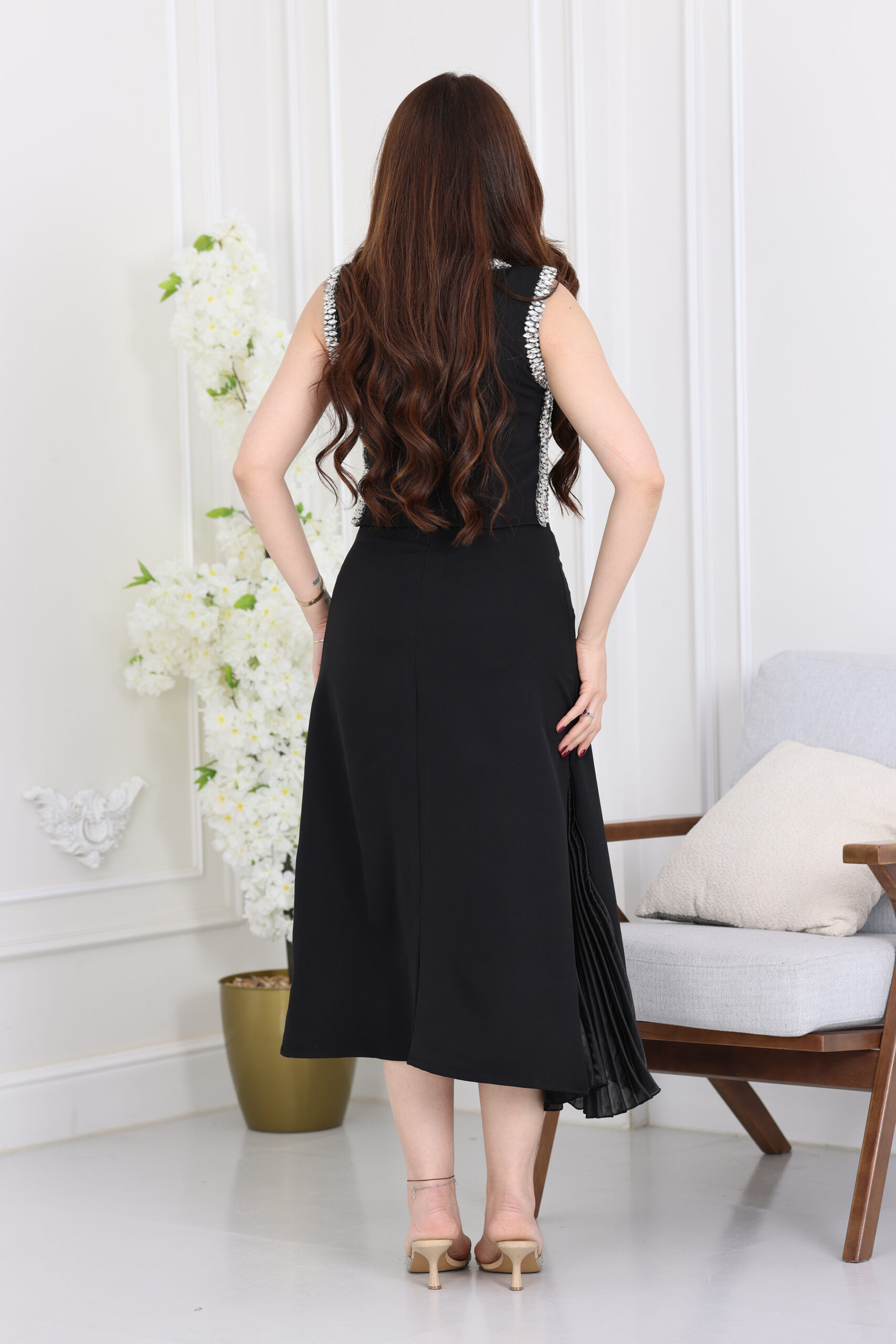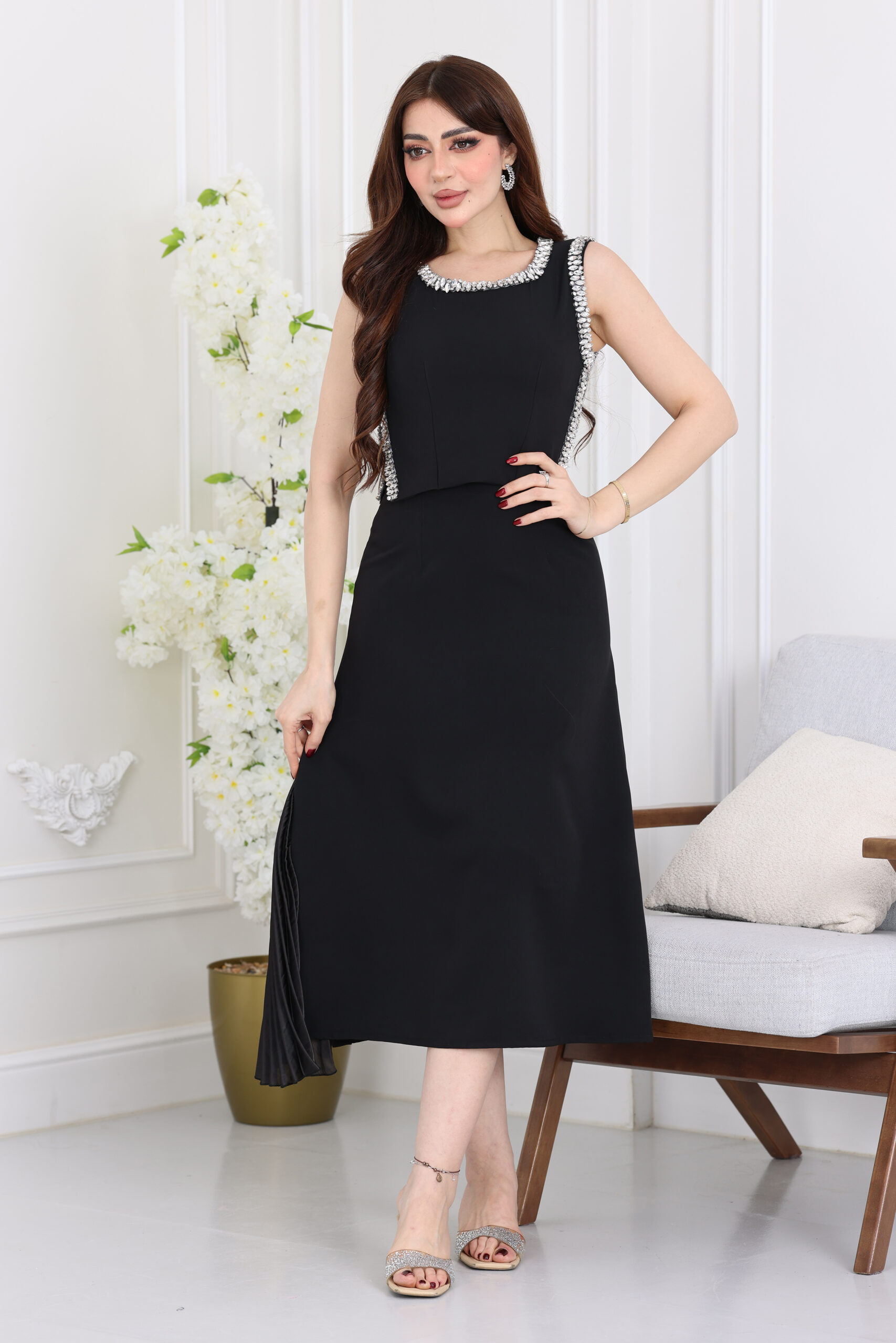 يتميز هذا الفستان بقصة “ميدي” عصرية تنسدل بنعومة تحت الركبة، مما يعطيكِ مظهراً أنيقاً ومريحاً في نفس الوقت. الياقة تأتي بتصميم دائري فخم مرصع بالكامل بشغل الشك اليدوي بقطع الكريستال الكبيرة والخرز اللامع الذي يمتد على طول خط الأكتاف والجانبين، مما يغنيكِ عن ارتداء الكثير من المجوهرات. التصميم بدون أكمام ليبرز جمال التطريز اليدوي، مع وجود فتحة جانبية “بليسيه” بكسرات دقيقة تمنح الفستان حركة انسيابية ساحرة عند المشي، وطول متناسق يجمع بين العملية والفخامة.