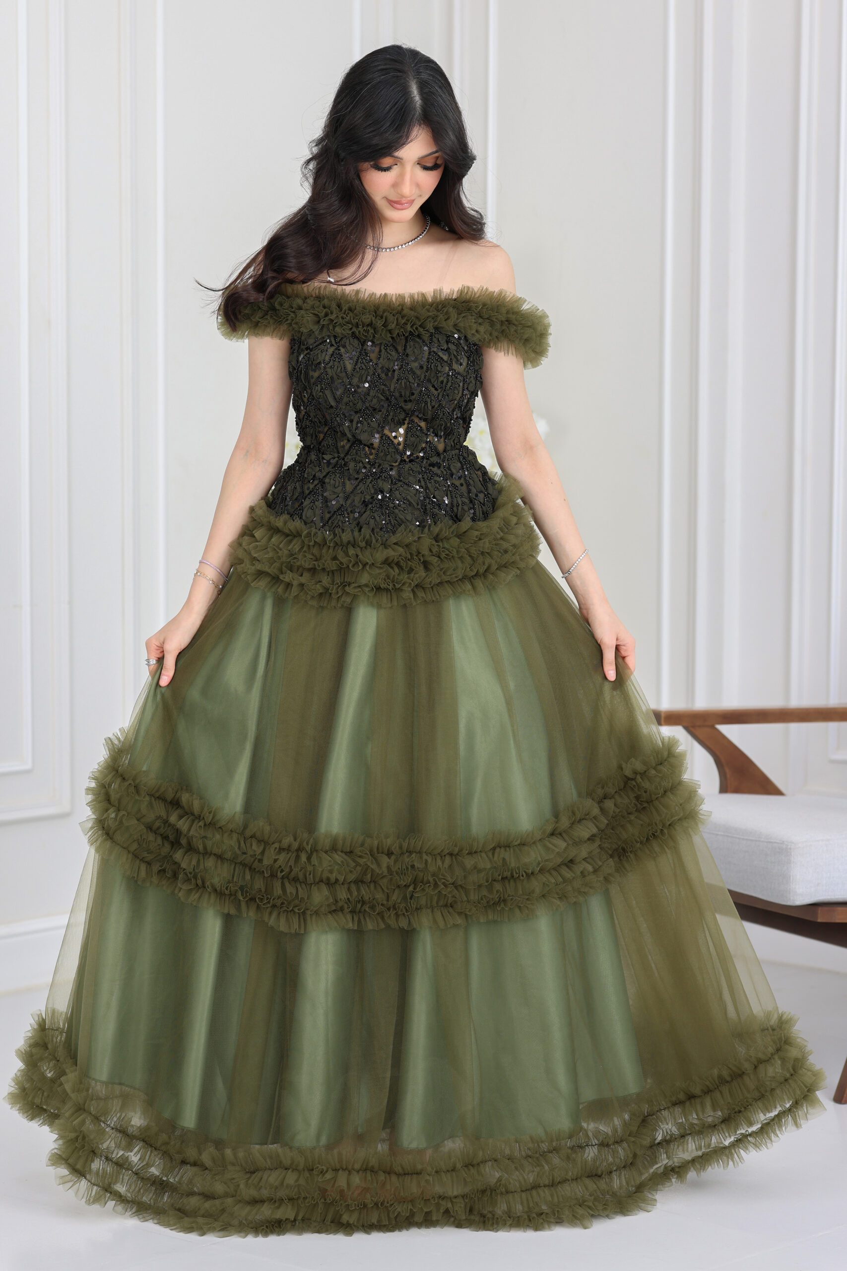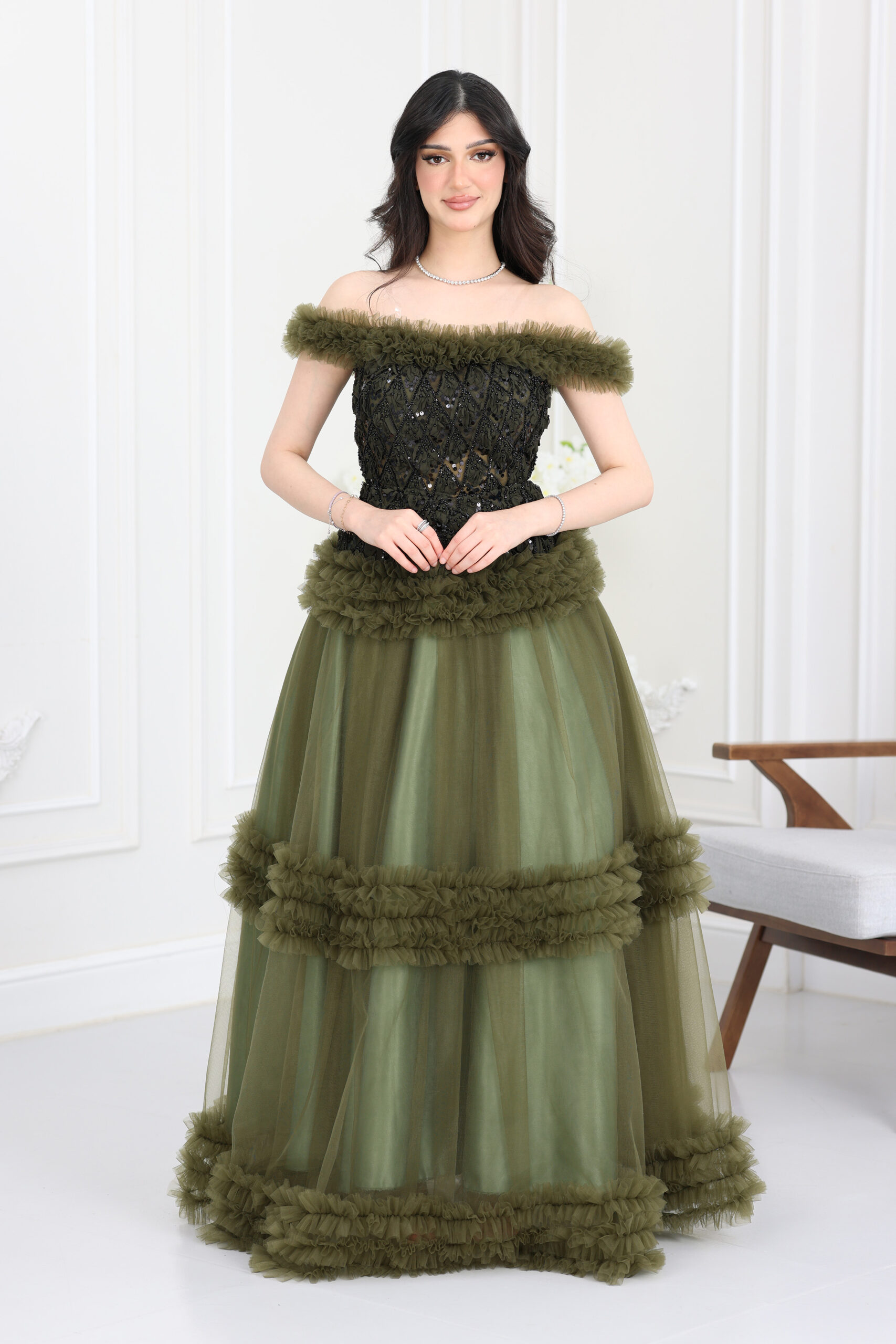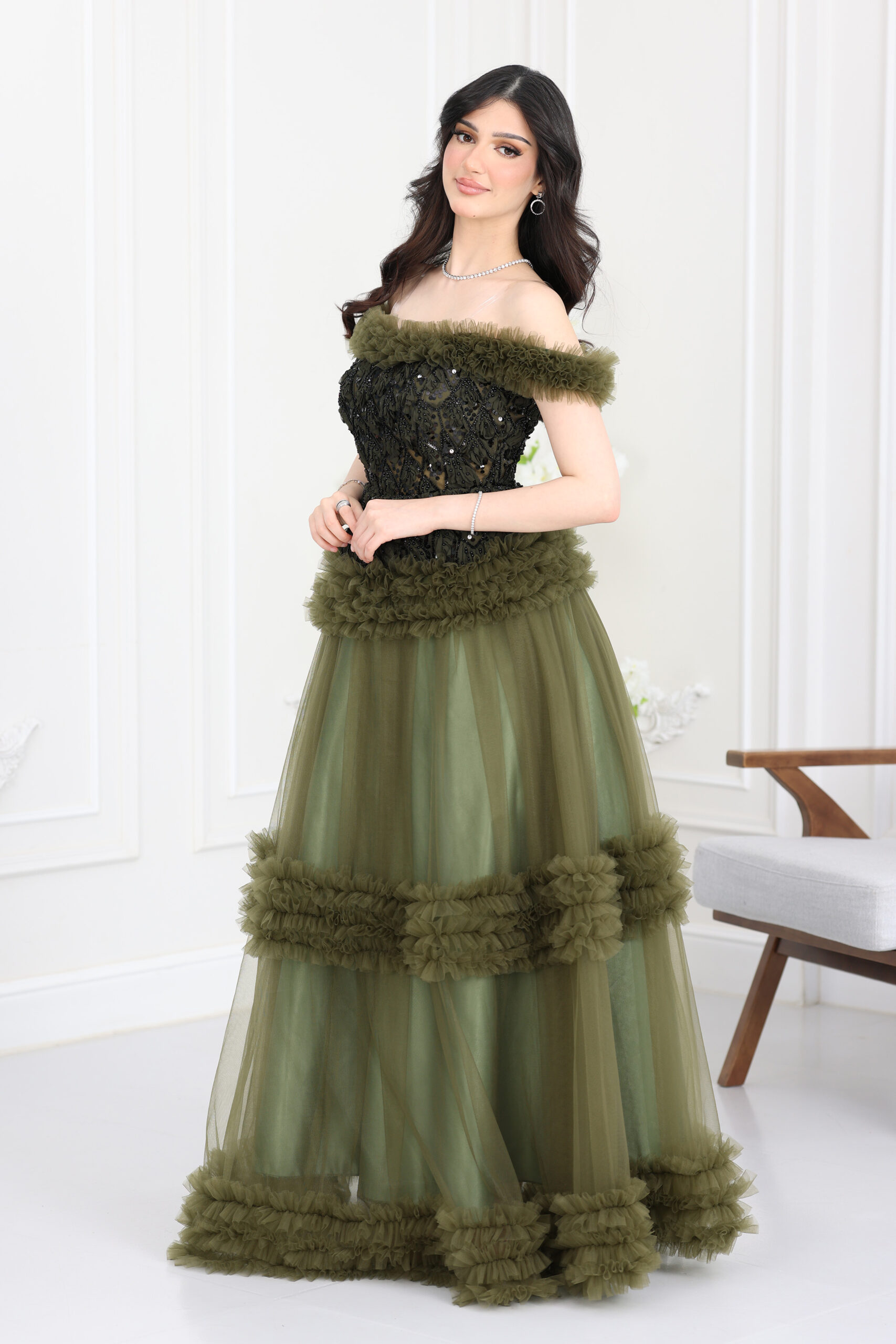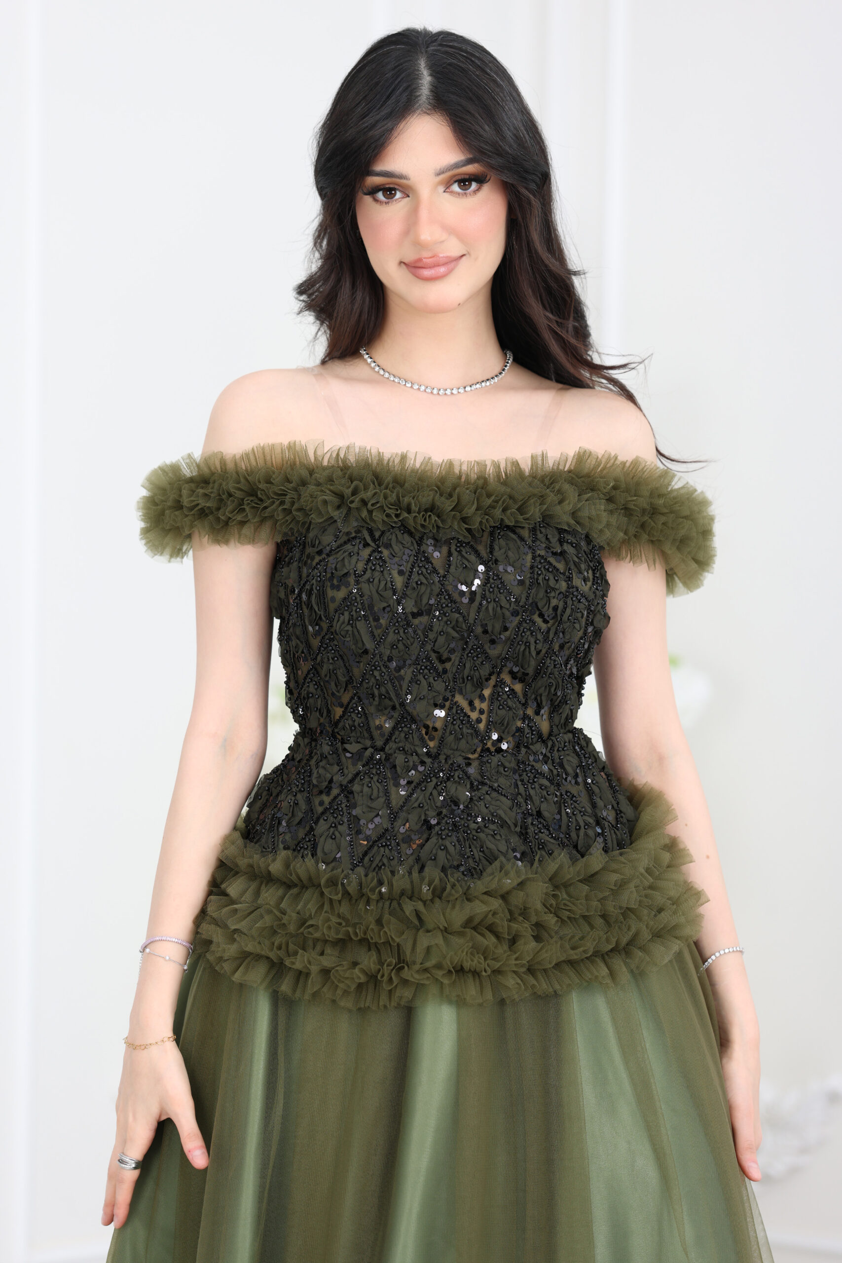 فستان فاخر سهرة يجسد الرقي المطلق ويمنحك حضوراً آسراً في أي مناسبة رسمية أو حفل خطوبة. يتميز بتصميم V-neck جذاب، أما الجزء العلوي فمُغطى بالكامل بتطريزات براقة ولامعة تنساب على الخصر، مما يضفي عمقاً وفخامة للقطعة. الأبرز في هذا الموديل هي الأكمام المنديل الطويلة والمنسدلة من الأكتاف بقماش شيفون ناعم، والتي تضفي درامية وسحراً للإطلالة الملكية. قصّة الفستان سفلية واسعة ومنسدلة، تمنحك راحة مثالية وحركة أنيقة. إذا كنتِ تبحثين عن أفخم فساتين المناسبات التي تجمع بين الحشمة والفخامة، فهذا الموديل هو الأفضل. اطلبيه الآن من المصمم الحديث وتألقي!