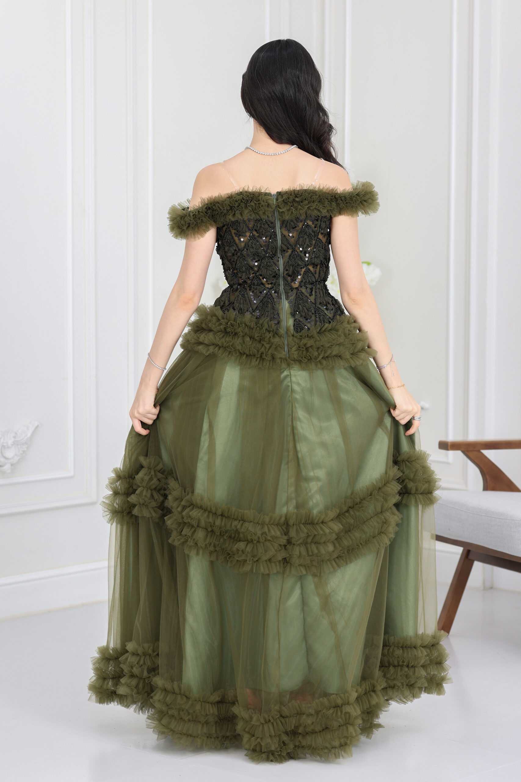 التخزين السليم: قومي بتخزين الفستان في مكان جاف ومنعزل عن الرطوبة للحفاظ على جمال الكريستالات والإكسسوارات.