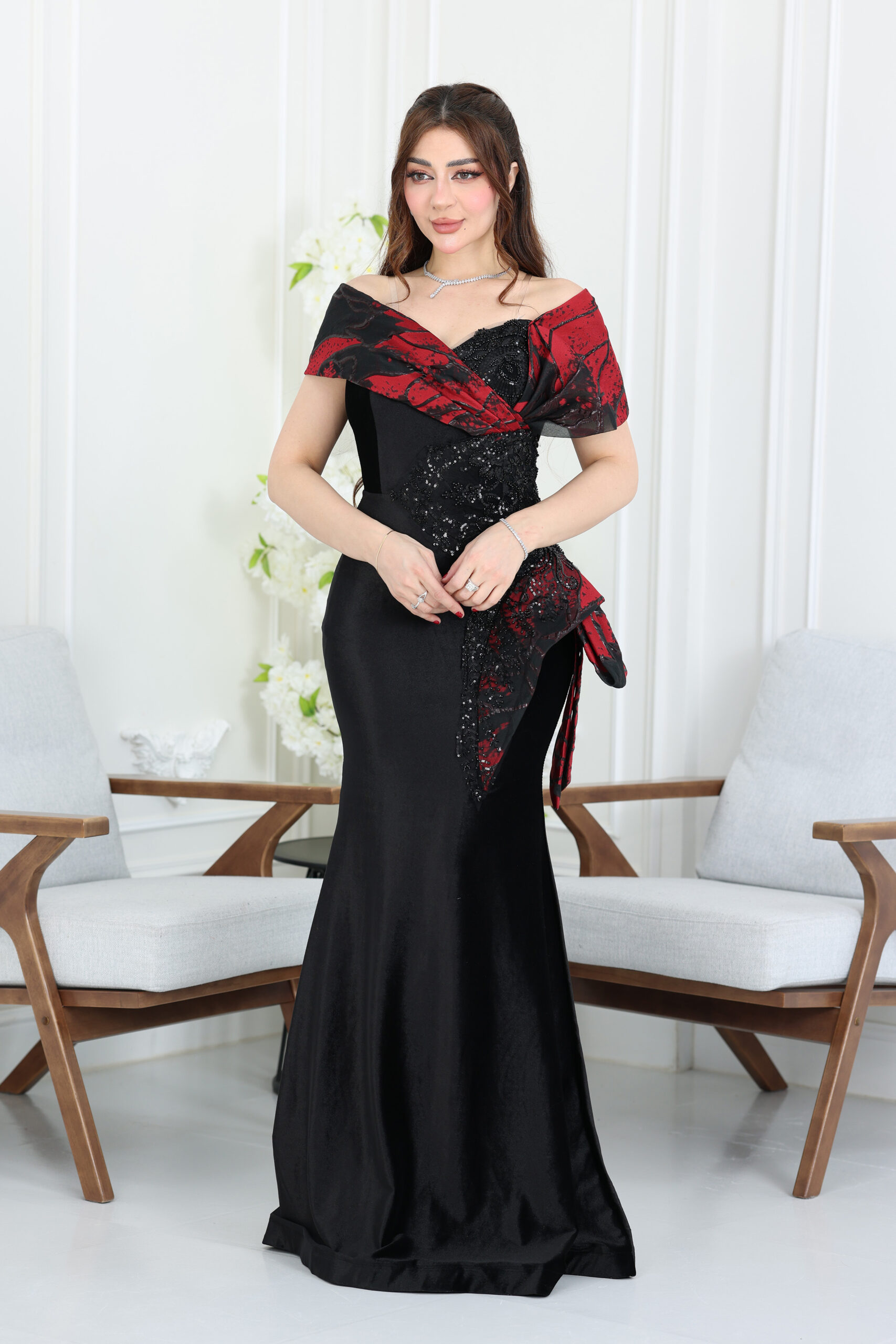 فستان مخمل ملكي طويل بتصميم يتميز بـ قصة أنيقة اللي تبرز جمال القوام وتمنحك إطلالة آسرة ومختلفة.  تزيد من الأنوثة والرقي. الجزء العلوي مُزين بالكامل وتطريز متقن، يخلي الفستان يبرق في الإضاءة. أجمل ما في التصميم هو الوشاح الجانبي الأنيق اللي يتدلى من الخصر، وهاللمسة العصرية تزيد من الجاذبية وتمنح الفستان فخامة إضافية. الفستان طويل وبخامة ناعمة ومريحة في اللبس.هذا الموديل الأنيق من المصمم الحديث يضمن لكِ تميزاً وإطلالة ملكية لا تُنسى. لا تترددي في طلب هذا الفستان المخصر قبل نفاذ الكمية
