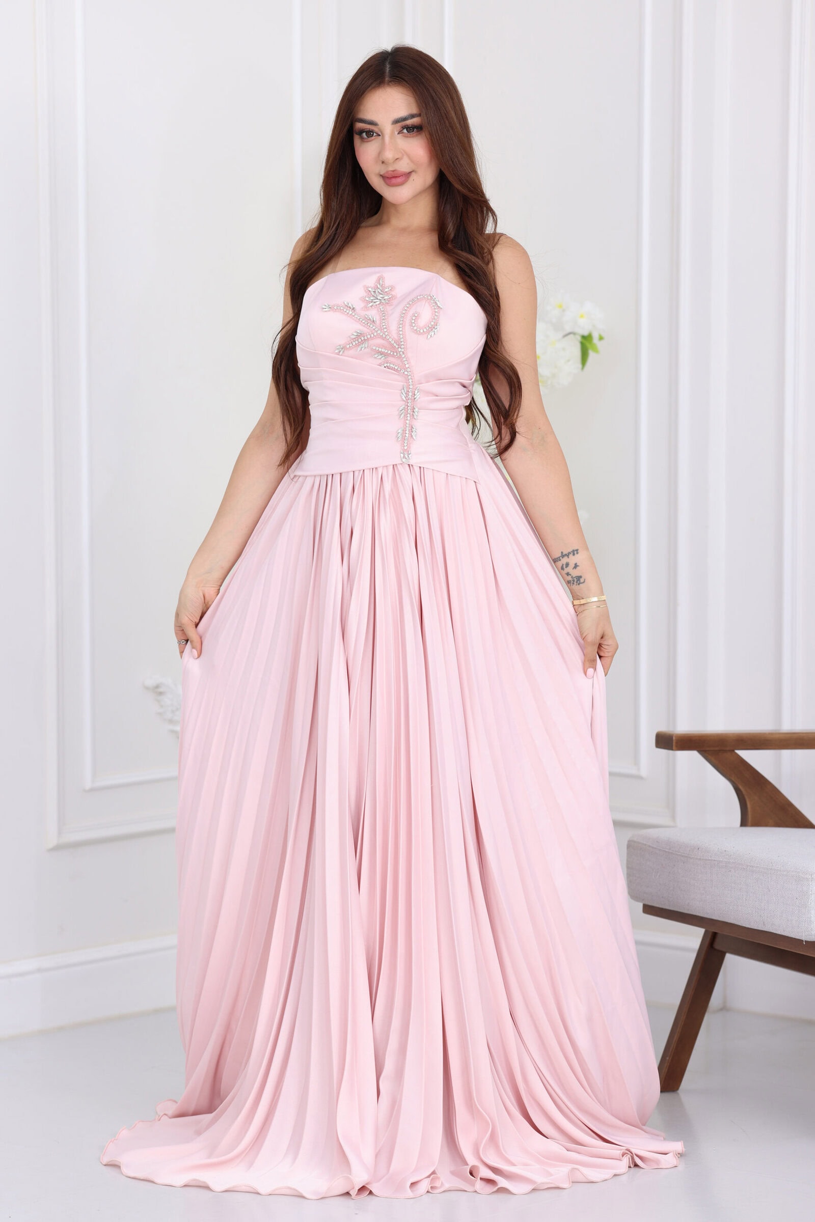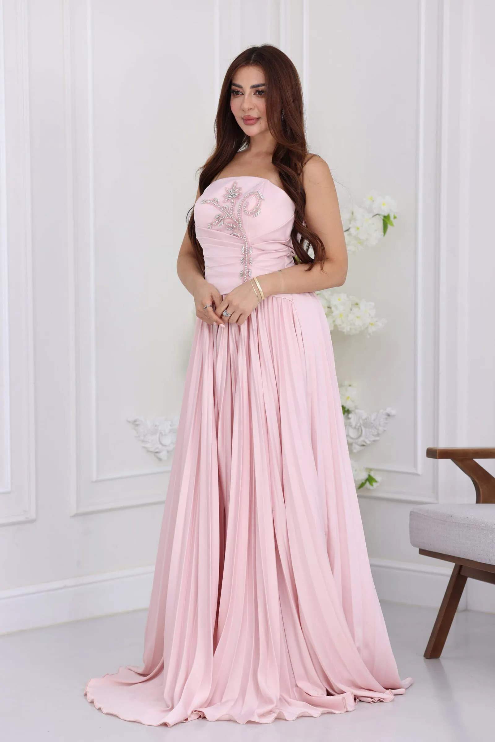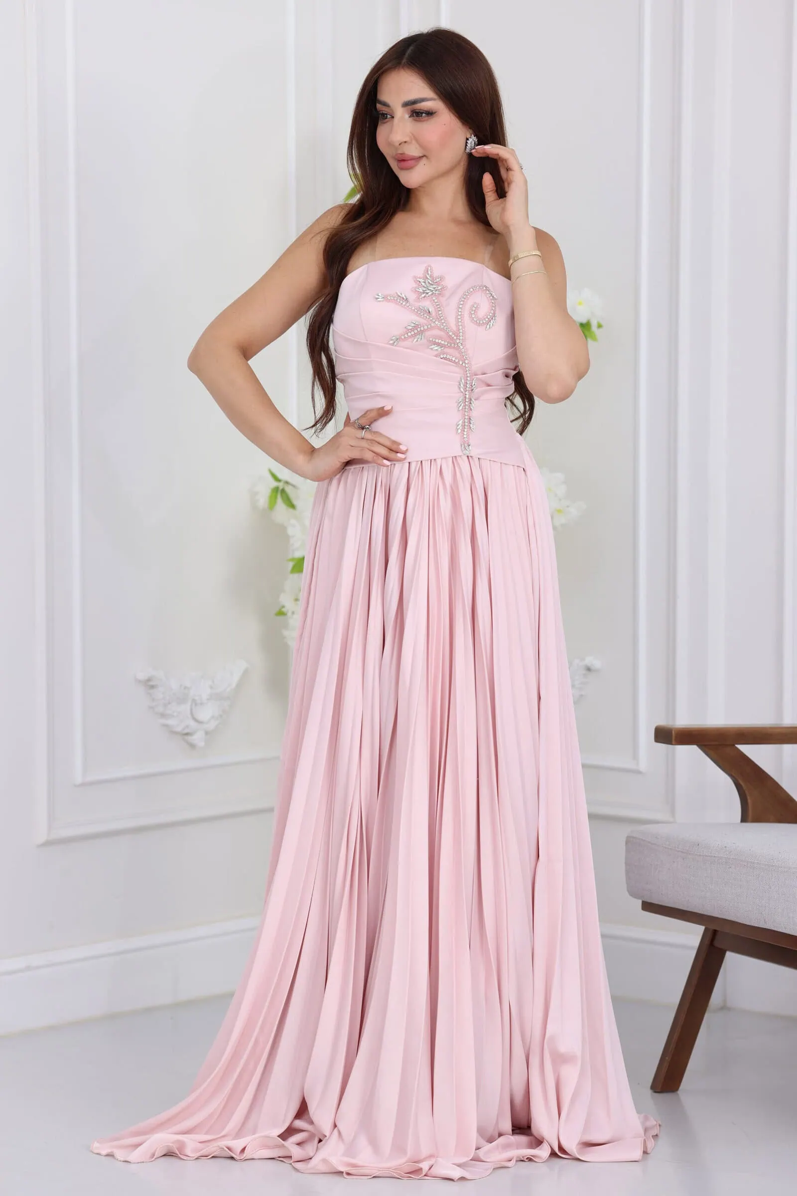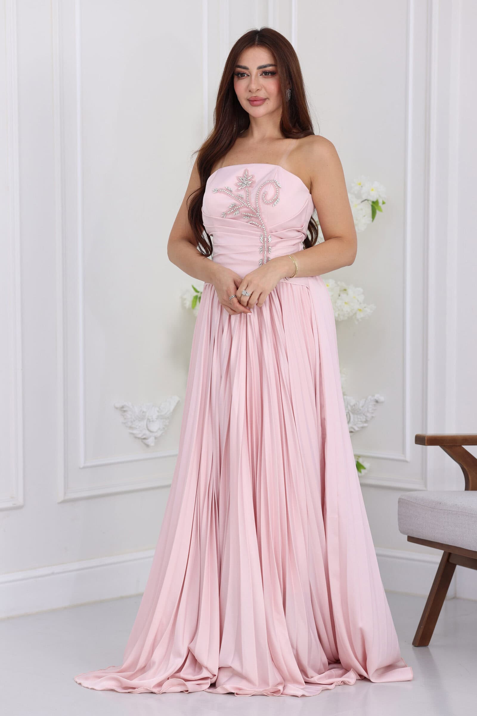 يتميز الفستان بقصة “توب” (بدون أكمام) تبرز جمال العنق والأكتاف برقي متناهٍ، مع تصميم “درابيه” ناعم على الصدر يزدان بتطريز يدوي فاخر من الكريستال والخرز اللامع على شكل أغصان شجر تنساب بنعومة. أما الجزء السفلي فيأتي بتنورة طويلة ومنسدلة بخامة البليسيه (المكسر) التي تعطي حركة انسيابية ملكية مع كل خطوة، مما يمنحكِ قواماً طويلاً ورشيقاً وطلة تفيض بالأنوثة.