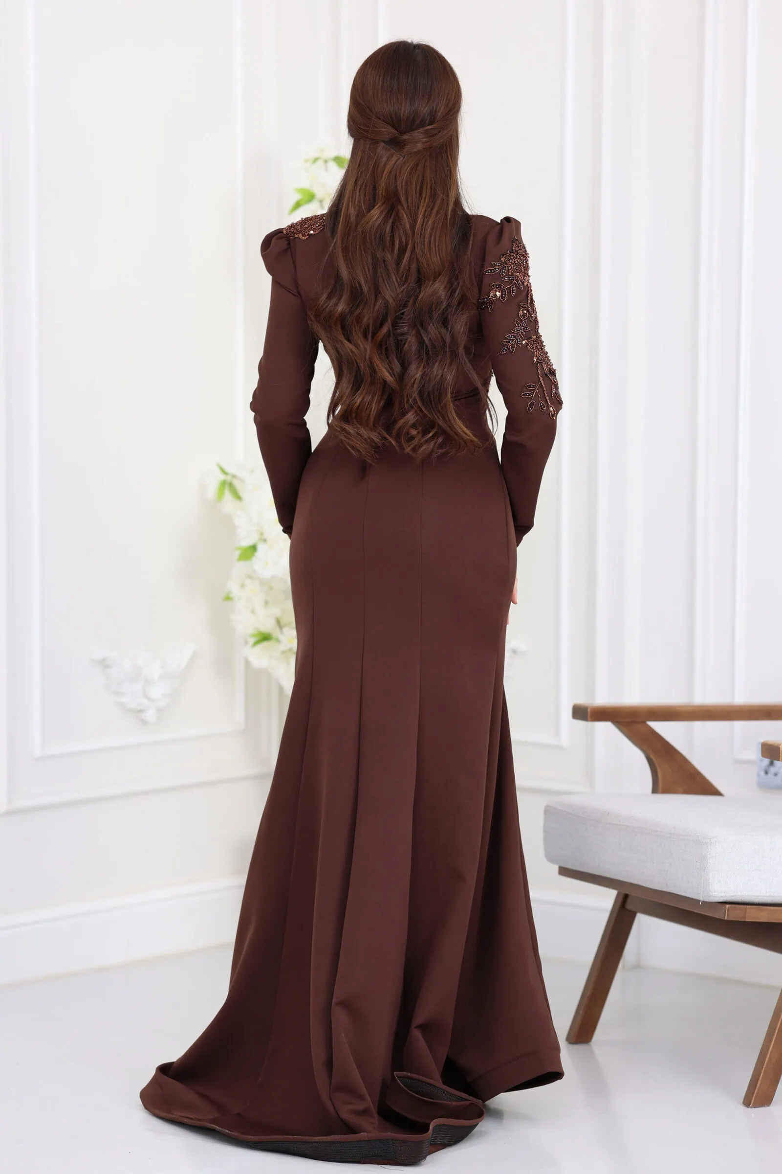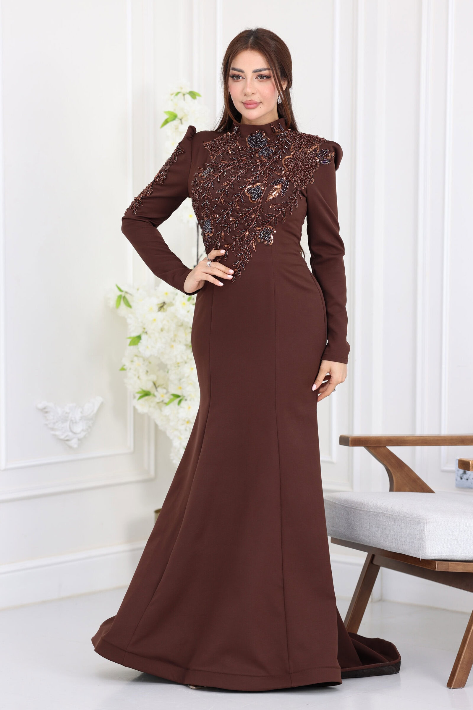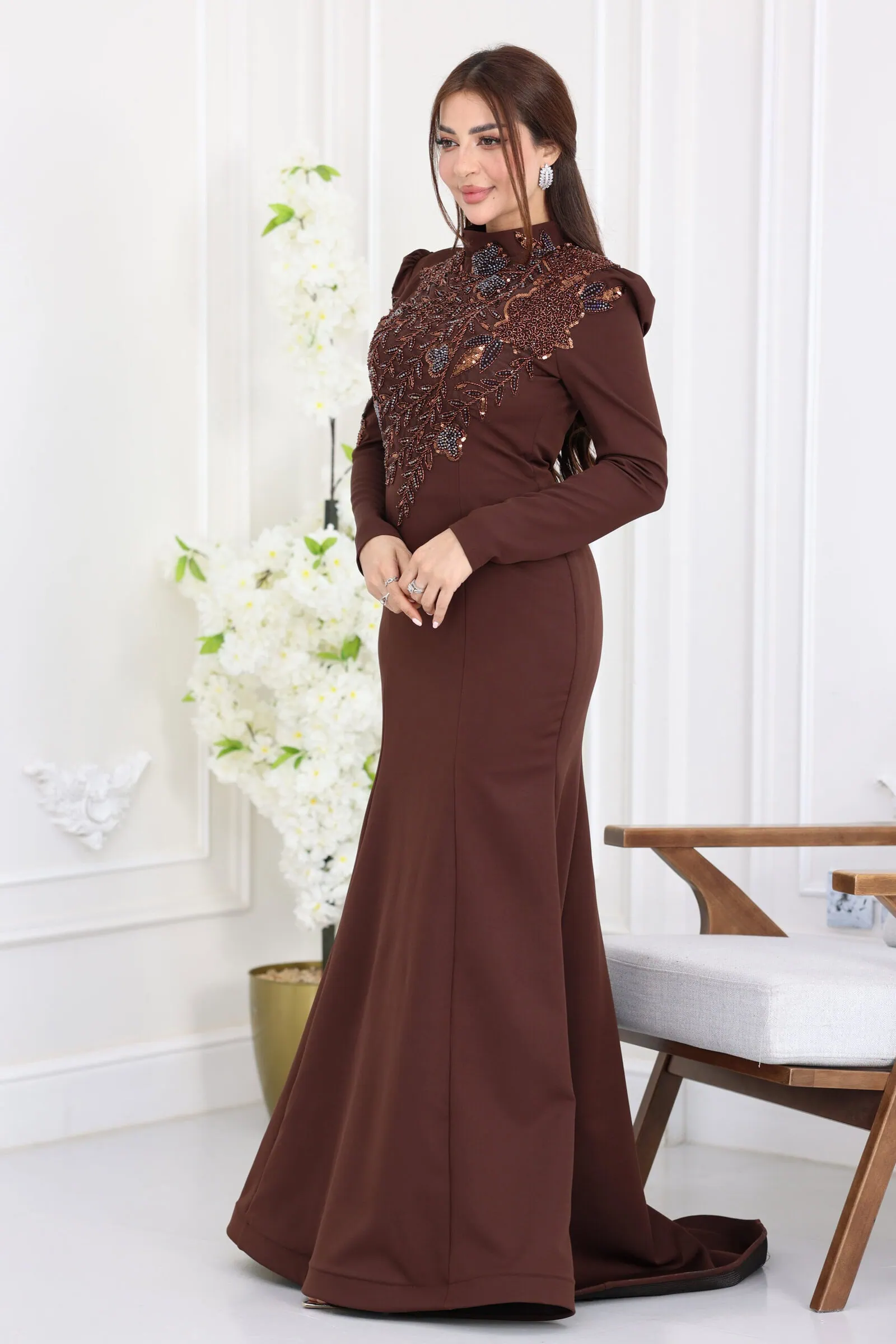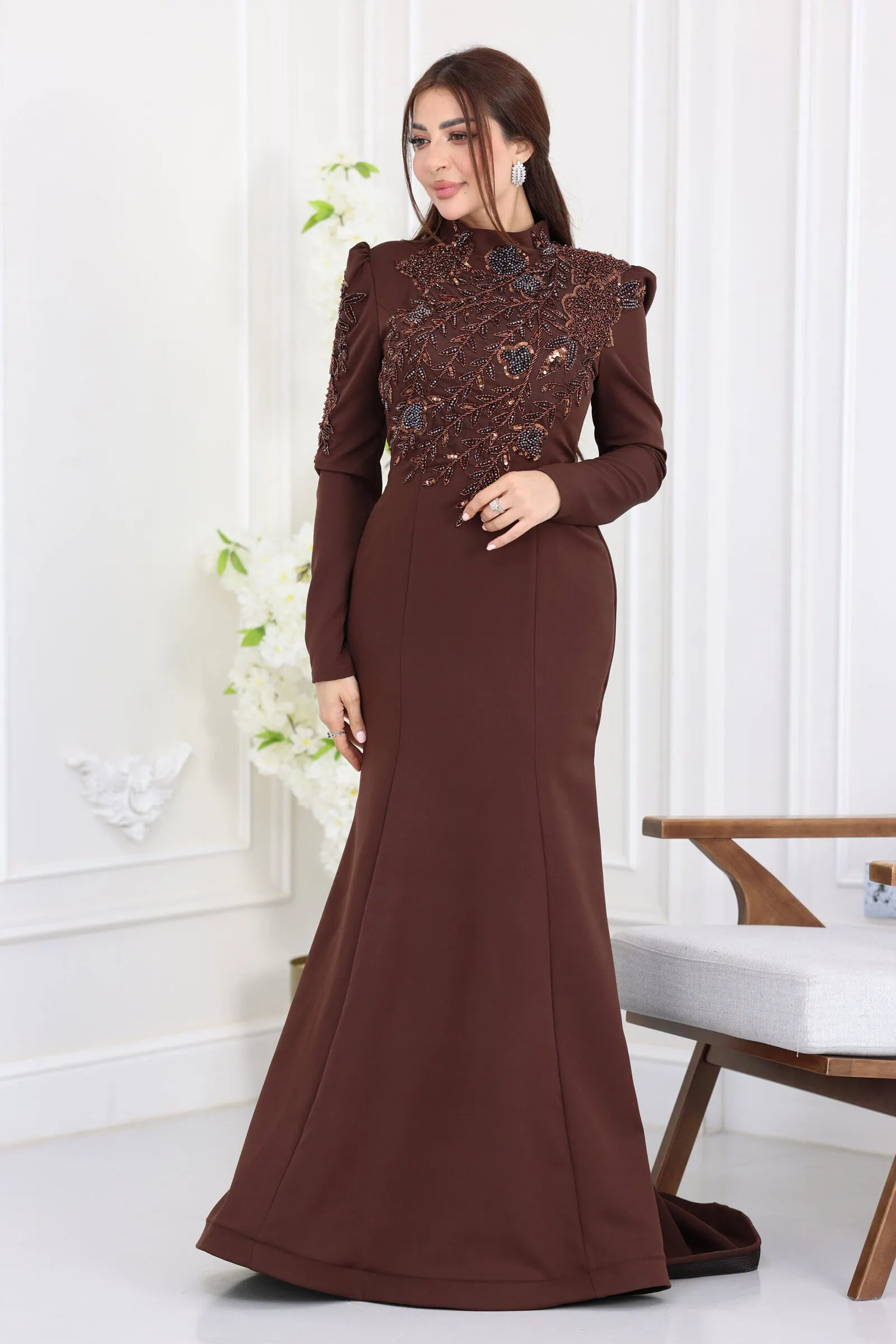 يأتي الفستان بقصة “السمكة” (Mermaid) الشهيرة التي تبرز جمال القوام برقي متناهٍ، مع أكمام طويلة تتميز بـ “بف” خفيف عند الأكتاف ليعطيكِ حضوراً مهيباً. ما يميز هذا الموديل هو الشك اليدوي الكثيف والمتقن بالخرز والكريستال اللامع الذي يغطي كامل منطقة الصدر والأكتاف وينساب برقة نحو الخصر، مما يعكس بريقاً أخاذاً تحت الأضواء، مع ياقة عالية تضفي لمسة من الحشمة والفخامة الفرنسية.