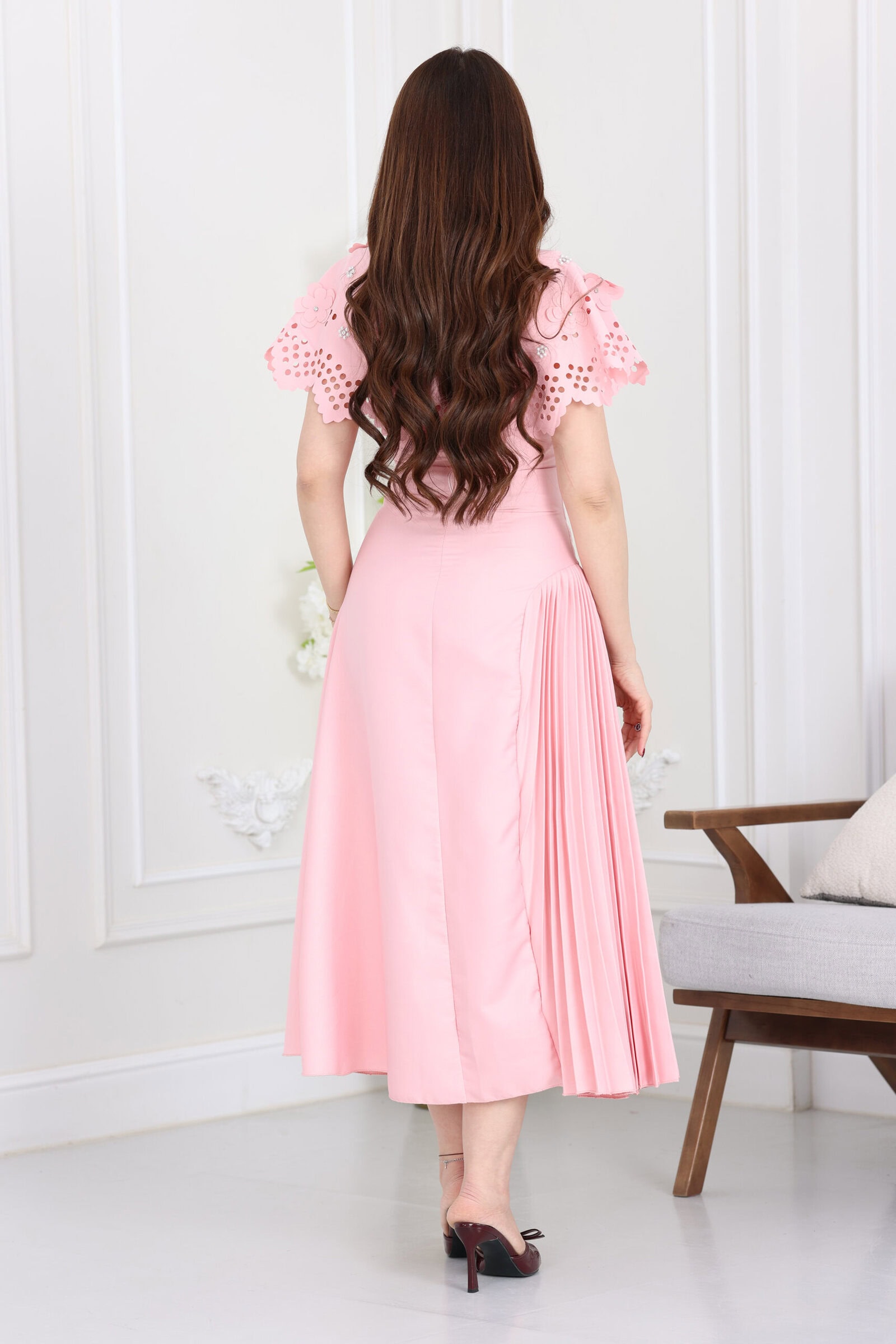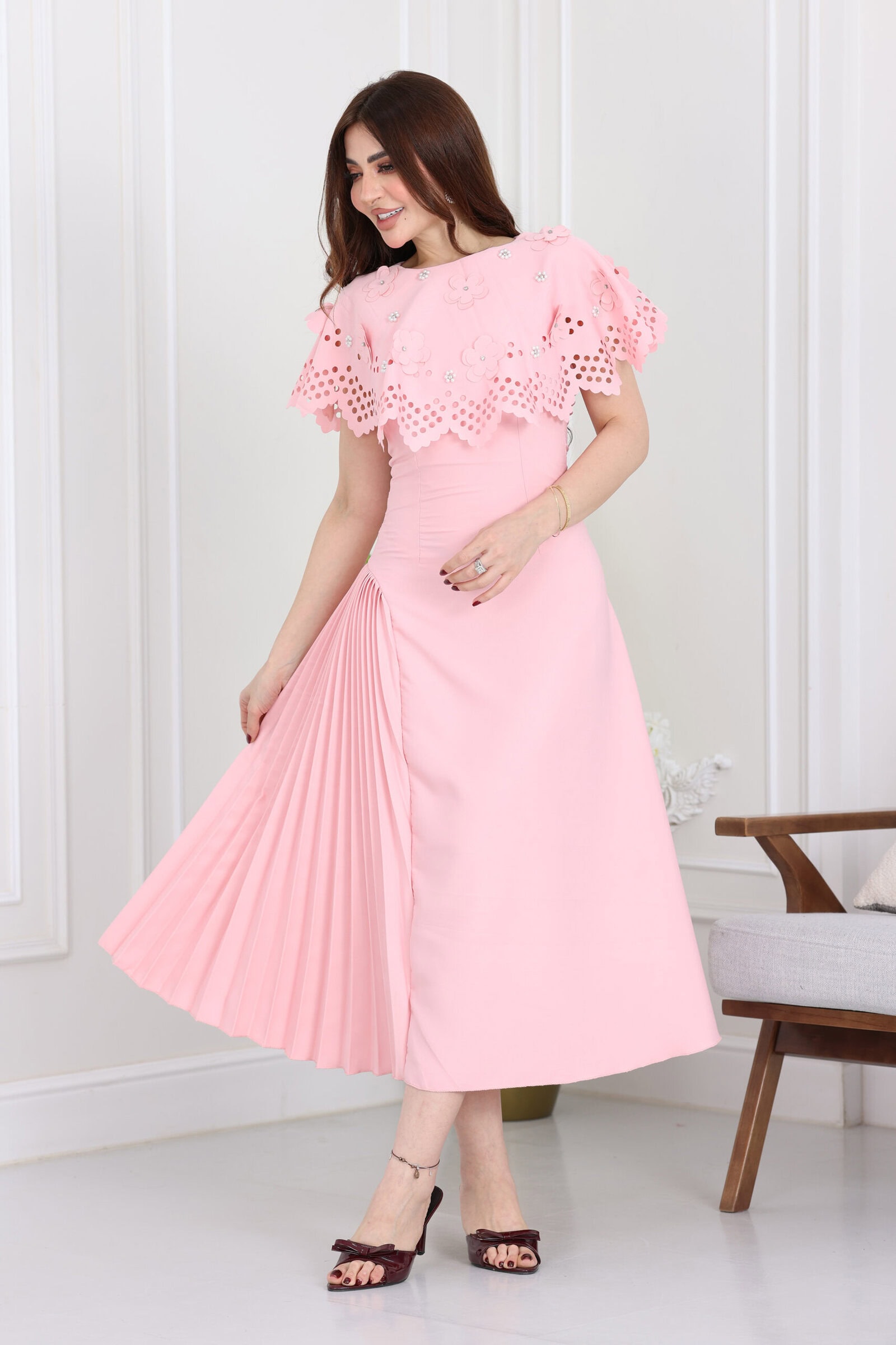 يتميز هذا الفستان بقصة “ميدي” عصرية تنسدل بنعومة تحت الركبة، مما يعطيكِ مظهراً أنيقاً ومريحاً في نفس الوقت. الياقة تأتي بتصميم مغطى بـ “كيب” علوي فريد مشغول بتقنية قص الليزر الدقيقة على شكل أزهار بارزة، مرصعة في منتصفها بحبات اللؤلؤ والكريستال اللامع اللي يعطي بريقاً ساحراً تحت الإضاءة. التصميم يأتي بخصر محدد يبرز جمال القوام، مع وجود فتحة جانبية “بليسيه” بكسرات دقيقة تمنح الفستان حركة انسيابية مذهلة عند المشي، مما يجمع بين العملية والفخامة.