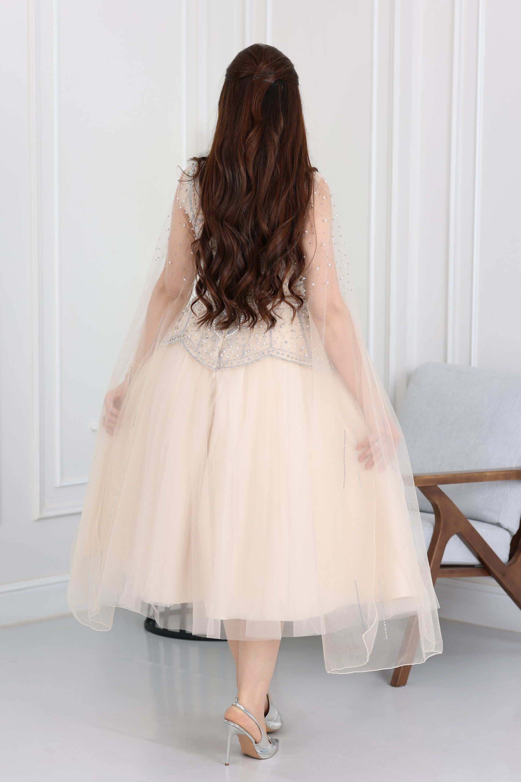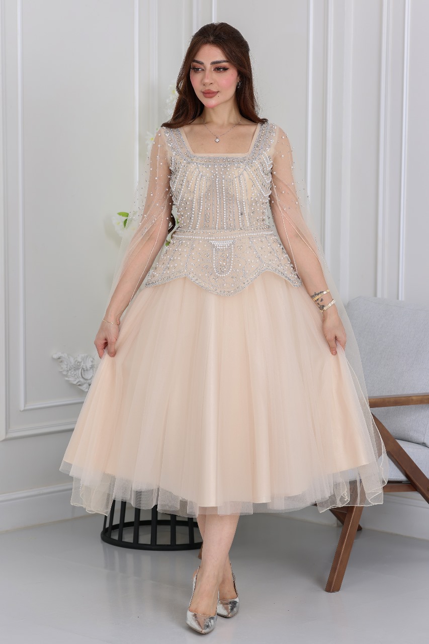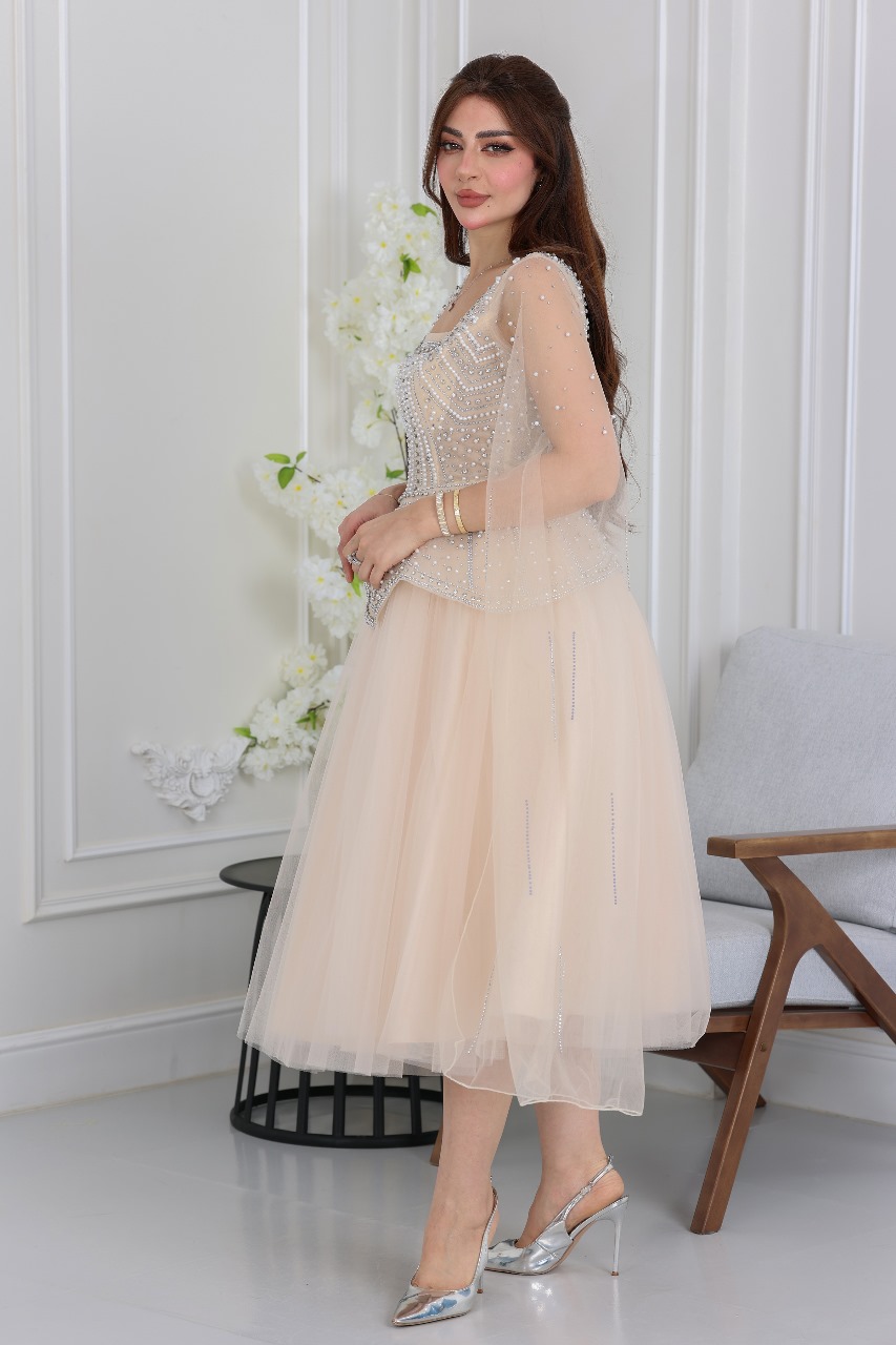 فستان ميدي شك منفوش بتصميم يركز على الفخامة المضيئة. التوب العلوي مُزين بالكامل بالشك اليدوي والكريستال البراق بتصميم هندسي راقٍ، وهذا الشغل المتقن يضمن لكِ جاذبية وبريقاً يلفت الأنظار. يتميز الفستان بـ قصة البيبلوم الأنيقة عند الخصر، مع ياقة مربعة جذابة تنورة الفستان بقصة ميدي (متوسطة الطول)، وهي مصممة من التل المنفوش بطبقات، وهذا يعطيه حجم جميل وحركة ساحرة. الأكمام الطويلة والشفافة المرفقة من التل المشكوك تزيد من الاحتشام والرقي. هذا الموديل الراقي يجعلكِ تتألقين ويبرز جمال الإطلالة اطلبيه الآن من المصمم الحديث!