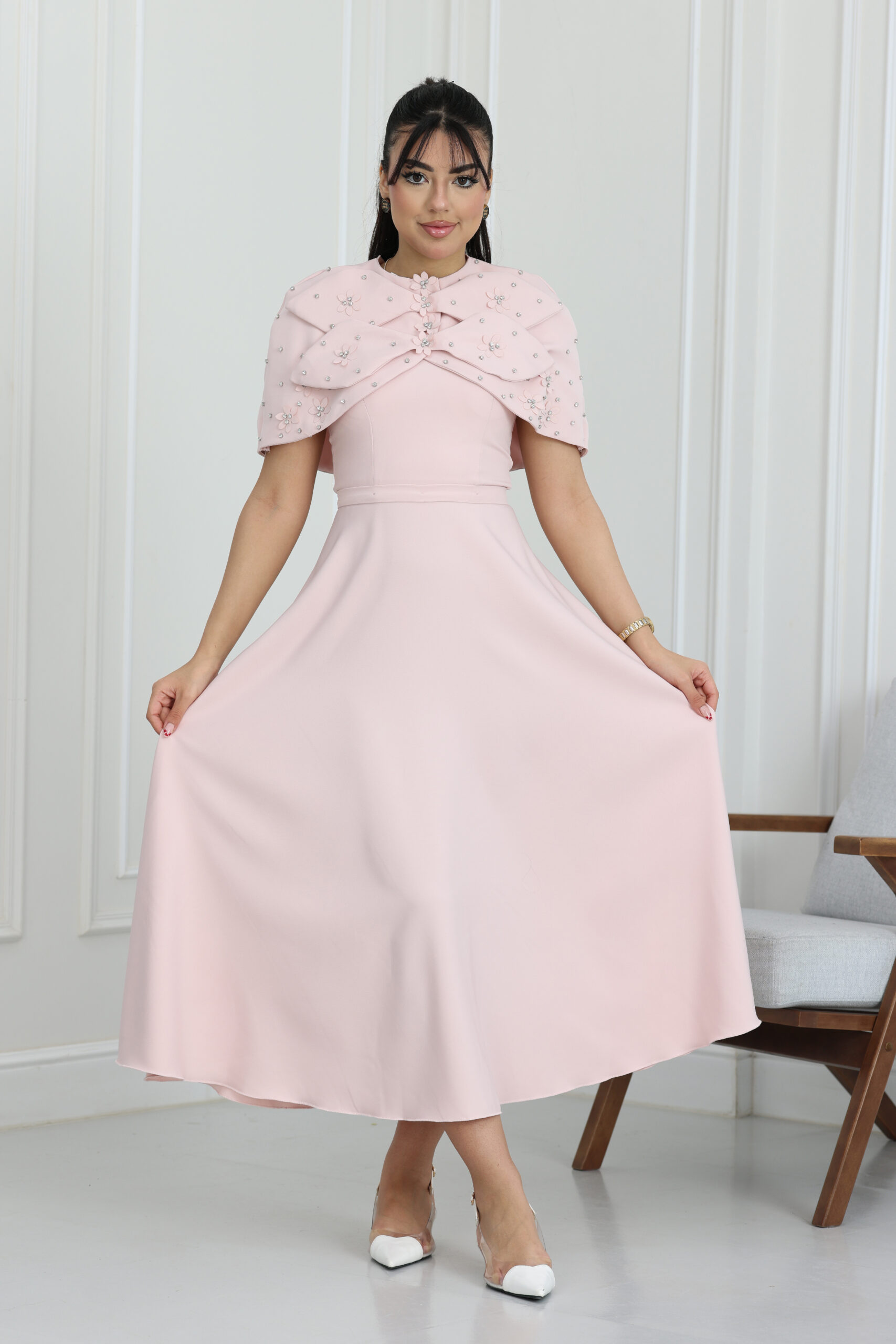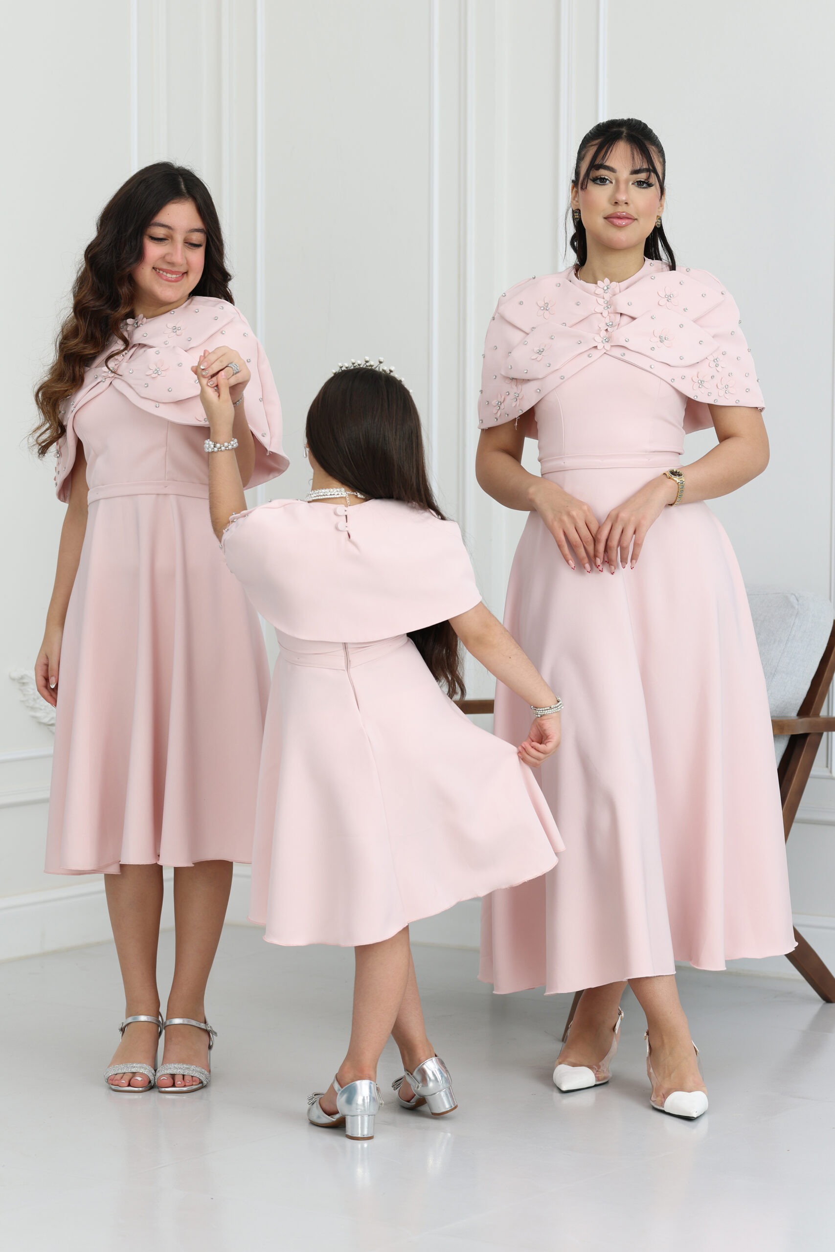 يتميز الفستان بتصميم ملكي مبتكر، حيث تبرز “فيونكة” كبيرة تزين منطقة الصدر والكتفين بشكل دراماتيكي وساحر، مرصعة بورود كريستالية وخرز لامع يضفي لمسة من البريق والشياكة. الموديل يجي بقصة منسدلة تحدد الخصر بجمالية، مع طول ميدي يتناسب تماماً مع ذوق المجتمع السعودي الراقي. يتوفر الموديل بمقاسات متطابقة للأم والبنت لطلة “توينز” تخطف الأنظار في العيد وكل مناسباتكم السعيدة، مما يجعله الخيار الأول ضمن فساتين بنات للعيد.