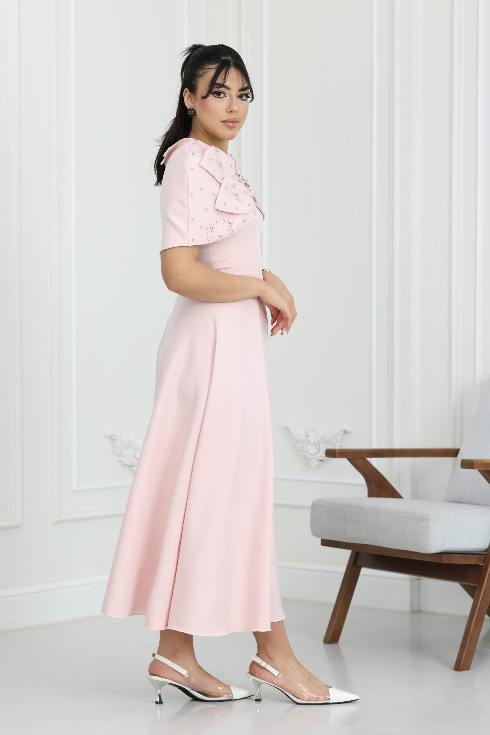 حرصنا في “المصمم الحديث” على اختيار خامة “كريب فاخر” تمتاز بالنعومة وبرودة الملمس لتضمان الراحة طوال فترة الارتداء. القماش ثقيل بما يكفي ليحافظ على شكل الفستان والفيونكة ثابت وجميل، كما أنه مزود ببطانة داخلية كاملة ناعمة تمنع الشفافية تماماً. الجودة هنا تتحدث عن نفسها، من متانة الخياطة إلى دقة تثبيت الكريستالات، لضمان استمرار القطعة بجمالها الأصلي حتى مع تكرار اللبس، ليكون استثماراً رائعاً في خزانتك.