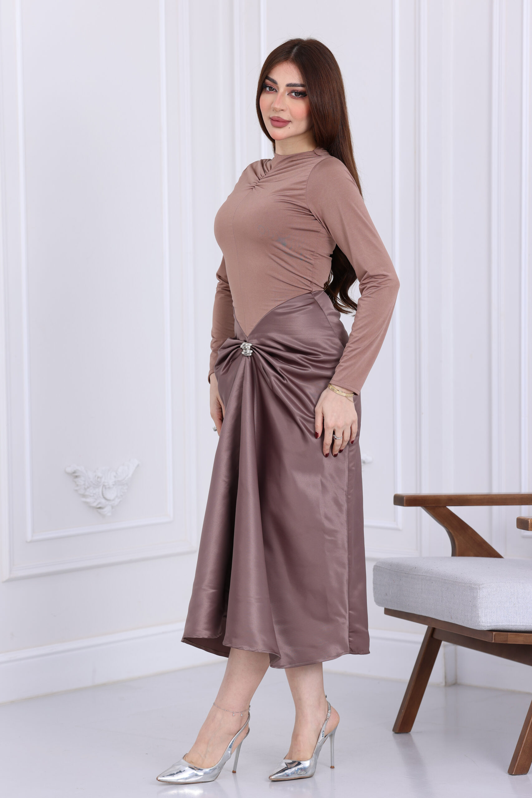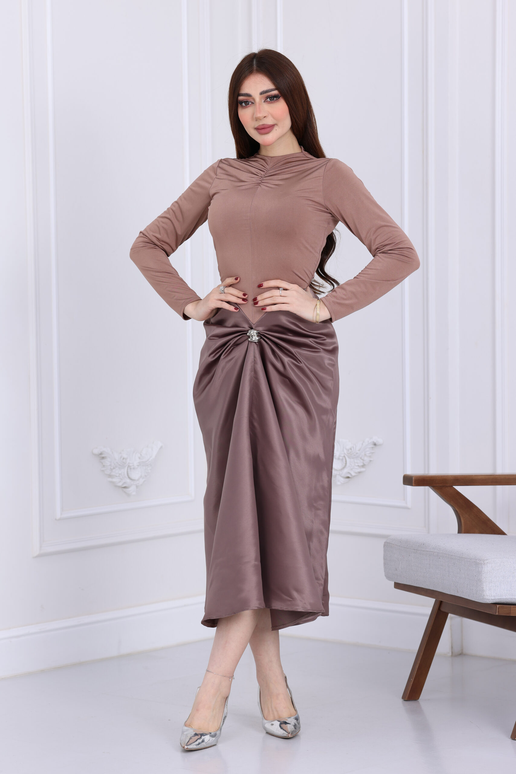يتميز هذا الفستان بقصة “المرميد” أو الحورية التي تبرز جمال القوام بأسلوب راقي ومحتشم في نفس الوقت. الياقة تأتي بتصميم هاي نيك فخم يمنح الرقبة طولاً وجمالاً، مع أكمام طويلة ضيقة تزيد من فخامة المظهر. أكثر ما يميز الموديل هو الشغل الفني عند منطقة الخصر، حيث يأتي بتصميم “درابيه” أو كسرات يدوية متداخلة تلتقي في عقدة مركزية أمامية مرصعة ببروش مربع من الكريستال اللامع، مما يعطي إيحاءً بالرشاقة وتفاصيل الكوتور العالمية، مع طول ميدي يتجاوز الركبة ليمنحكِ مظهر السهرات الأنيق والعملي في آن واحد.