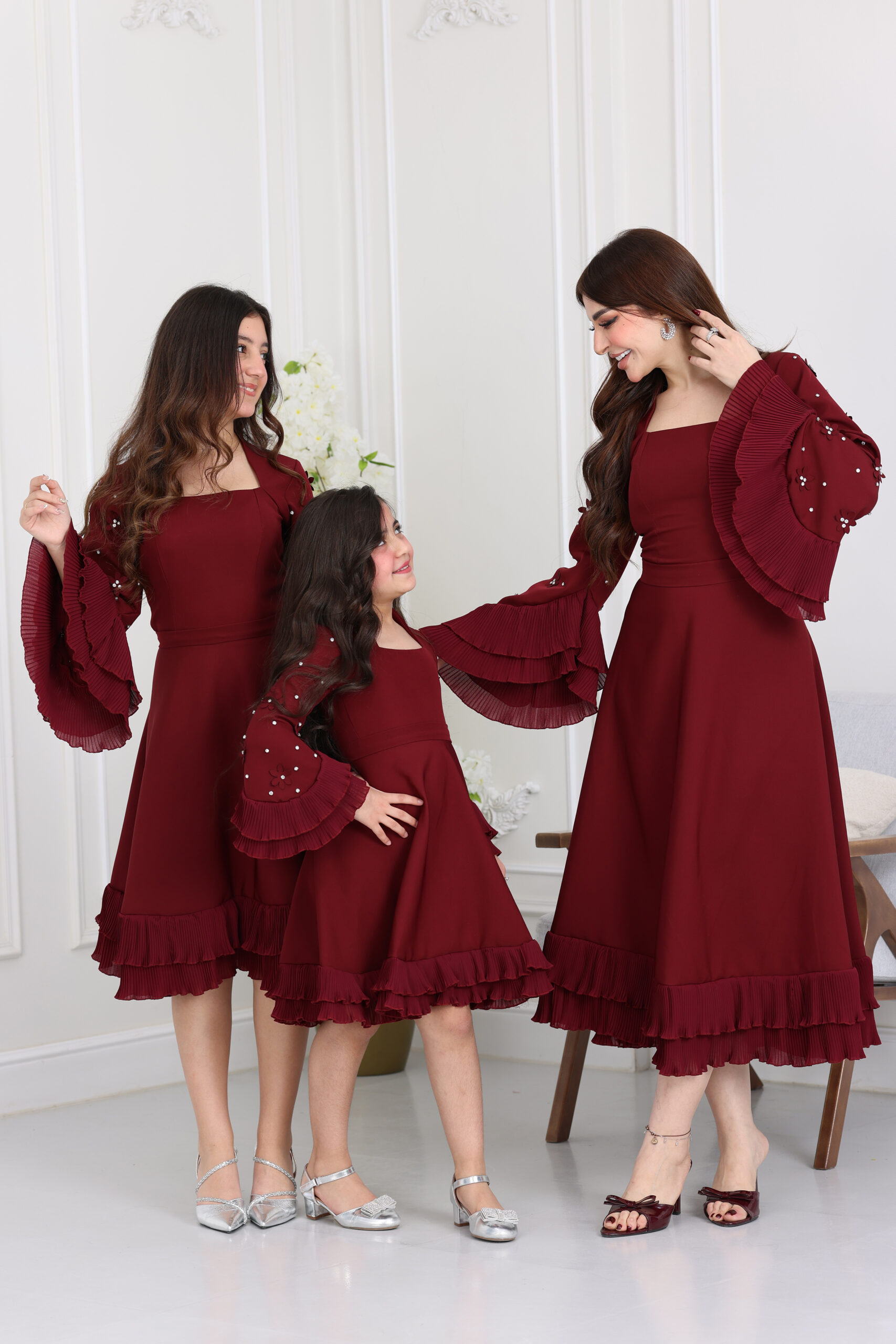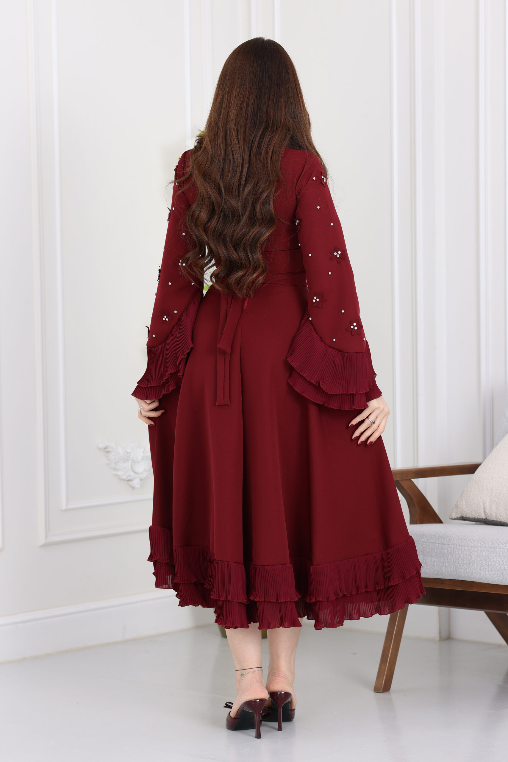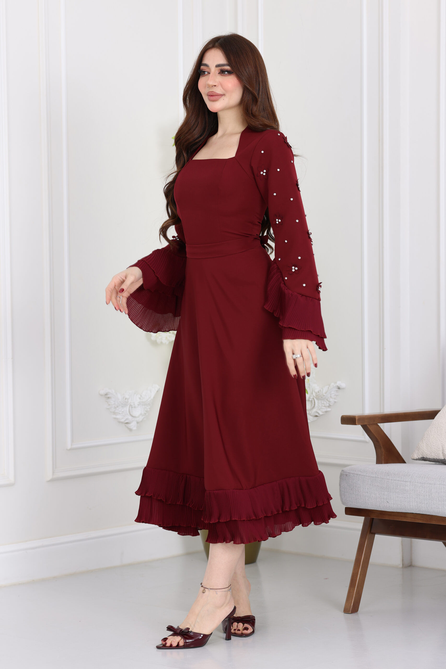 يتميز هذا الفستان بقصة “ميدي” كلاسيكية تبرز جمال القوام بأسلوب راقي ومحتشم. الياقة تأتي بتصميم مربع (Square Neck) يمنح الصدر والرقبة مظهراً أنيقاً وجذاباً. أكثر ما يميز الموديل هو الأكمام الطويلة التي تأتي بتصميم “بليسيه” أو كسرات ضيقة عند الأطراف، مع توزيع فني لزهور لؤلؤية بارزة وفصوص كريستال منثورة على كامل الأكمام والصدر تعطي بريقاً ساحراً. تنتهي التنورة بكشكشة ناعمة عند الحافة تمنح الفستان حركة انسيابية مذهلة مع كل خطوة، وبطول متوسط يجمع بين العصرية والفخامة.