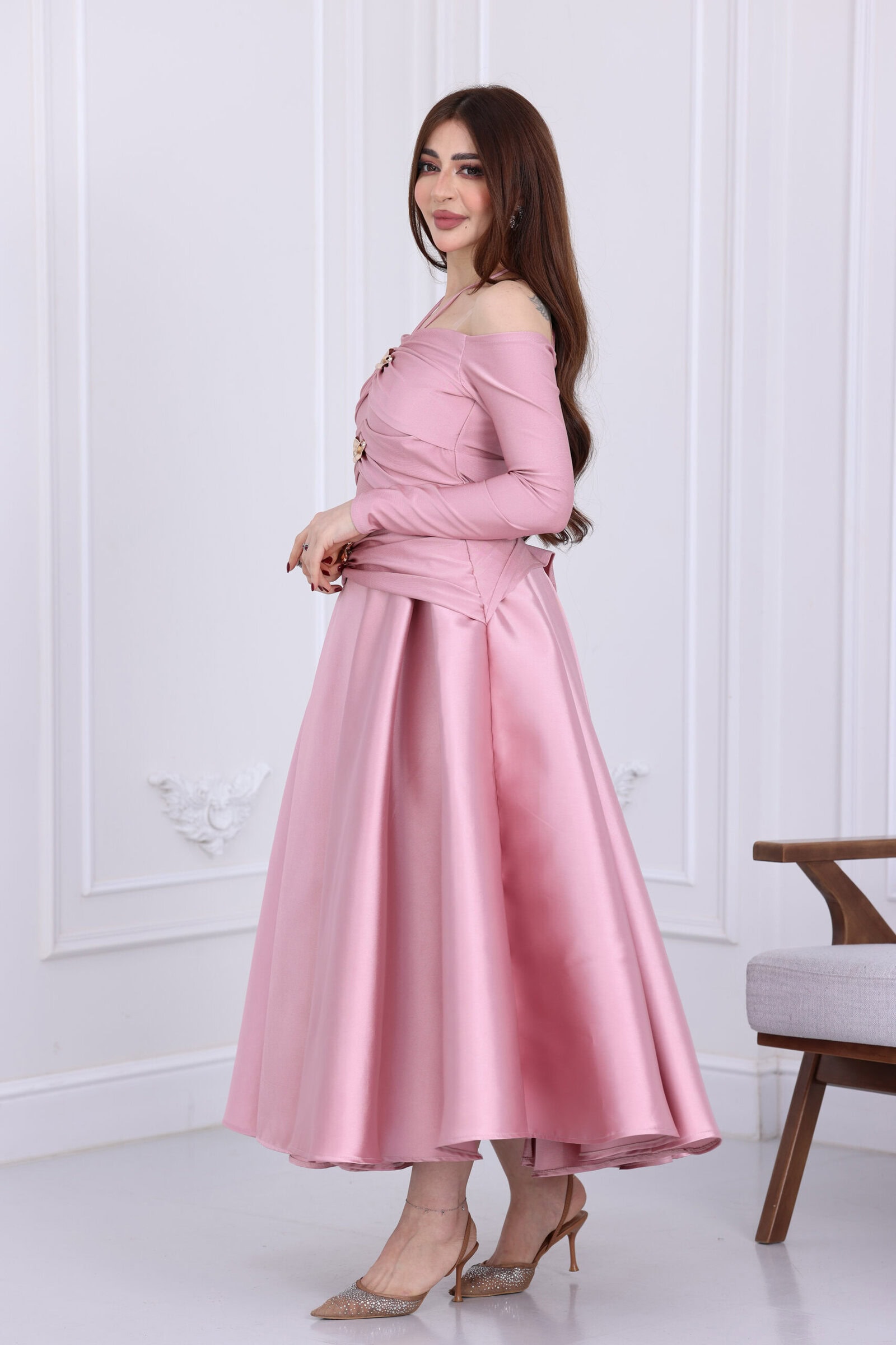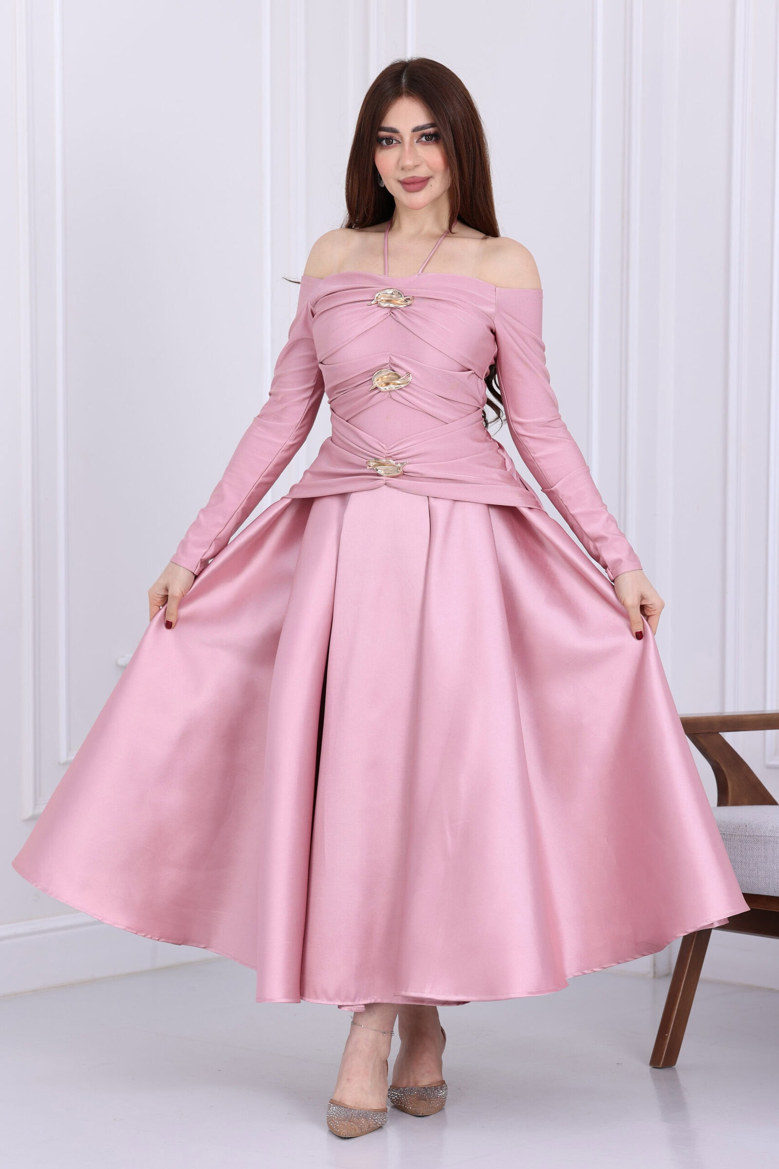 يتميز هذا الفستان بقصة “الأوف شولدر” العصرية التي تبرز جمال الأكتاف بأسلوب راقي، مع أكمام طويلة منسدلة تعطي طابعاً أنثوياً فخماً. الصدر والأكمام مصممة بأسلوب “الدرابيه” أو الكسرات اليدوية المتداخلة التي تمنح القوام رشاقة مذهلة، ومزينة بثلاث قطع معدنية ذهبية فاخرة على شكل أوراق شجر مرصعة بالكريستال، موزعة بانتظام لتعطي بريقاً ساحراً يغنيكِ عن ارتداء المجوهرات الكبيرة. التنورة تأتي بقصة “كلوش” واسعة تعطي حركة انسيابية ملكية مع كل خطوة، مع طول ميدي متناسق يجمع بين العملية وفخامة موديلات السهرة الكبرى.