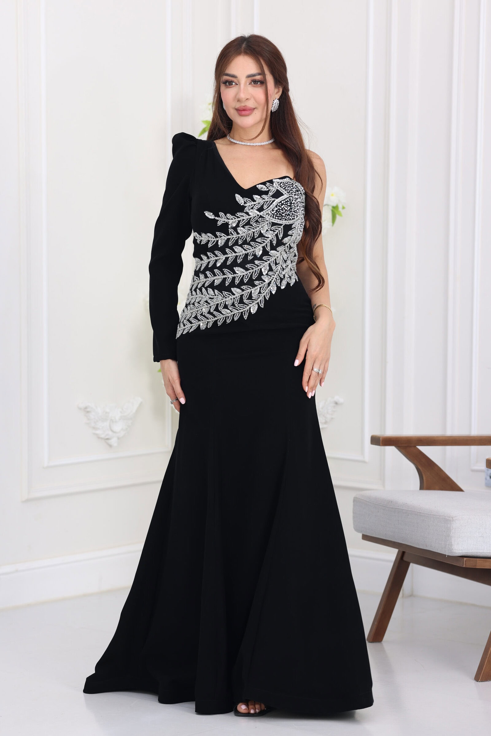 يتميز الفستان بقصة “الكتف الواحد” (One Shoulder) الجذابة التي تمنحكِ إطلالة متميزة ومختلفة، مع كم طويل مزين بـ “بف” خفيف عند الكتف لزيادة الهيبة والفخامة. يتألق الموديل بتطريز يدوي كثيف ومتقن بالخرز والكسرات الكريستالية التي تمتد بشكل قطري من الصدر وحتى الخصر، مما يعطي إيحاءً بالرشاقة الفائقة وينحت الخصر بجمالية، مع قصة سمكة انسيابية طويلة (ماكسي) تضمن لكِ طلّة ساحرة مع كل حركة.