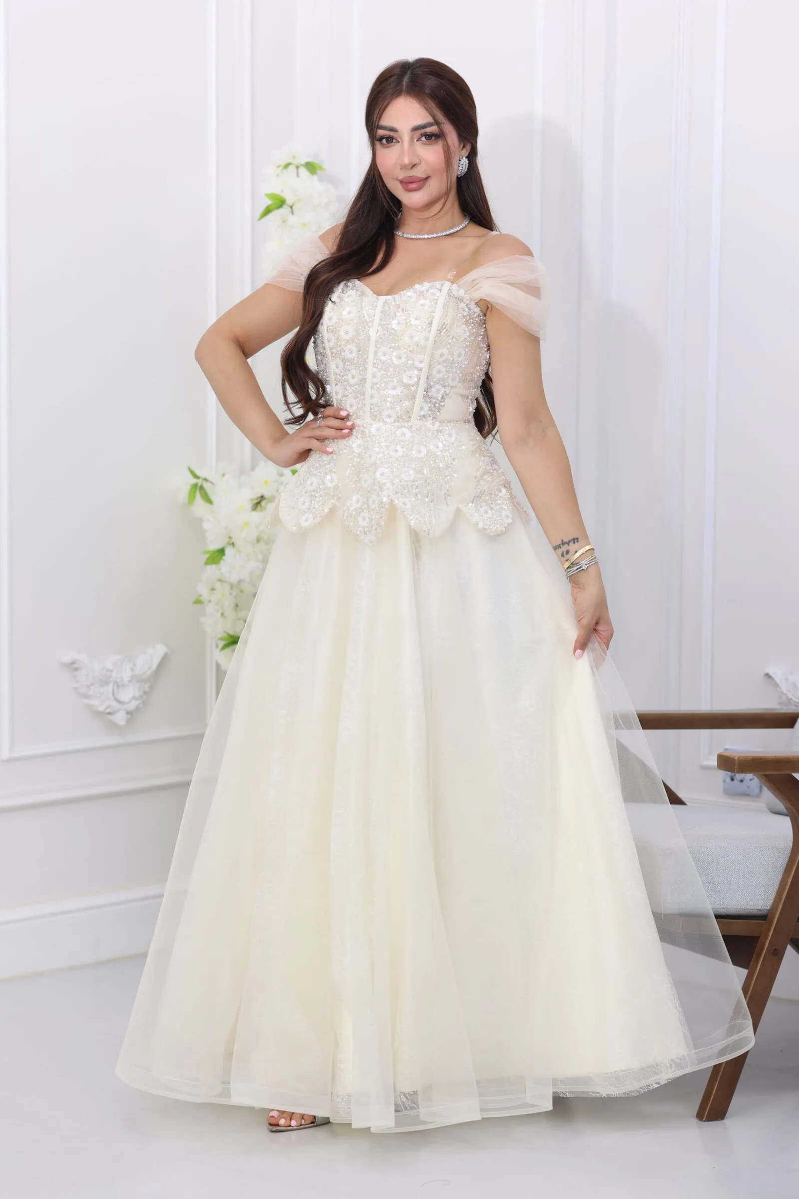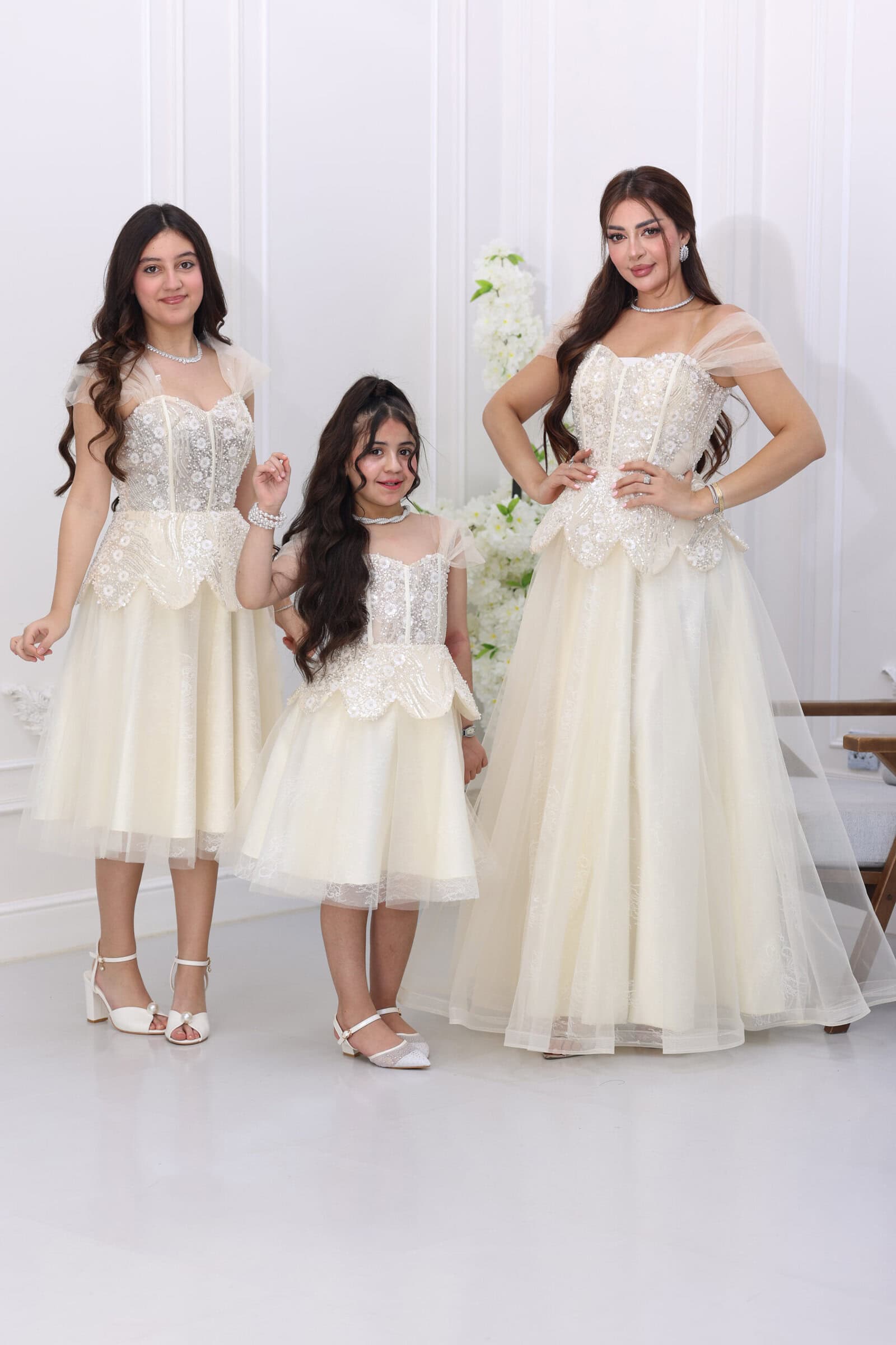 يتميز الفستان بقصة “كورسيه” تبرز جمال الجسم مع لمسات فنية من الشك اليدوي الفاخر والخرز المتداخل اللي يعطي لمعة ساحرة تحت الإضاءة. الأكمام مصممة بأسلوب “أوف شولدر” من الشيفون الناعم تعطي طابع ملكي، مع تنورة منفوشة بطول ميدي (Midi) تعطي سهولة في الحركة وتخليك أنتِ وأميرتك الصغيرة تتألقون في كل خطوة، مع لمسة “البيبلوم” على الخصر اللي تضيف فخامة استثنائية للتصميم.