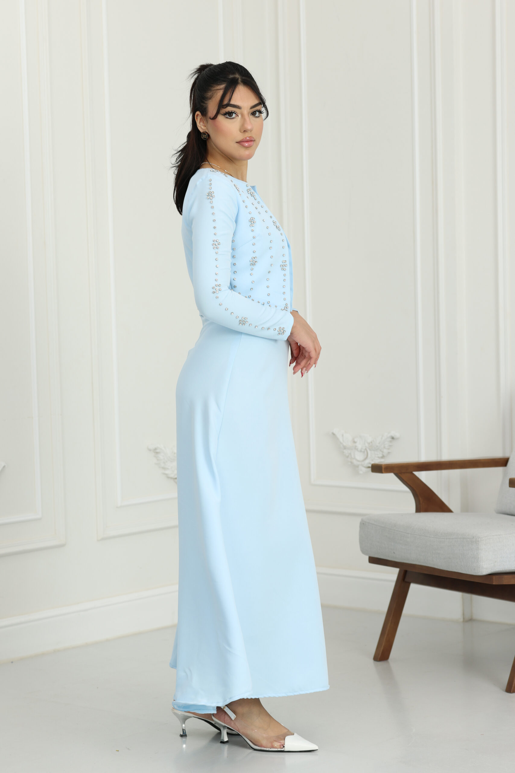 يتميز الفستان بقصة كلاسيكية راقية تنساب بنعومة على الجسم، مع أكمام طويلة من الدانتيل الشفاف المنقوش التي تنتهي بزمّة ناعمة تعطي طابعاً ملكياً. يتزين الفستان من الأمام بياقة أنيقة على شكل حرف V تتوسطها أزرار لؤلؤية كبيرة ومميزة تضفي لمسة من الفخامة التقليدية بأسلوب مودرن جذاب. طول الفستان ماكسي يمنحكِ هيبة ووقار، ويأتي مع حزام خصر يحدد القوام بجمالية فائقة، ويتوفر منه مقاسات متطابقة للأم والبنت لطلة “توينز” مثالية للصور والذكريات الجميلة.